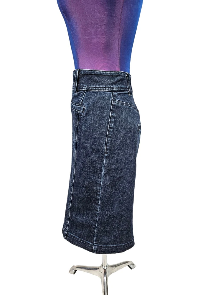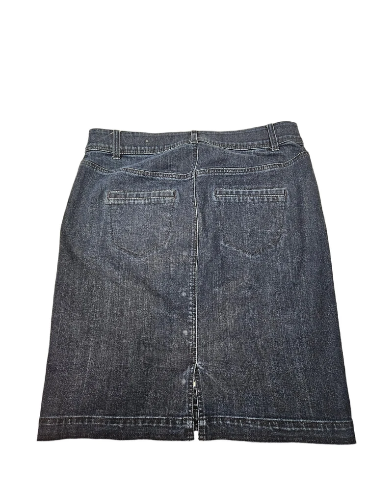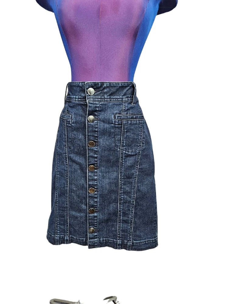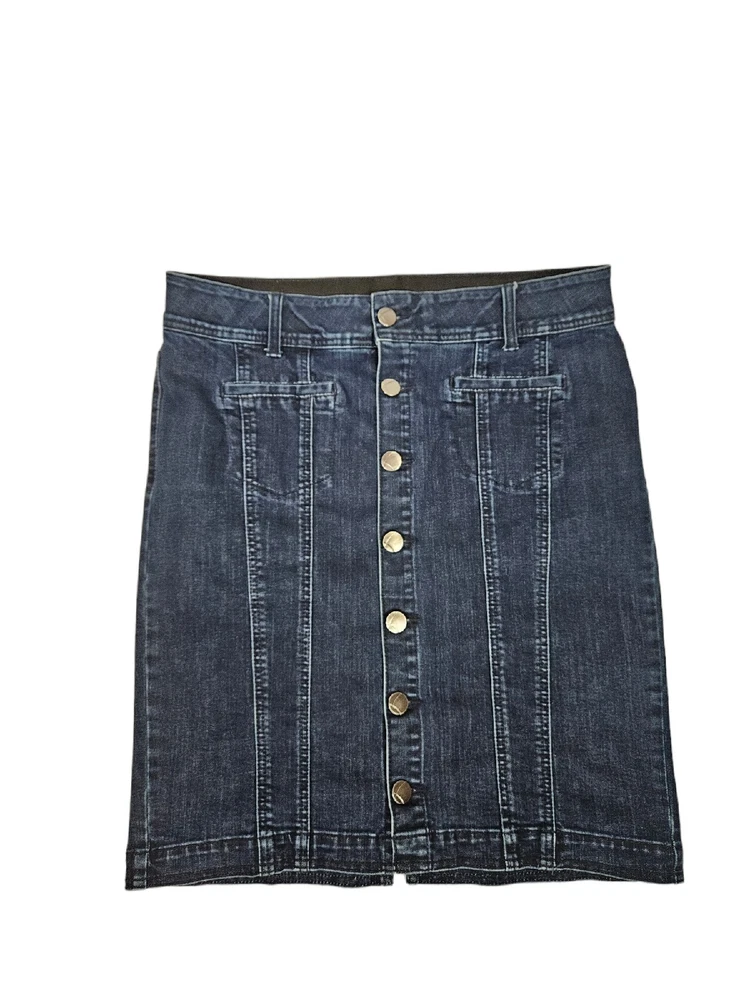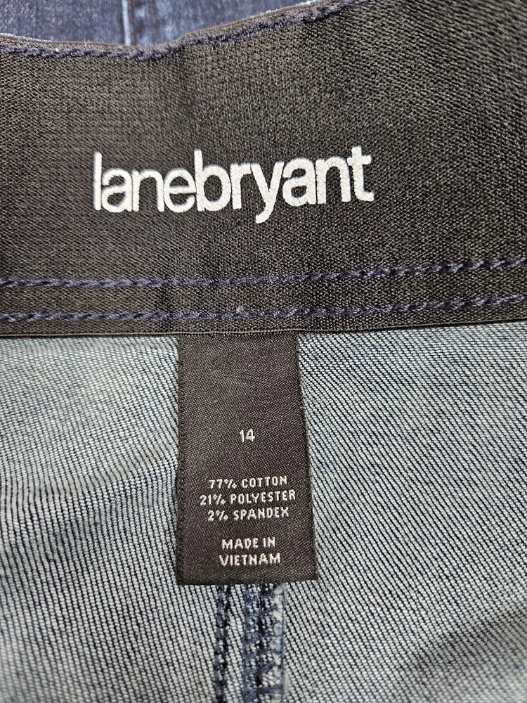 Lane Bryant Dark Wash Denim Button Front Midi Jean Skirt Size 14 Women's H26. In excellent condition Lane Bryant Dark Wash Denim Button Front Midi Jean Skirt Size 14 Women's. Features dark wash denim, button front, midi jean skirt, 4 faux pockets, front exposed seams, back slit, interior elastic waistband, belt loops. Measurements laying flat waist 17.5" hips 20" length 22" Fabric cotton, polyester, spandex This is a pre-owned item that may show signs of wear. In excellent condition, no flaws.