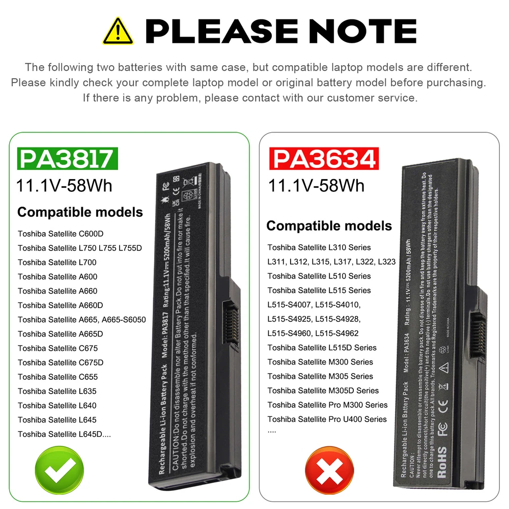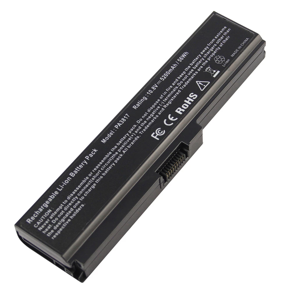 Specification: Battery type: Li-ion Voltage: 11.1V (Compatible with 10.8V) Capacity: 5200mAh Cell:rge cycles: 500 Operation time: Around 2-3 hours Compatible Models: ( Ctrl + F for fast search ur laptop model) Satellite C600D Satellite L750 Satellite L700 Satellite C675 Satellite A660 Satellite A660D Satellite A665 Satellite C675D Satellite L630 Satellite L635 Satellite L640 Satellite L645 Satellite L645D Satellite L650 Satellite L655 Satellite L655D Satellite L670 Satellite L670D Satellite L675 Satellite L675D Satellite L730 Satellite L735 Satellite L735D Satellite L740 Satellite L745 Satellite L745D Satellite L750 Satellite L750D Satellite L770 Satellite L770D Satellite L775 Satellite L775D Satellite M640 Satellite M645 Satellite P740 Satellite P740D Satellite P745 Satellite P745D Satellite P750 Satellite P750D Satellite P755 Satellite P755D Satellite P770 Satellite P770D Satellite P775 and P775D Satellite Pro L630 L640 L670 recha Compatible Part Numbers: PA3817U-1BAS PA3817U-1BRS