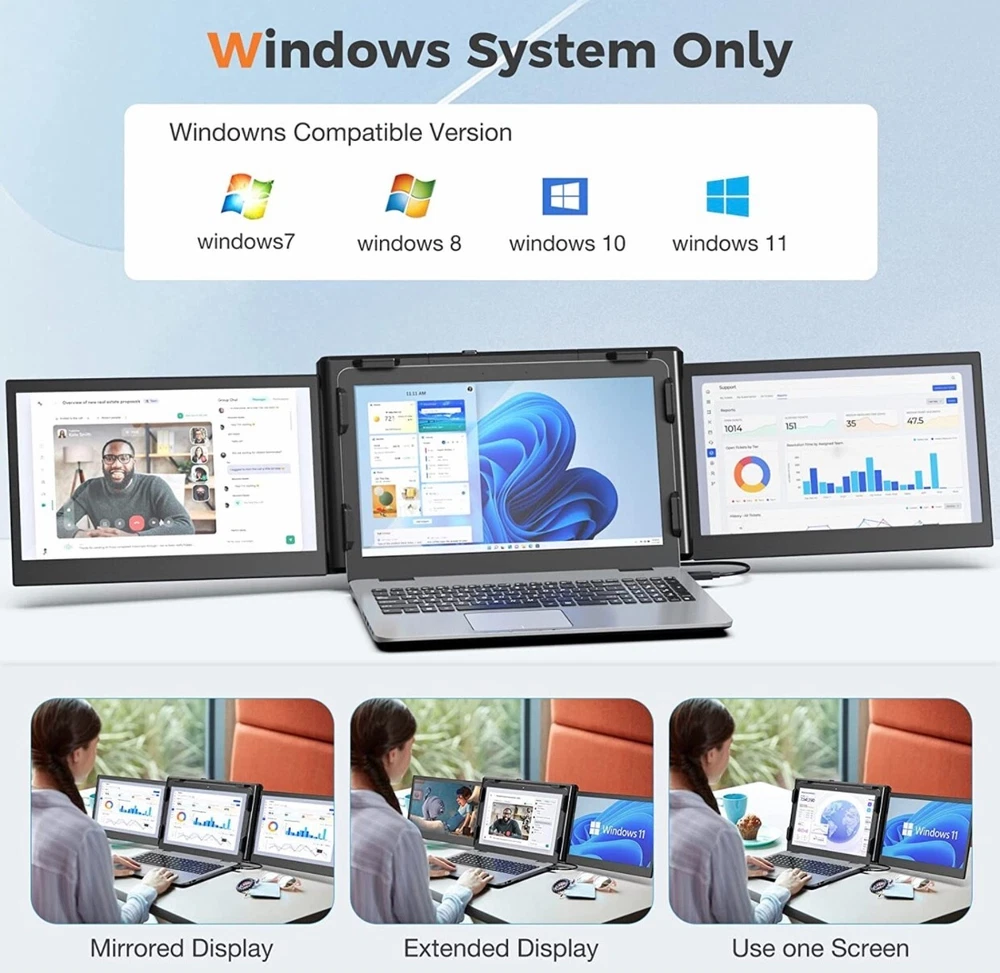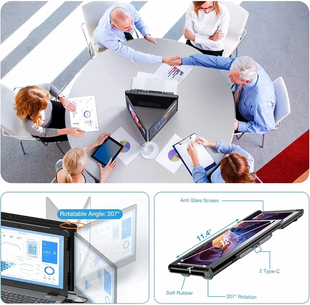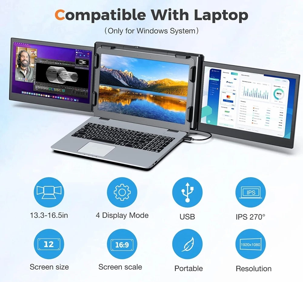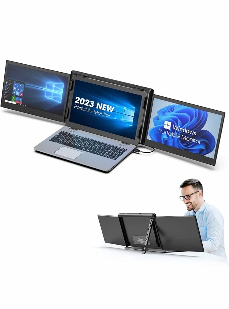 - Brand New - Never Used - Questions: Feel free to ask any Questions - BOX: Never Opened - DESCRIPTION: • 【2023 New Upgrade Version】 Are you still troubled by frequent page switching? KWUMSY triple screen laptop monitor will increase your office efficiency by 300%. This dual-screen monitor supports extenders to your laptop and gets two additional screens at the same time, which means you can work on spreadsheets, video conferencing, stock analysis, gaming, and more at the same time. Enjoying three screens individually or simultaneously. * 【Increase Viewing Comfort】KWUMSY portable laptop monitor is equipped with a high-quality 12-inch full HD 1080P IPS panel, with excellent viewing angle and eye protection features, with a blue light filter, anti-glare technology and brightness-adjustable function to prevent long-term eye fatigue, and also for users Provides a rich and colourful visual experience. * 【WINDOWS SYSTEM LAPTOP】 Designed for Windows systems, to support 13.3-16.5 inch laptops (diagonal length). 1 screen to 3 screens, easy to achieve 3 screens with mirrored and extended mode. At the same time, either side of the screen can be turned off, and only one of the screens can be used. Besides, this monitor can be folded which is super easy to carry and fits easily into briefcases, and backpacks. * 【Multi-display Mode】 Designed for multi-using scenarios, the full 207°rotation and 180°display mode can achieve multi-person meeting by same-screen sharing, And there are multiple display modes, including landscape, portrait, presentation, kickstand and eye-care modes. Portable triple monitor for laptop has an adjustable scalable bracket to keep stability, avoid screen shaking, instability and tilting when using the display. - OFFERS: Reasonable offers are considered, LOWBALLERS, Best price and Lowest askers will be ignored - all sales final/no refunds/ no exchanges/ no returns - Disclaimer: I do not own the brand's trademarks, logos, pictures, or products posted. I do not intend to infringe on copyright. I find such content available on the internet. Contents are considered fair use. -12'' Laptop Monitor Extender, Portable Monitor for Laptop, [2023] 1080P Full HD IPS Laptop Screen Extender, Plug and Play No Driver, for 13.3”-16.5” Laptop (P2S-Windows)