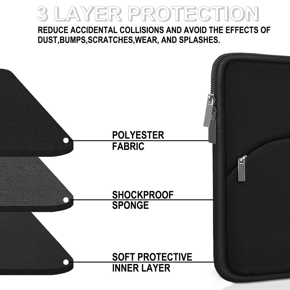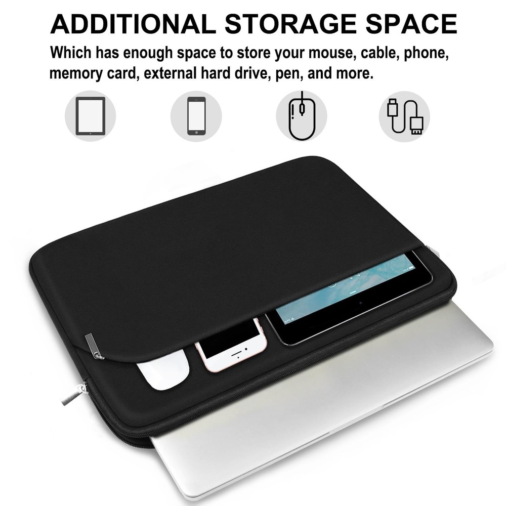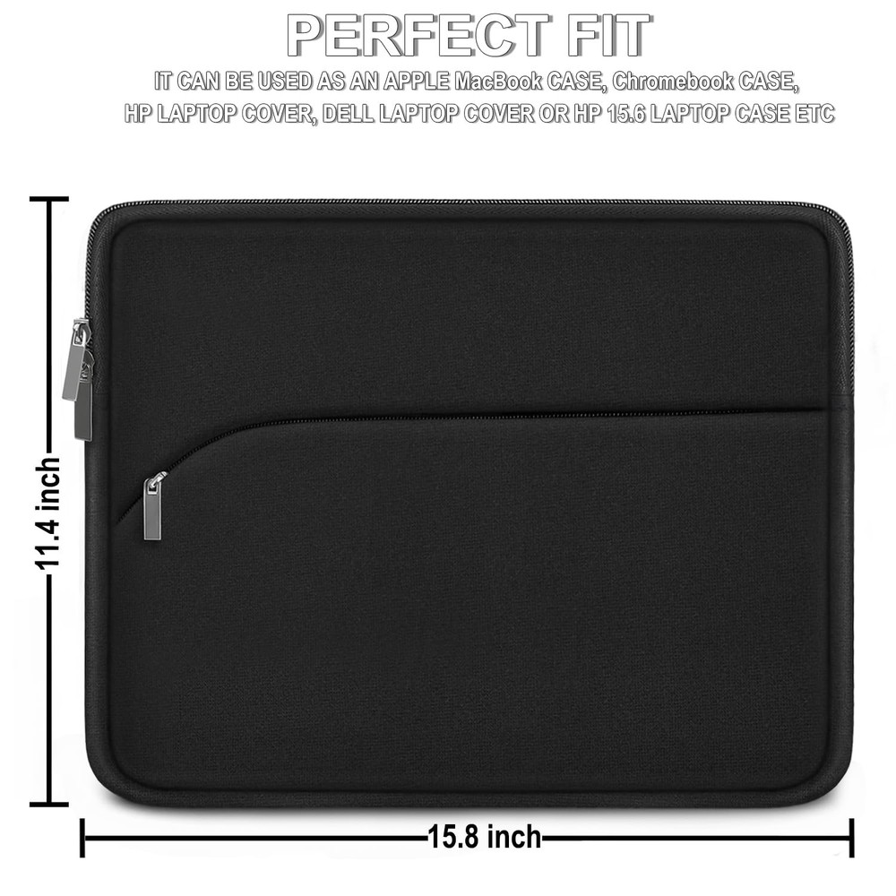 Laptop Sleeve Case 15.6 inch, Durable Portable Monitor Black Product Details ✔PERFECT FIT: External Dimensions: 15.8”x11.4”x1”. Internal Dimensions: 15”x10.7”x0.8”. Our This laptop sleeve is suitable for all 15 15.4 15.6 16 inch laptops. It can be used as an Apple MacBook case, Chromebook case, HP laptop cover, Dell laptop cover or HP 15.6 laptop case Etc. ✔COMPATIBILITY: This 15.6-inch laptop case is compatible with MacBook Pro 15 16, HP ENVY 15.6 or 16/HP Spectre X360 16/ Elitebook, Dell XPS 15/Inspiron 15/Vostro 15.6/Precision 15.6, 15.6 Inch Acer Aspire 5/Nitro 5, Acer Aspire 3/5/7 15.6, Asus Zenbook Pro 15.6, Lenovo ThinkPad 15/IdeaPad 15/Yoga 16, and fits more other similar size notebook. ✔ADDITIONAL STORAGE SPACE: This laptop comes with an external pocket on its sleeve, which has enough space to store your mouse, cable, phone, memory card, external hard drive, pen, and more. The zipper slides smoothly, making it easy to access the laptop. It is perfect for anyone who wants a 15-15.6 inch laptop case. ✔SOFT AND PROTECTIVE: Premium thickened water-resistant neoprene material offers a ultra slim lightweight design and superior protection to protect laptop/notebook from dust, bumps, scratches, scuffs and spills.