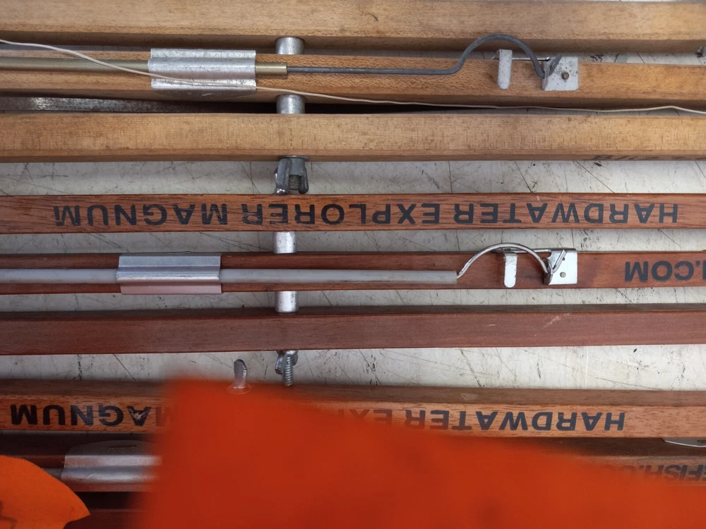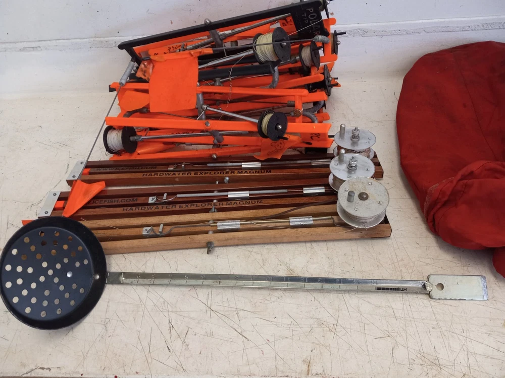 Very good condition. 13 Polar tip ups, 3 Hard Water Explorer tip ups, ice scoop and large pack basket Another Bygone Antiques great find! Inventory No. 20JB-102424 BEST OFFER OPTION: Many of my listings have a Best Offer option and I am happy to respond to reasonable offers. Please be advised that while I am considering your offer, others may make higher offers or even Buy It Now at full price. If this is a rare, unique, highly sought after, "HOT" item and you don't want to lose out, your best choice is to Buy It Now at the full price. SHIPPING OPTIONS: I have listed several shipping options. The least costly is not always the first one up. Please check the details to get the best price.