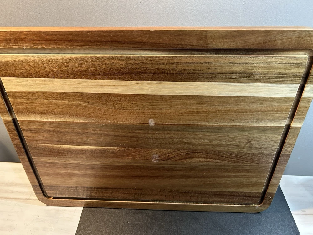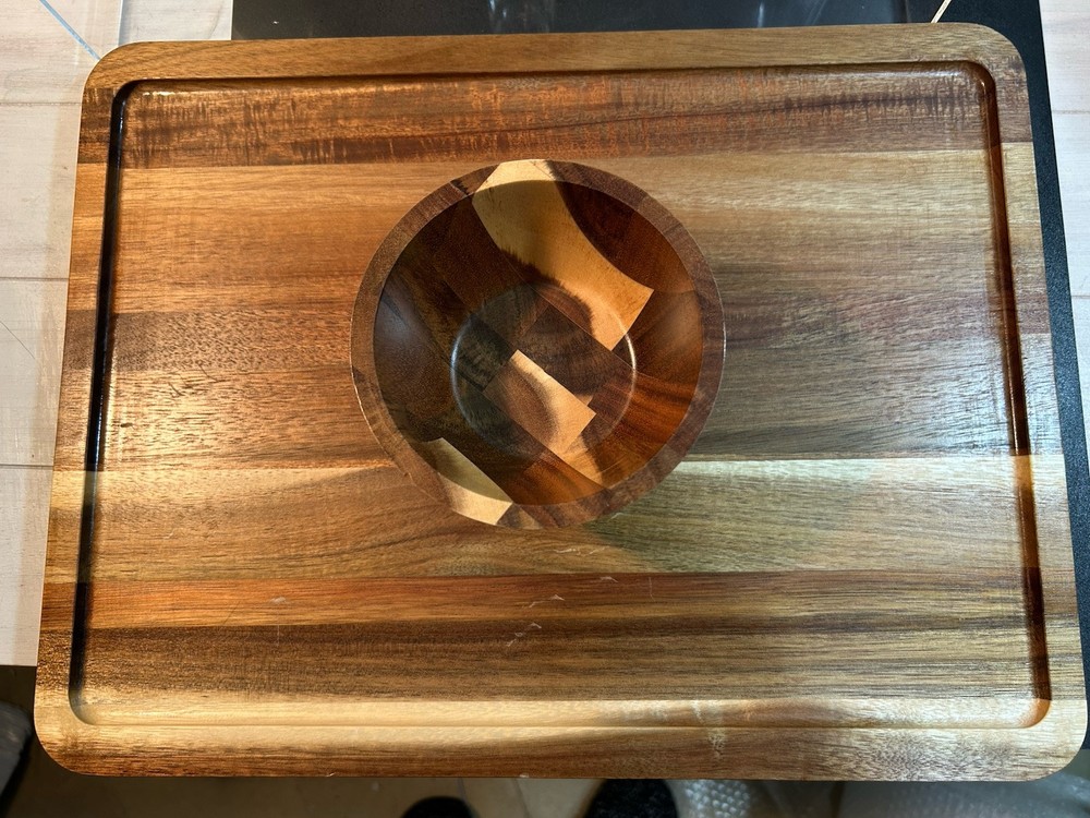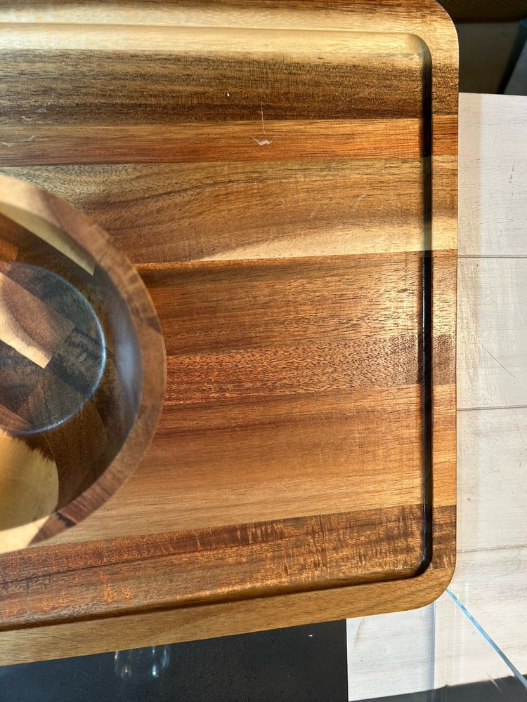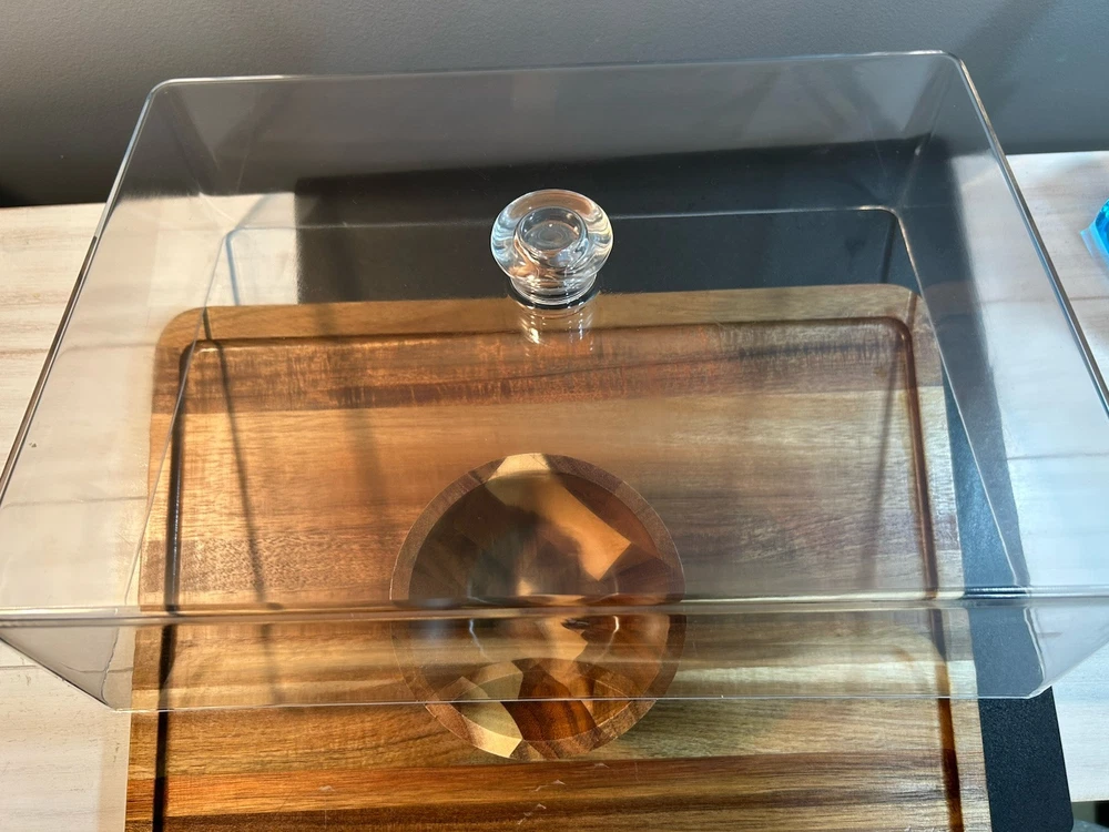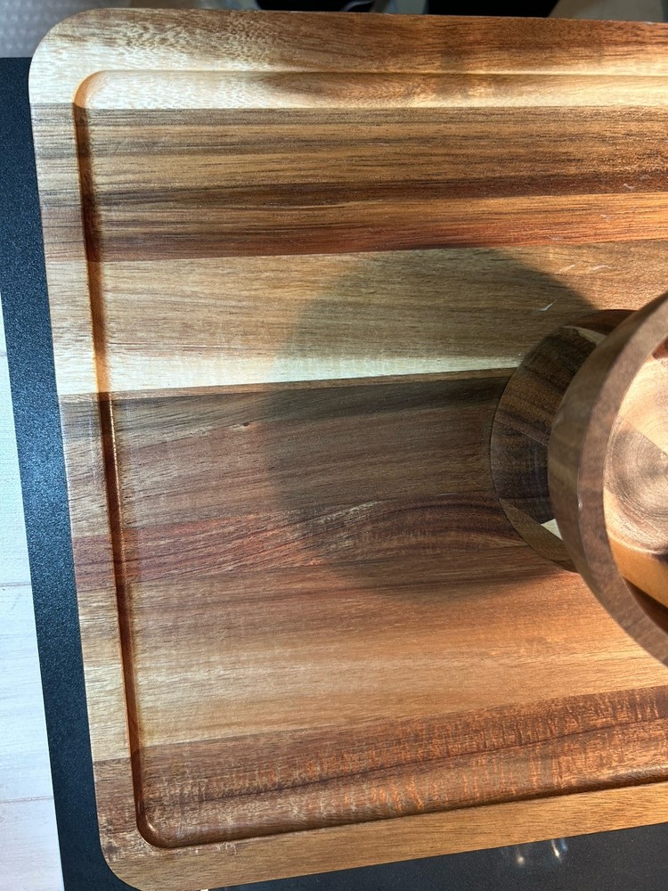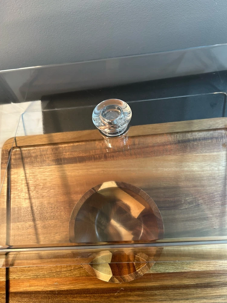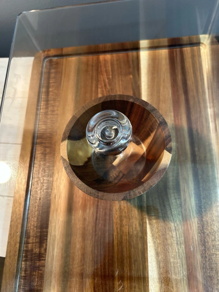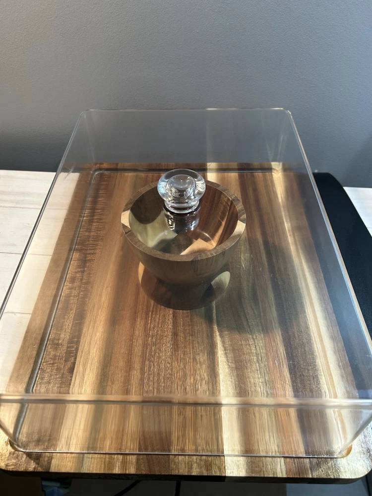 Large acacia wood Food Tray, Charcuterie Board With Dip Bowl And Acrylic Cover . Beautiful item in excellent condition. Board measures 17 inches long , 12.75 wide. Bowl is stationary and measures 3.5 inches tall, 5 wide, and 2.25 deep. The cover is 4 inches tall, 15.25 long and 11 wide.