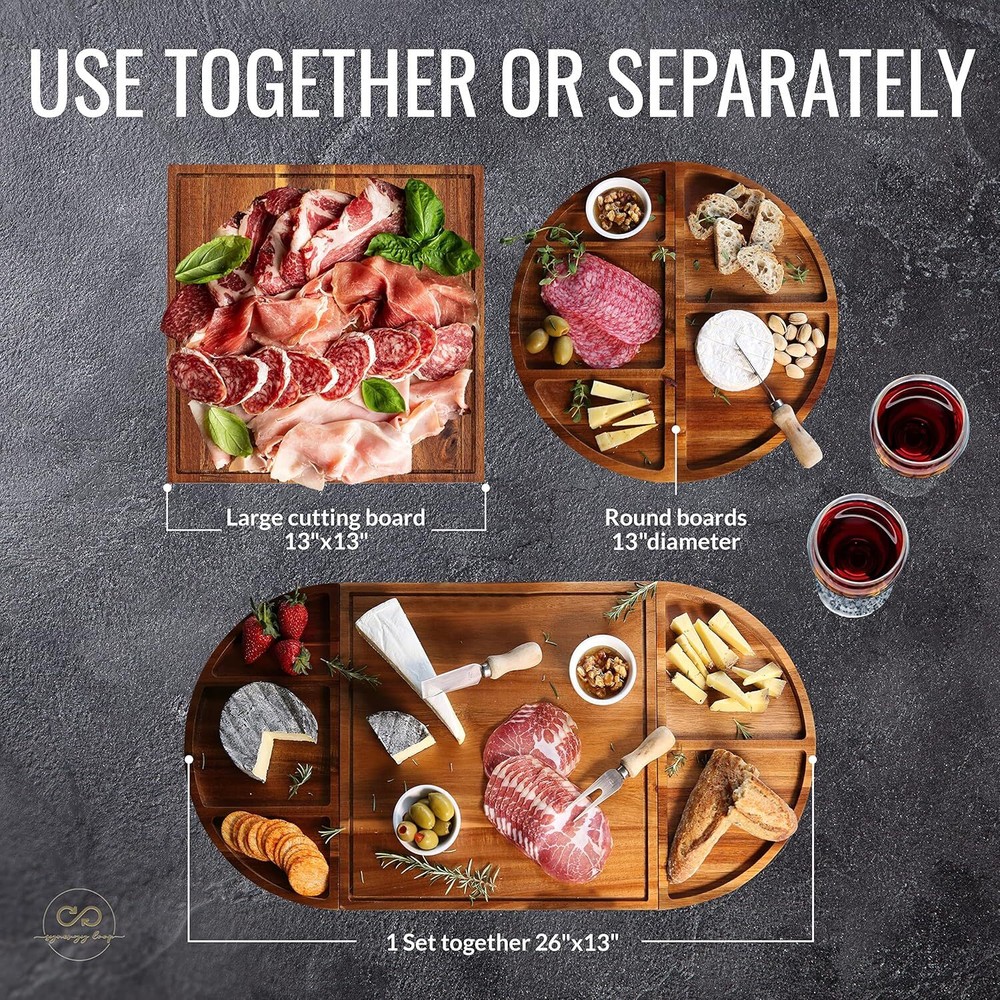 Extra Large Charcuterie Board Serving Platter: Perfect for serving your guests a variety of snacks and appetizers with the added bonus of convenience and style. Strong magnets create a personalized charcuterie board extra large. Just remember, it's not meant to be lifted. Grazing Board Delight: Enjoy endless possibilities of creative and delicious food combinations. A 13" square cutting board with juice groove and two halves round boards with rim set to create a 26" long wooden board that's perfect for serving food Entertain in Style: Impress your friends and family with this eye-catching large charcuterie board set to bring any gathering to life. Quality & Durability: Crafted from Premium Acacia wood, this cheese board set is built to last as you serve up cheeses, fruits, meats, olives, and more. Naturally scratch and crack-resistant, durable, and easy to clean. Travel and storage bag: It's convenient, stylish, and perfect for antipasto serving platters, cheese boards, or complete food boards. Whether you're entertaining guests or having a family gathering, our magnetic boards will elevate your charcuterie game!