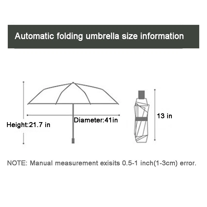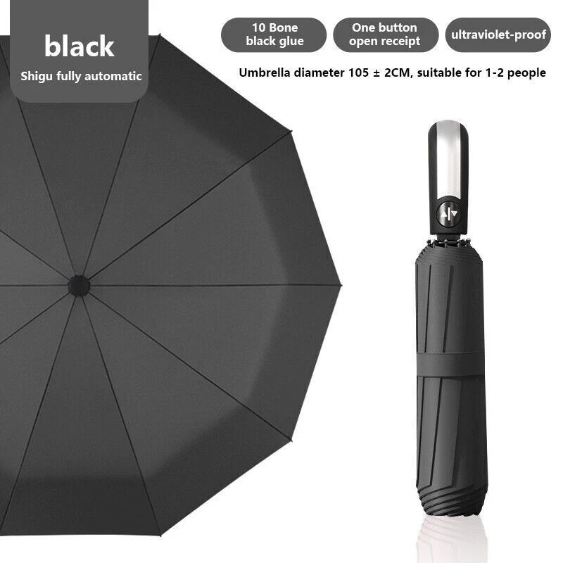 Automatic Open & Close Foldable Umbrella Wind Resistant Compact Umbrella 10 Ribs Small Portable Umbrella Stormproof for Rain Features: 1.Sturdy and Windproof: Experience the unbeatable wind resistance of our travel umbrella. Designed with strengthened umbrella ribs, this umbrella is built to last and offers exceptional durability. It effectively withstands strong winds, providing reliable protection even in challenging weather conditions. Enjoy the confidence and peace of mind that comes with owning a sturdy and windproof travel umbrella that can stand up to the elements. 2.Quick-Drying Canopy: Our folding umbrella features a canopy made of impact fabric with lotus leaf effect, ensuring quick drying and water repellency. With just a single shake, the folding umbrella instantly dries off, preventing water from adhering to the surface. Stay dry and comfortable, even during sudden showers, as the canopy efficiently repels water, keeping you sheltered without the hassle of a wet umbrella. 3.Fully Automatic Operation: Embrace the convenience of our foldable umbrella, designed for effortless operation. With just one press of a button, the umbrella opens and closes smoothly, making it easy to deploy or stow away. No more struggling with manual mechanisms or getting caught in the rain while fumbling to open your umbrella. Enjoy the simplicity and ease of using our foldable umbrella, allowing you to stay protected with minimal effort. 4.Compact and Lightweight: Our compact umbrella is not only functional but also highly portable. It folds down into a compact size, making it convenient to carry and store in your bag, backpack, or car. The lightweight design adds to its portability, ensuring that you can take it with you wherever you go. Stay prepared for unexpected rain or sun with our compact umbrella, always ready to provide shade or shelter at a moment's notice. 5.Reinforced Double Canopy: Discover the added strength and durability of our double-layered canopy design. The reinforced double canopy structure enhances the small portable umbrella's resistance to strong winds, offering extra stability during storms. This innovative design combines functionality with style, making our small portable umbrella a reliable and fashionable accessory for any occasion. Embrace the benefits of a reinforced double canopy umbrella that provides both protection and elegance. Specification: Origin: Mainland China Umbrella Fabric Material: Impact Cloth Umbrella Handle Material: Rubber Umbrella Cloth Density: 210t Number Of Umbrella Bones: Ten Umbrella Material: Black Gold (Iron) Opening And Closing Mode: Automatic Suitable Number: 1~3 People Weight: 420 Grams Size: Under The Umbrella Diameter 105cm, Open Height 65cm, Close Height 33cm Product Size: 1050.00 X1050.00 X650.00 mm / 41.34 X41.34 X25.59 inch Note: Due to the different monitor and light effect, the actual color of the item might be slightly different from the color showed on the pictures. Thank you! Please allow 1-2cm measuring deviation due to manual measurement.