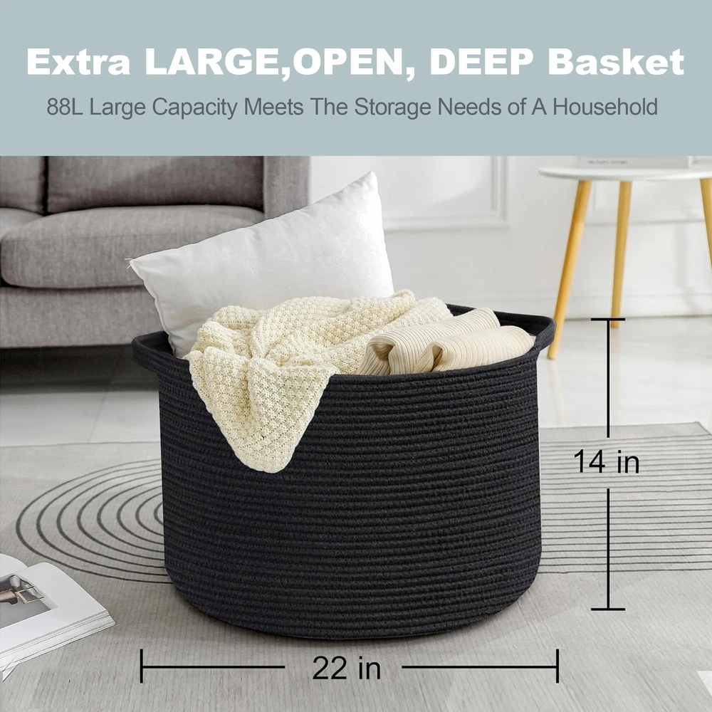 EXTRA LARGE BASKET: 22x22x14 inches XXXL baskets for the blanket. Big and deep enough to hold a couple of pillows and throw blankets. A good blanket storage solution in the living room ensures your throws, quilts, and blankets are within easy reach. 88L toy organizers and storage are great for storing ' toys like trucks, dolls, and Legos in the nursery. SOFT COTTON ROPE BASKET: The black basket is braided from natural cotton rope, making it a super soft but sturdy, textured bin. The rope basket for storage is huge and doesn't have a smell at all. Woven rope baskets with no hard edges are safe for your allowing them to climb into these wick basket and won't scratches or damage the floors. MULTIPLE USE BASKETS FOR ORGANIZING: The huge open size basket can be used for storing decorative bed pillows in the corner of the bedroom, or in the living room for extra couch blankets and pillows. Perfect size storage basket for nursery or 's room to hold toys or stuffed animals. Add a bathroom decor for towel basket storage. Even as a laundry basket hamper to fit baby's dirty clothes. NEUTRAL COLORS STYLISH WOVEN BASKET: The neutral-toned storage bin will look great in any laundry room, bedroom, bathroom, or living room space and decor. A perfect compliment to boho, Scandinavian, farmhouse, modern, rustic, coastal, classic vintage, and room decoration. STRUDY HANDLE STORAGE BASKET: The large storage basket feature built-in sturdy handles. The portable round shape and xxl size make storage and transportation simple. Hand or machine washable basket that can fold flat so you can use it as a laundry basket when outside.