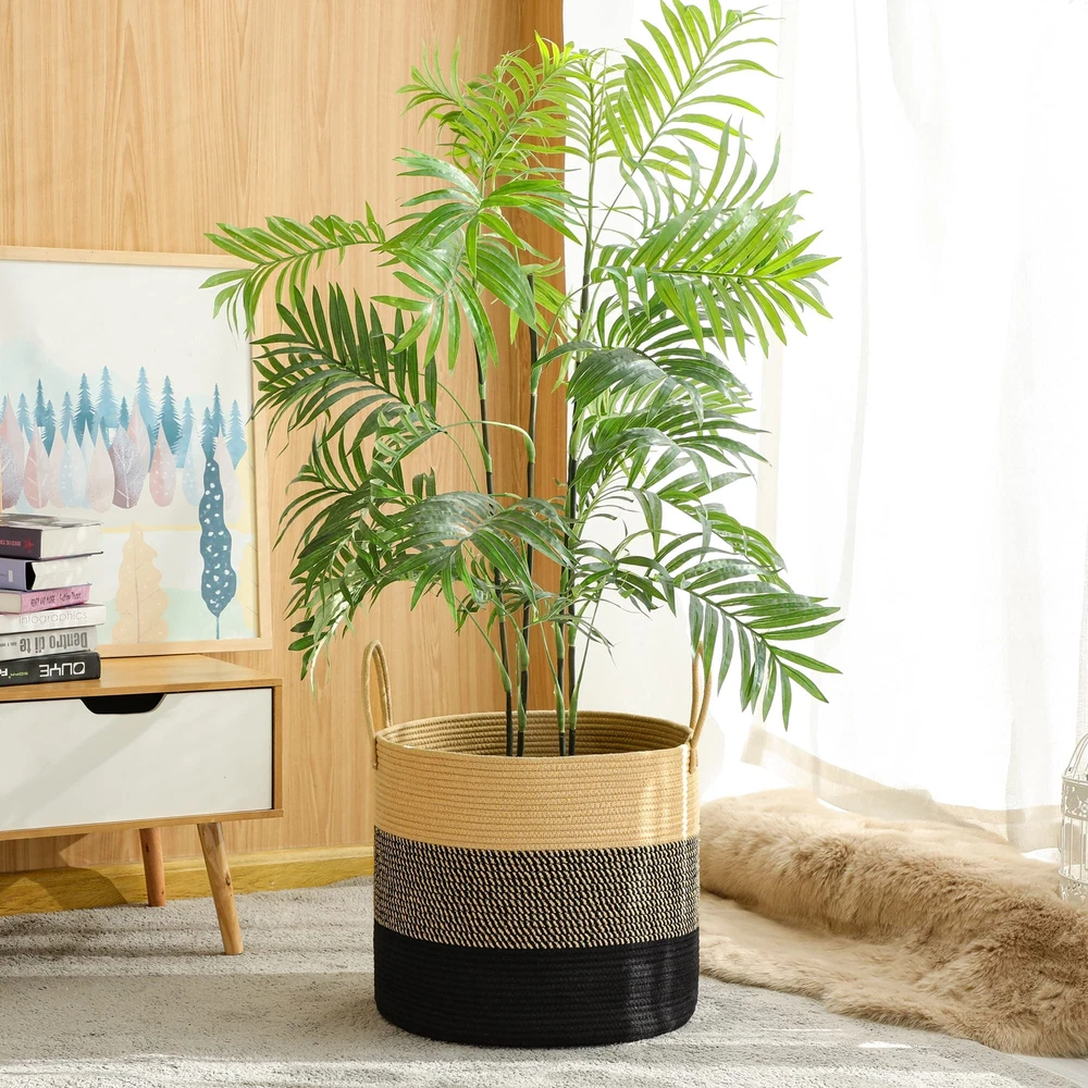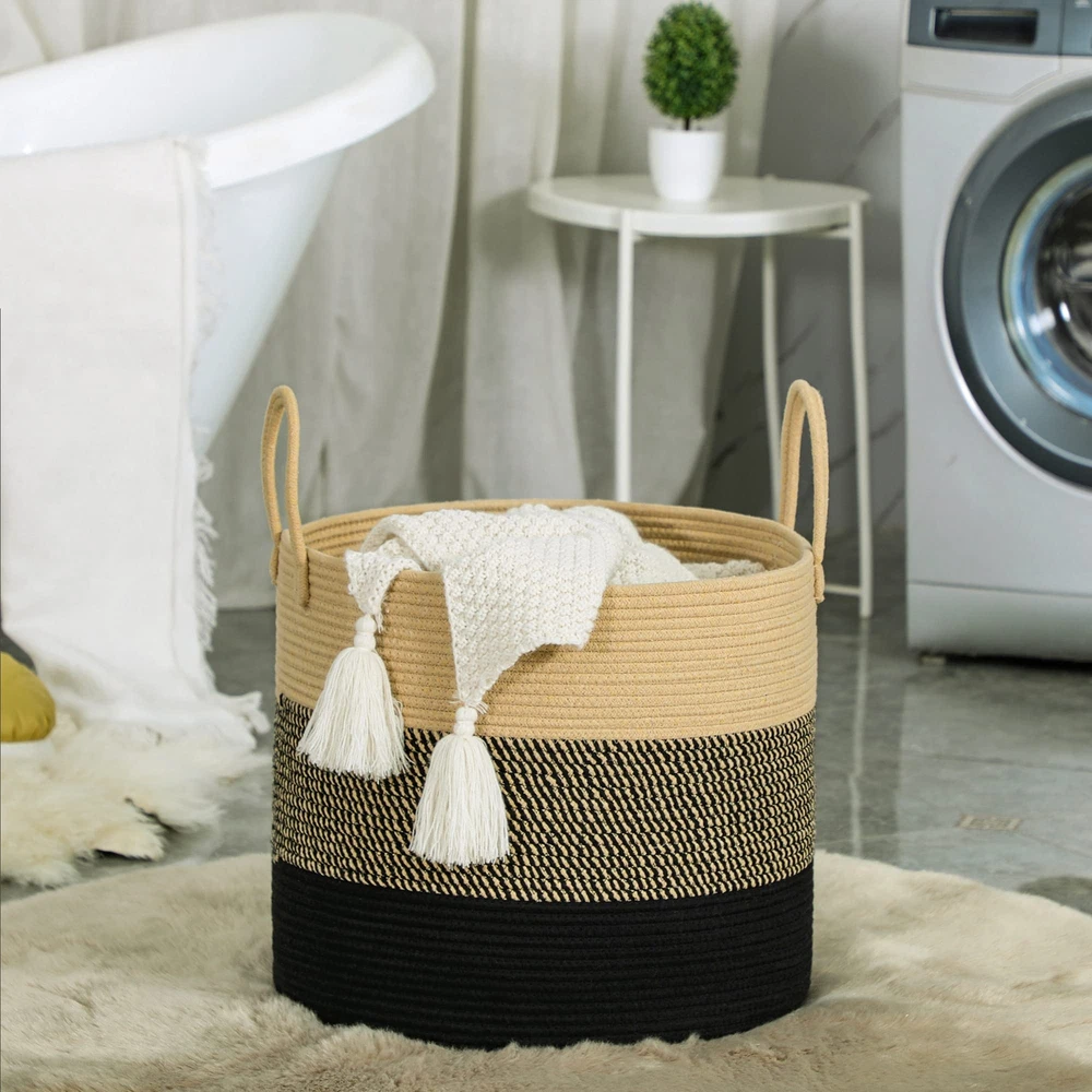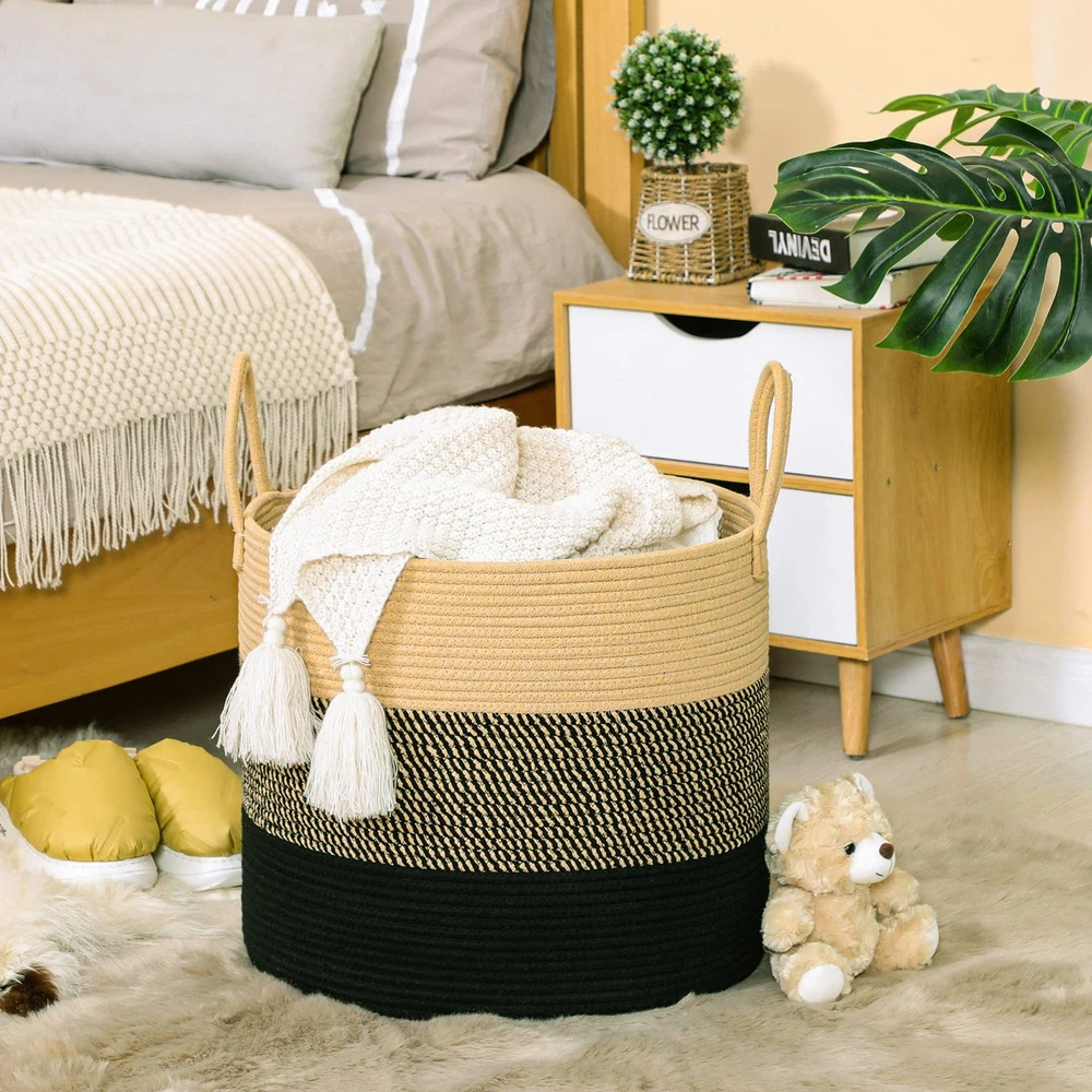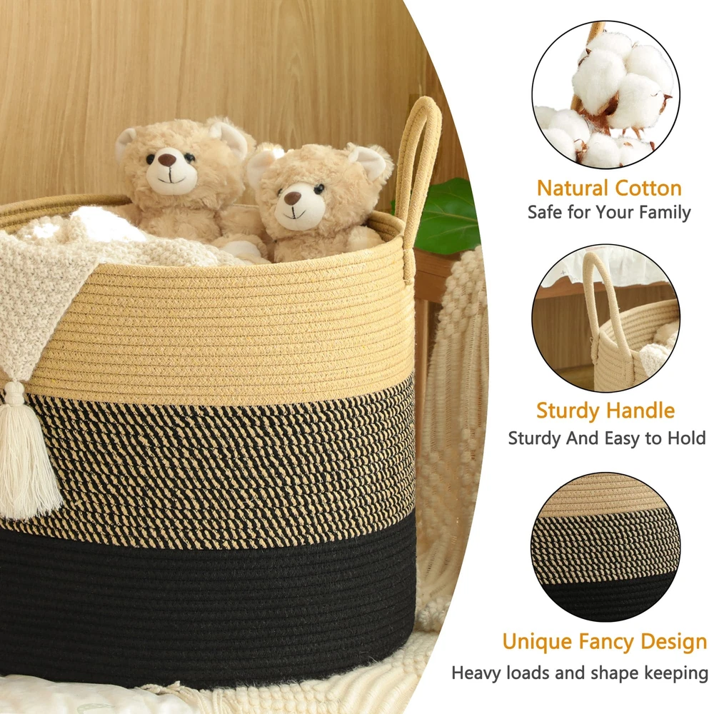⭐【100% NATURAL HANDMADE】:100% cotton rope,soft material without any chemicals woven basket. There are No plastics. No harsh chemicals. Our basket is soft and safe for kids and pets.our rope baskets are super durable and hold their shape well. they can be hand washed / air dried or put in your washer / dryer on delicate. ⭐【LARGE SIZE】: 18"x18"x16",which is a perfect storage basket in living room for blankets, throw pillows, comforter or cushions,blankets, baby diapers or toys. Use for toy storage orgainzation, toy basket, throw basket, laundry basket, etc. to keep your living space neat and tidy! ⭐【MULTI-PURPOSE STORAGE】:Decorative Basket is a new stylish alternative for all of your storage needs and it fits perfect with any kind of Home Decor. nothing will be lying around when you have our woven baskets in your home. Designed in subtle colors, this nursery organizer basket is too pretty to keep inside. ⭐【PORTABLE,STURDY&FOLDABLE】:Soft and firm basket, no collision scratches, perfect to accommodate baby's clothes and other toys in nursery. A great laundry storage basket that will last for years of continuous use. Rope will not separate, fray, or fall apart. We use highest grade materials and construction. You can feel and see the impressive difference the moment you receive it. ⭐【Note】: The basket comes in folded. It will return to its best shape if filling it up with towels or blankets. Fast removing the creases by ironing them. Washable: Hand washing or machine washing. When wash by machine, better place it in a laundry bag. Air-dry is better or you can dryer on a delicate cycle.