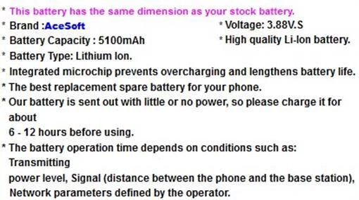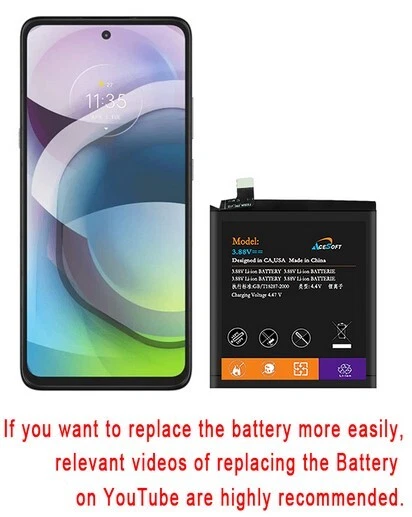 High Capacity Battery for Motorola One 5G Ace XT2113 Verizon/T-Mobile/AT&T/Metro by T-Mobile/Xfinity Mobile Cellphone 5100mAh Battery+Screwdriver Tool Set for Motorola One 5G Package includes: 1 x 5100mAh Li_ion Battery 15 x Screwdriver Tool Set Cellphone not included Compatible with: Motorola One 5G Ace XT2113 ( Verizon/T- Mobile Mobile/AT&T/Metro by T-Mobile/Xfinity Mobile ) * This package is specifically designed for Motorola One 5G model XT2113 from Verizon/T-Mobile/AT&T/Metro by T-Mobile/Xfinity Mobil as we stated in our listing. * There are many Motorola One in the market,they all use different battery. * If you do not have Motorola One 5G XT2113 , this package is not for you. Package Description High Power 5100mAh Li_ion Battery Quantity:1 * This battery has the same dimension as your stock battery. * Brand : AceSoft * Voltage: 3.88V.S * Battery Capacity : 5100mAh * High quality Li-Ion battery. * Battery Type: Lithium Ion. * Integrated microchip prevents overcharging and lengthens battery life. * The best replacement spare battery for your phone. * Our battery is sent out with little or no power, so please charge it for about 6 - 12 hours before using. * The battery operation time depends on conditions such as: Transmitting power level, Signal (distance between the phone and the base station), Network parameters defined by the operator. Screwdriver Tool Kit Quantity:15 Payment Terms Payment Terms We are an US based seller * We only accept PayPal payments. * On this item we do no combine shipping or have any other discounts. * We only ship to Paypal confirmed address. Please make sure your shipping address is updated. Sellers are not responsible for wrong shipping address. Please contact us for International orders outside of US. * If you pay by Paypal's e-check, we will ship your order once your payment is cleared. * To avoid an unpaid item dispute, all payments must be received within 7 days from the end of auction.