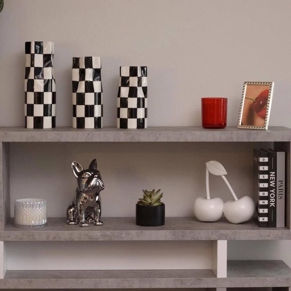 Large Checkered Vase, Modern Home Decor, Decorative 11" Tall, Product Details Material: Ceramic Color: Checkered Brand: Reimagine Discovery Product Dimensions: 3.75"L x 3.75"W x 11.25"H Shape: Oblong HAND PAINTED CERAMIC VASE: A traditional vase with a modern spin, our hand-painted black & white checkered vase will complement home decor and stand out across the rest of your room aesthetic. Our checkered vase is a tall cylinder vase with a squeezed look at the top that opens with a wide star-shaped mouth. Not only does this allow your vase to hold a large floral arrangement but it also helps fan your blooms and dried grasses beautifully. AESTHETIC HOME DECOR: Showcase timeless elegance that’s versatile enough to blend with decades of interior design trends. Display our checkered vases in your home office, bedroom or living room. Use them standalone depending on the size of your floral arrangement needs or pair in a set-of-3 for a gorgeous, explosive flower extravaganza. HOME DECOR GIFTS: Whether you’re shopping for yourself or looking for a unique gift for friends or family, these checkered vases will be sure to impress. The black & white color is universal enough to pair with a diverse range of botanical styles. Try dried grasses, silk flowers or treat yourself to a personal flower Friday! DESIGNED IN THE USA: Our team partners with exclusive ceramic manufacturers that have decades of experience making premium ceramic products. We bring unique goods to the market that are custom modeled by our team of RD Home USA expert designers. REIMAGINE DISCOVERY: In a world where basic home décor is abundant, we aim to elevate spaces with unique style featuring room décor that's aesthetic, modern, and trendy. Our exclusive collection of interior goods are statement pieces that will curate an environment you love.