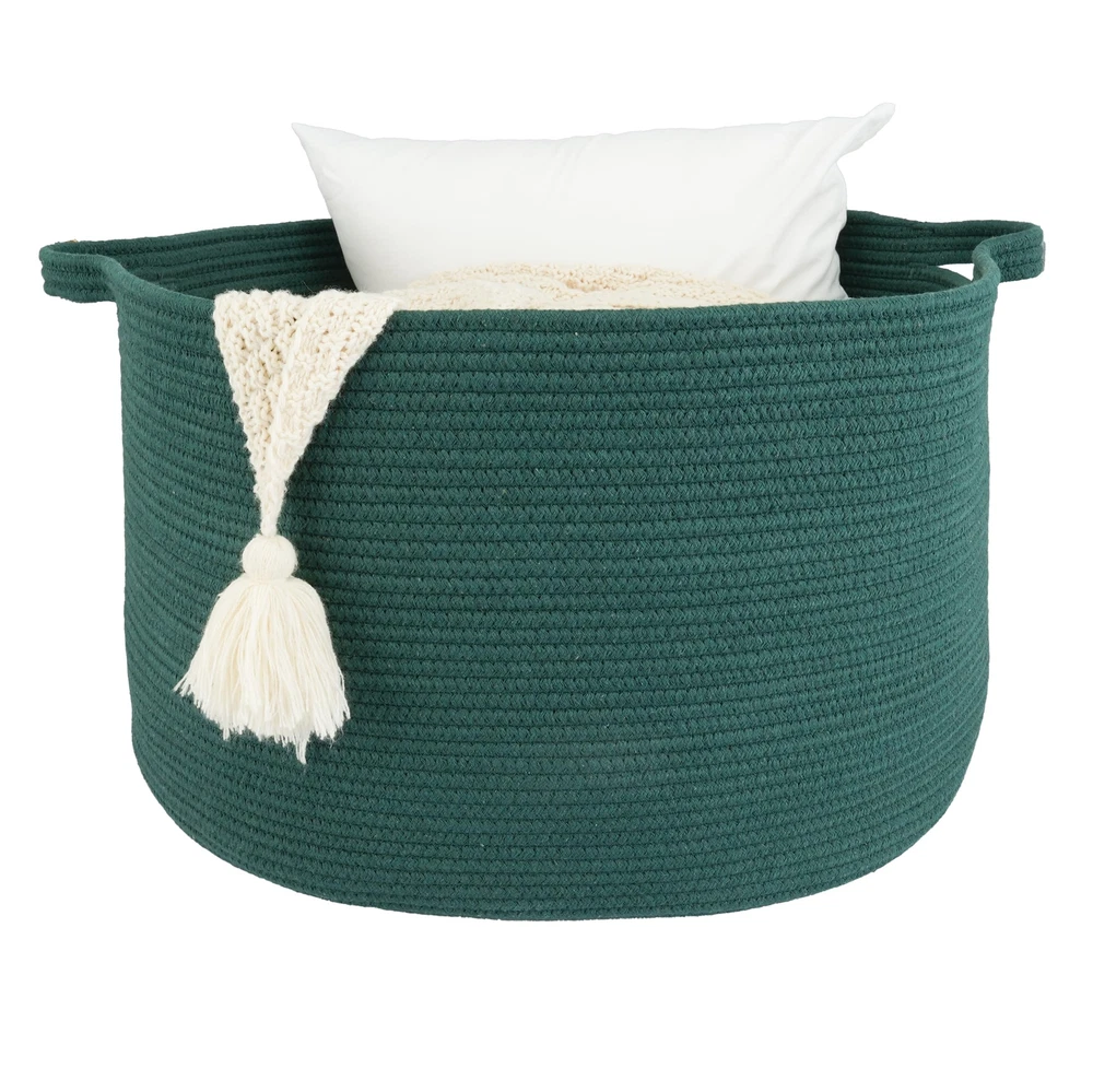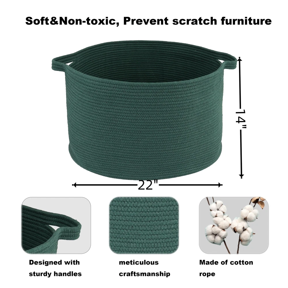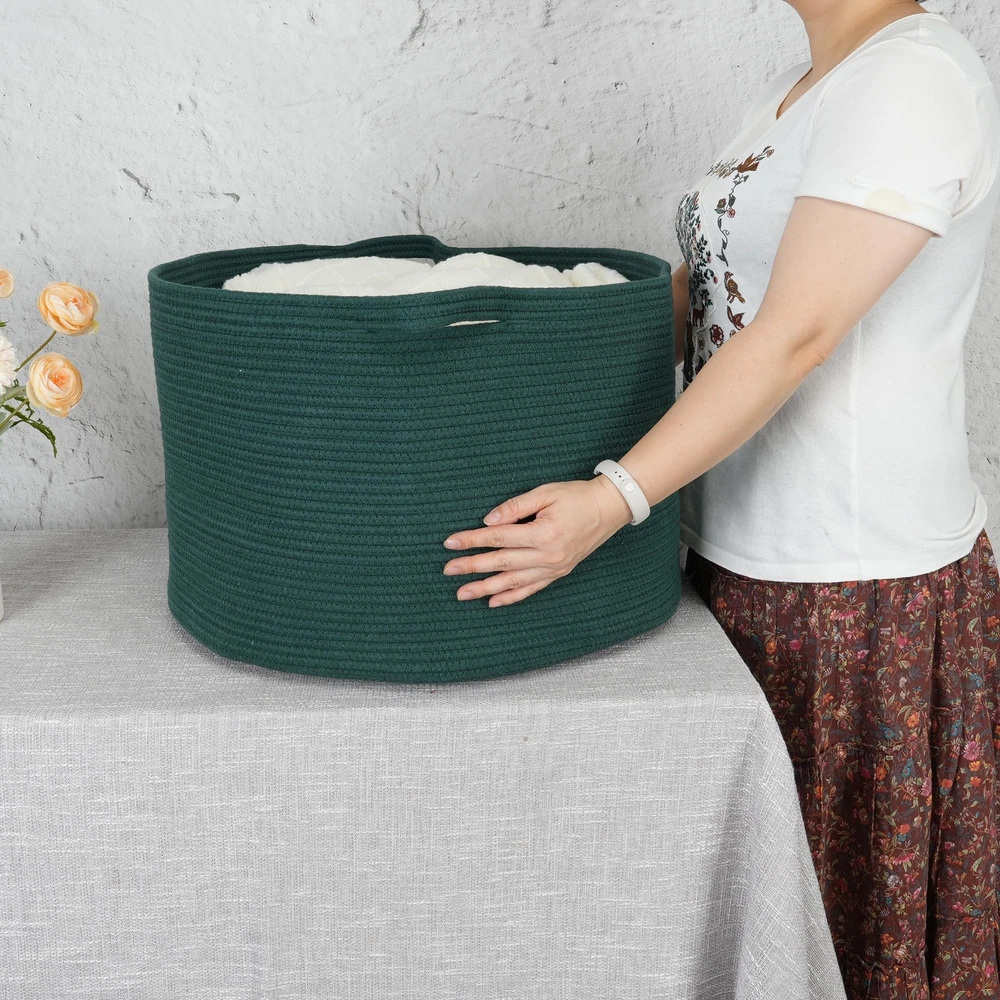Multi-purpose Extra-large Blankets Basket: Our Large woven rope basket for storage originally designed as a Blanket storage basket, blanket holder or clothes basket for storage but can be used for more. You can use it as large laundry basket, regular large storage basket, toy basket for kids, baby toy storage basket bin, towel baskets for bathroom, throw pillow basket, and more. Safe and durable decorative storage basket or woven storage basket: We use heavier and non-toxic coiled cotton rope to ensure the quality of this large rope blanket basket. These round rope baskets or laundry basket are safe for both people and pets. You can use it as baby or dog toy basket. They are odor-free and soft, making them foldable and easy to store. Designed to complement your room and decor: We have carefully selected classic solid colors for these rope basket bins for laundry or blanket. With these colors, the baskets for blankets will look good in any room of your home. These round rope blanket storage baskets enhance any room or decor. It is perfect for bedrooms, bathrooms, and dorm rooms. These aesthetic rope baskets for bedroom are essential items for your daily storage needs, helping keep your room clean and organized. Toy storage basket for kids with handles: This round rope basket is Featuring long and sturdy handles for easy mobility, this round rope basket is perfect for storing toys and doubles as a pet toy basket, suitable for dog toy storage. It also serves as a convenient toy basket for kids or baby nursery basket. Crafted from soft cotton rope, the cloth basket ensures safety with no sharp edges, preventing scratches on your furniture or floors. Note: Blankets basket comes folded and may have creases. Fully fill the rope basket with towels or clothes and wait for 1-2 days will help reshape the blanket basket. Alternatively, use steam or ironing for a quick reshape the laundry basket. The rope basket is machine washable; simply put it in a wash bag for delicate items and air dry.