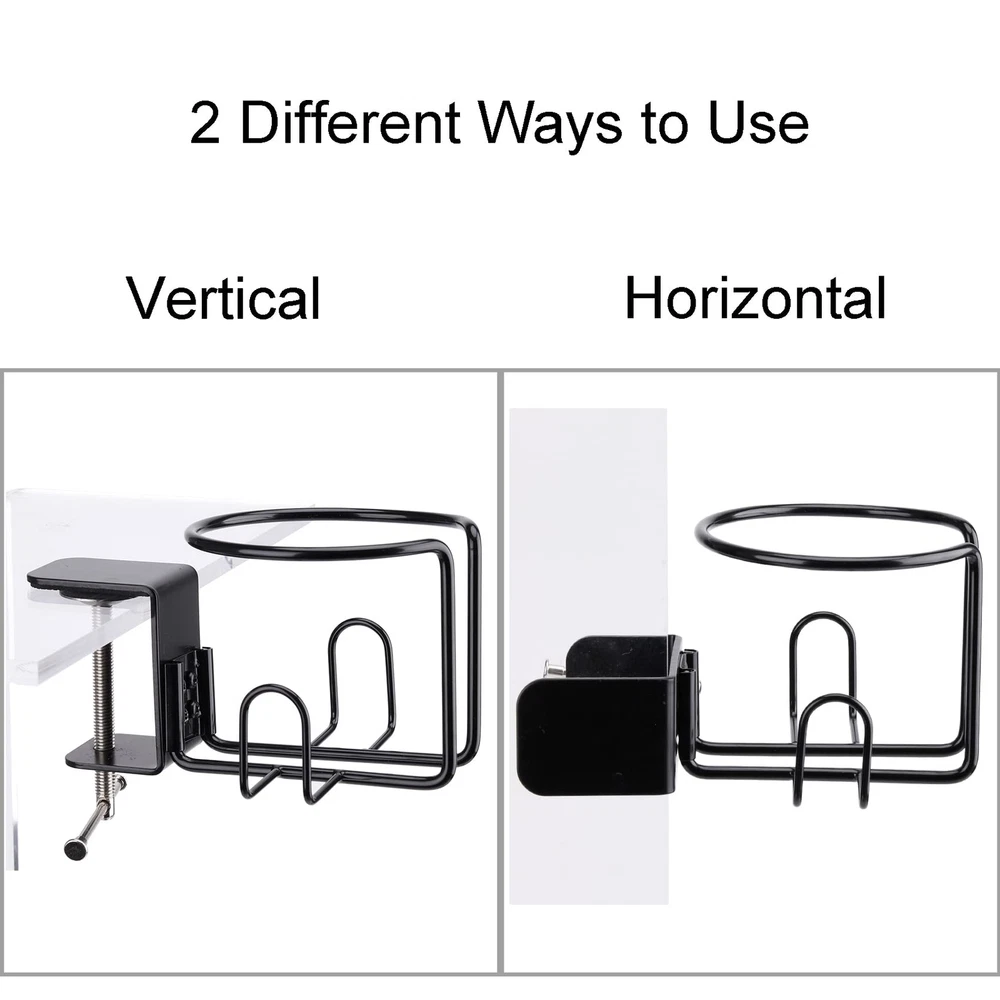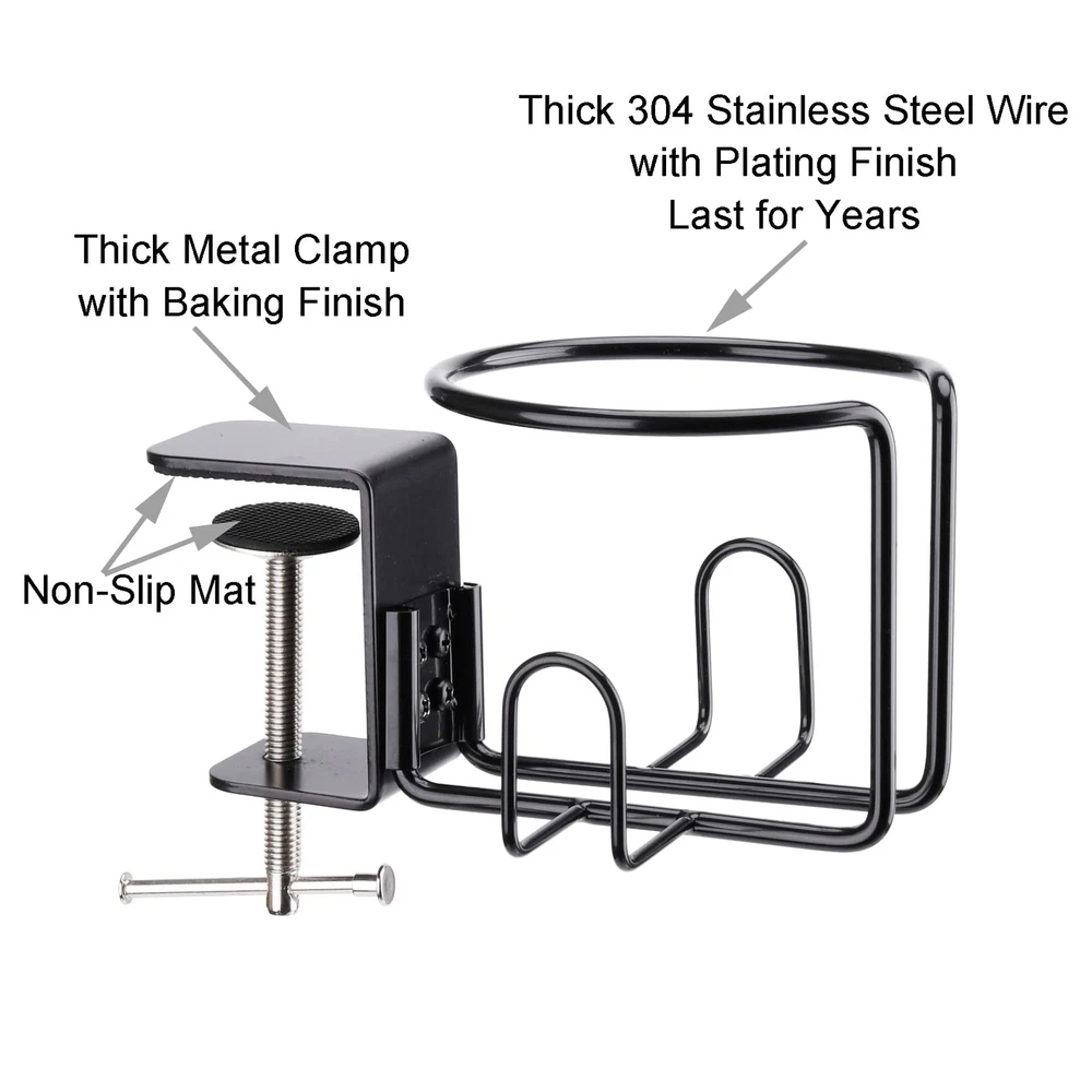 Package includes: 1 x clamp cup holder Fit Most Cups: Cup holder measures 3.58 inches in diameter, wide enough to hold most cups, cans, bottles, tumblers, mugs with handle, etc. Strong Clip: Thick metal clamp with 2.16 inches opening, will not move after it attaches to desk, even 50oz bottle on. Anti-Rust/Anti-Scratch: The drink holder is made of thick 304 stainless steel material with plating finish, and the metal clamp with thick baking finish, will not rust, can last for years. Also the clamp with non-slip mat will not scratch the surface of desk. Two Mounting Modes: Vertical mounting mode for desktop; Horizontal mounting mode for desk leg. Choose the mode when you install. Anti-Spill: Put your drinks on the side of your desk, no worry about spilling drinks when you work or play. it also frees up your desk space and keeps desk clean and neat.
