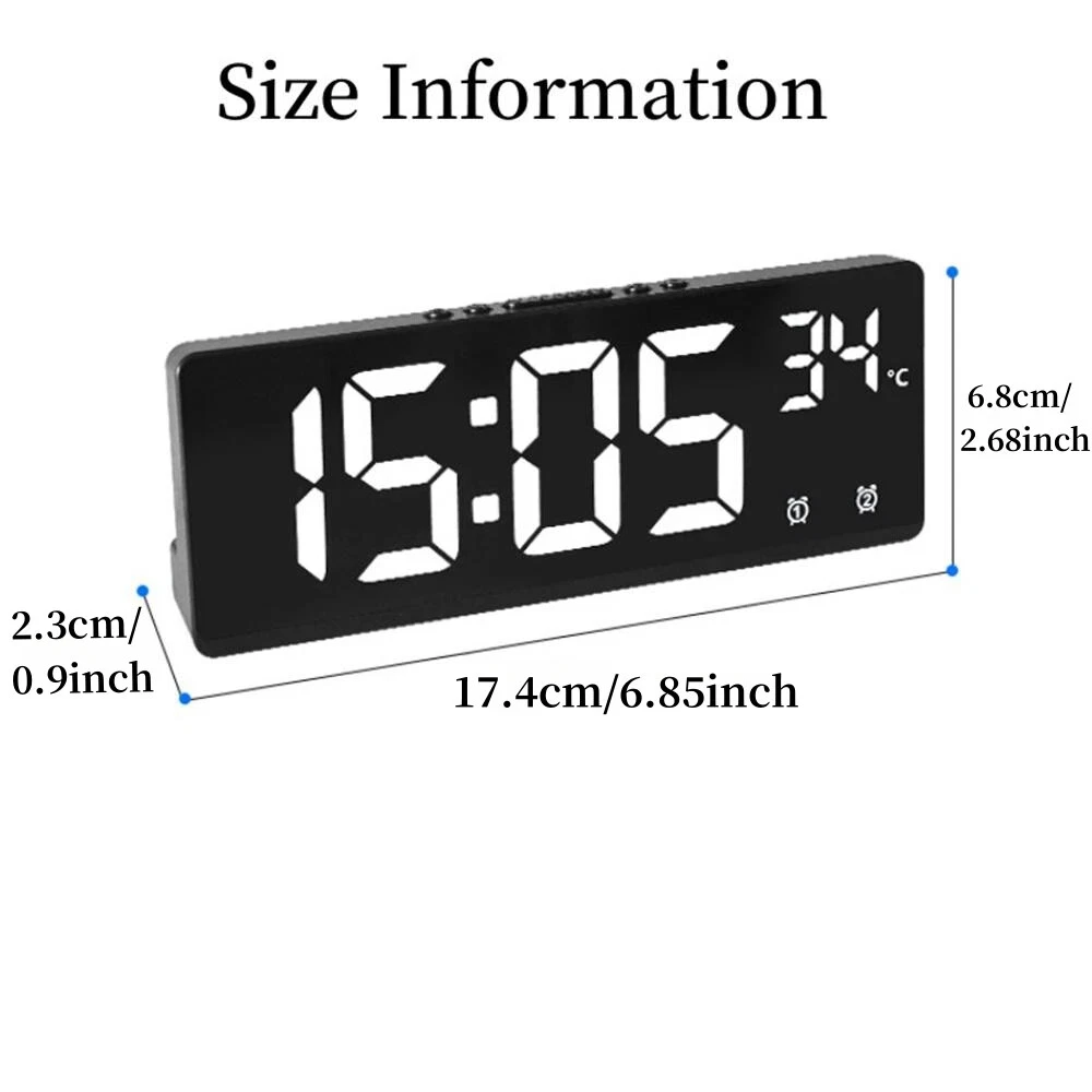 Function 1. Two Display Mode Press and hold the + key to switch the display mode. (1) Time+temperature is displayed on the same screen (2) "Time+temperature" and "Date+temperature" are displayed cyclically 2. Two sets of Alarms Support to set Alarm frequency :5/6/7 5:Alarm rings from Monday to Friday 6:Alarm rings from Monday to Saturday 7:Alarm rings from Monday to Sunday 3. 5 Levels of Brightness adjustment 4. Voice control function (available when only powered by battery) 5. Snooze function snooze 5 minute 6. Power saving mode 7. Time memory function(available when powered by battery and plug in use at the same time) 8. Night Mode If night mode is on,Brightness darkens at night (22:00-6:00) 9.Anti-disturb function at night In the non-setting state, you can press and hold the snooze button for 3 seconds to turn off the display to prevent the screen from interfering with sleep at night. After entering the screen-off mode, you can press any key to turn on the display, but the voice control cannot turn on the display 10.12/24 hour format switch (1)Time Display (2)Long press the MODE button 24Hr Display (3)Press UP or DOWN can switch to 12Hr (4)Press the MODE button Time setting display (5)Hour digits flashing Product Show Body Color :Black Body Shape:Rectangle Words:As picture show Material of Screen:Mirror Size: 17.4*6.8*2.3cm Voice control: clap your hands or knock on the table to wake up the alarm clock NOTE 1:Take the protective flim on Clock Screen,it will be brighter. NOTE 2:It will go off after 10 seconds when only powered by AAA Battery(Not Included) Clap your hands or knock on the table to wake up the alarm clock If you want screen always on,please plug in use.