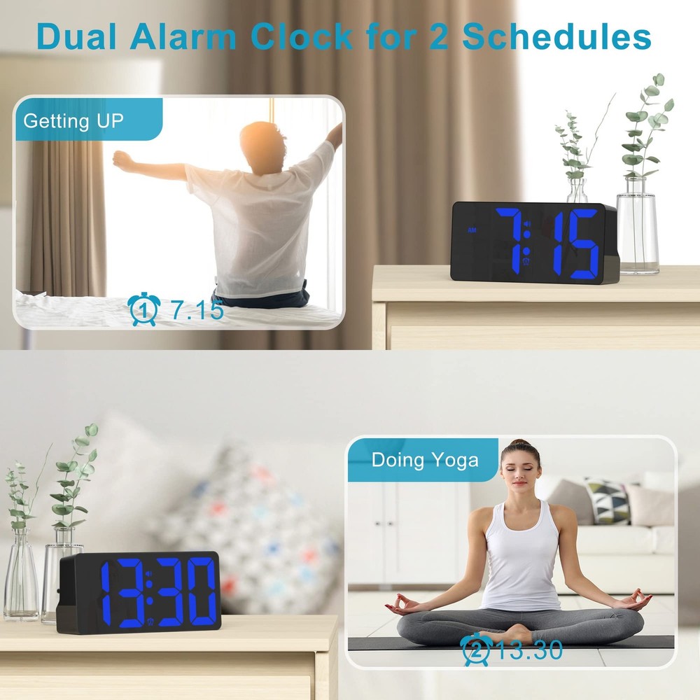 Digital Dual Alarm Clock With Dimmable LED Big Display For Bedroom, Usb And Usb-C Charging Port For Cellphone, Night Light At The Rear, Full Range Dimmer Screen, 7 Level Adjustable Volume, 9 Mins Snooze, 12/24H/Dst, Aaa Battery Backup For Power Outage. Please Note: The Alarm Clock Should Be Outlet Powered. The Display Will Go Blank If Power Failure. The Battery Only Backup Time And Alarm Setting To Avoid Resetting The Clock When Power Back. Widely Use: The Digital Clock Can Be Used For Home Living Room Bedroom Kitchen Bathroom Classroom Guest Room Desk Table Nightstand Bedside. Digital Clock Is A Cool Decor For Your Room, It Is Also A Great Gift For Kids Teens Boys Girls Seniors Heavy Sleepers Adults. 【Large Display Digital Clock with Bold LED Number】This digital alarm clock is not only a Loud alarm clock that wake you up every morning, but also a large number alarm clock for elderly. You can see it clearly from across the room without putting your glasses on. It is a basic alarm clock but not simple. It is versatile with dual alarms setting, 7 level alarm volumes, 2 charging port, full range dimmer,night light, 9 minutes snooze, battery backup functions. 【Dual Alarm Clock with Touch Snooze 】Compact 2 alarms seting function is perfect when you have 2 schedules or different waking time from your family member. ONLY one touch snooze function at the top part for easier use, don't worry press the wrong button when you try to snooze the clock at morning. You can easily pause the clock without opening your eyes. 【Night Light Alarm Clock with USB & Type C Charging Ports】Built-in type C and usb output port Allow 2 digital Devices such as your Cellphone and watch Being Charged at the same time. The annoying question that there is only one socket beside your bed is perfectly addressed. The night light at the rear will be on when you touch the top snooze/light button. It is not only a modern digital alarm clock for bedroom home living decor, but also a cool kid alarm clock that accompany your child at night. 【Full Range Dimmer and 7-level Volumes】The led alarm clock can be adjusted from very bright to nearly invisible and a low brightness icon will show up on the screen and disappear after 20 secs, then you can press any button to lit the screen. It is helpful If you are sensitive about light while sleeping. Besides, featured by 7 level alarm sound(from 70db to 118db), this LED clock is also an ideal loud alarm clock for Heavy sleepers adult, elderly, senior, sleepy kids, teens, boys and girls. 【Plug in Alarm Clock with Battery Backup Settings 】Please note it is not a battery operated alarm clock but only outlet powered(AC 100-240V) to support the whole functions(the digital display, phone charging, dimmer etc). 2 PCS AAA backup batteries are only used to memorize time and alarm settings. Once unplugged, the time display will go blank but the alarm function can still work with battery and it will wake you up on time. No need to reset time when power recovers. 【12H/24H Time Format/DST/ Warranty 】Our digital alarm clock has optional 12/24 H time format and Daylight saving time that meet everyone's need. This LED Clock is also a sweet gift for your family, friends. We care about you and provide you 18-month warranty, 12-month replacement, 3-month refund. If any question, please contact us seller anytime.