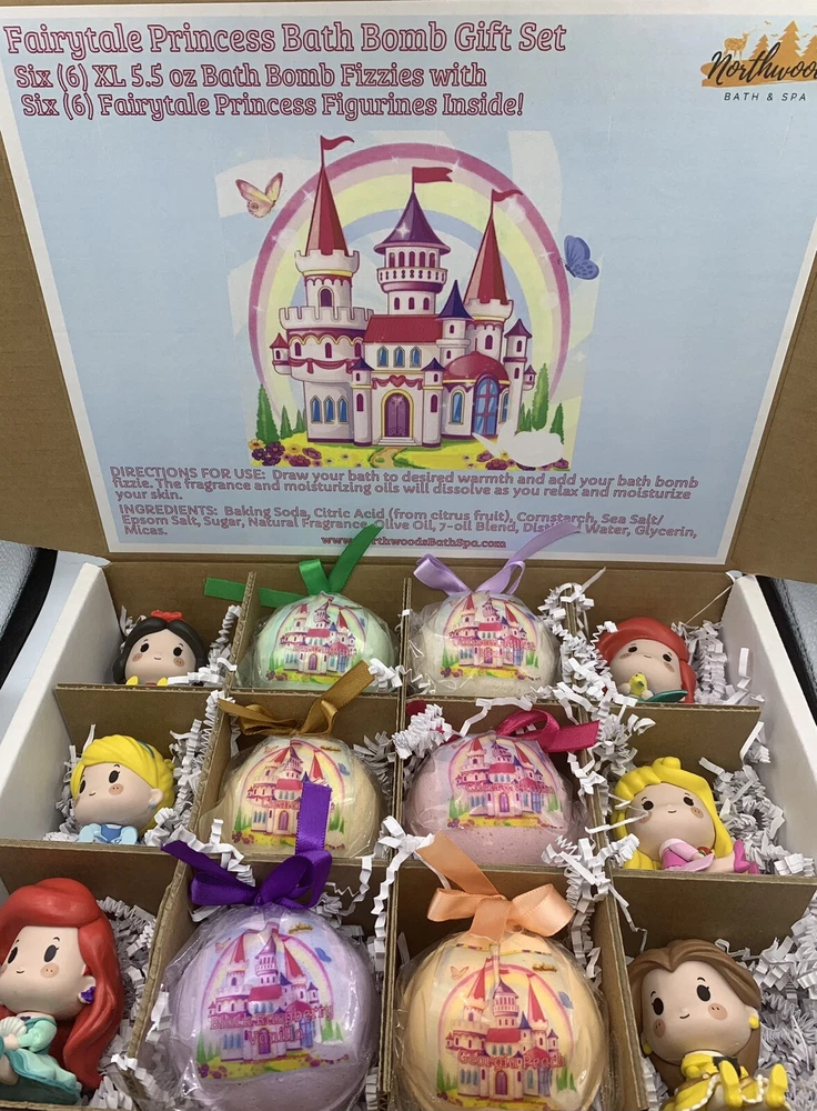 Large Fairytale Princess Figurines 6-pack Bath Bomb Gift Set. Includes six (6) XL 5.5 oz bath bomb fizzies and six (6) Fairytale Princess Figurines. The Fairytale Princess Figurines are too large to fit inside the bath bomb, so they are loose inside the box next to the bath bombs. The fragrances in this gift set include Black Raspberry Vanilla, Bubblegum, Cherry Vanilla, Clementine, Georgia Peach, and Oatmeal, Milk & Honey. (As we make more bath bombs, we will be adding other fragrances to this gift set.) We also include two (2) Goat's Milk & Shea Butter handmade castle soaps. PREMIUM QUALITY - Handmade in Arbor Vitae, Wisconsin. Natural and organic. Comparable to Lush Bath Bombs, ours are 5.5 oz each. PERFECT GIFT IDEA - Includes six (6) XL 5.5 oz bath bombs and six (6) Fairytale Princess Figurines loose inside the box. The Fairytale Princess Figurines are too big to fit inside the bath bombs. The Fairytale Princess Figurines come individually wrapped inside a clear cello bag. NATURAL, VEGAN, ORGANIC, cruelty free. Made with luxury ingredients including Shea, Mango & Cocoa Butter that will help leave your skin feeling soft and smooth. SATISFACTION GUARANTEE - We want you to be happy with your gift set. The fragrances in this gift set include Black Raspberry Vanilla, Bubblegum, Cherry Vanilla, Clementine, Georgia Peach, and Oatmeal, Milk & Honey, but we will be adding other fragrances to this gift set in the near future. Shipped via the cheapest rate I can find! USPS Ground Advantage, priority mail, UPS, etc. Check out my website for other gift sets for kids.
