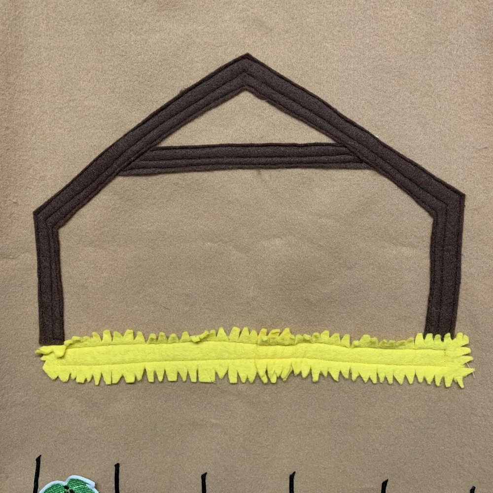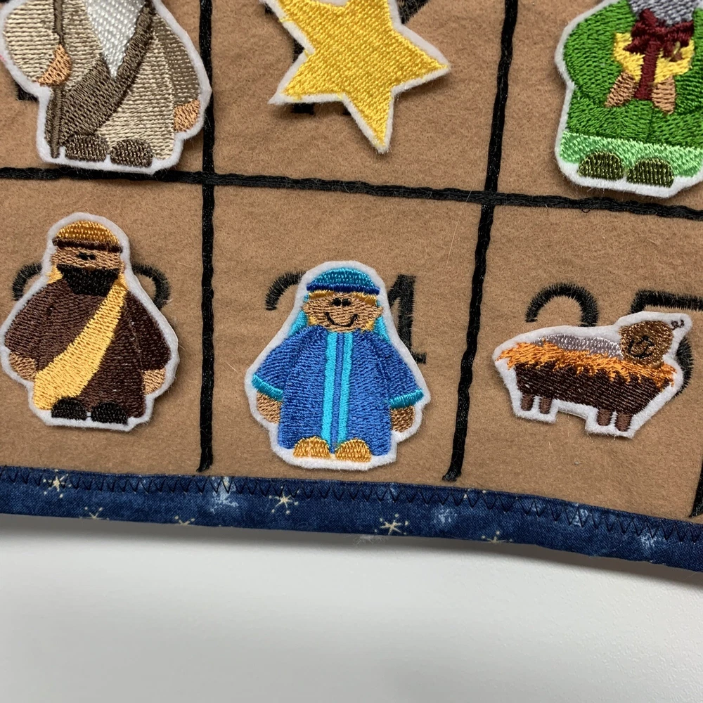 Super cute advent calendar! This is made out of felt and fabric. Each day has a embroidered figure to be placed in and around the stable. Includes various animals, palm trees, hay bale, shepherds, 3 kings, star, angels and of course Joseph, Mary & Baby Jesus. Each piece has hook & loop attached to the back to secure to the stable area. Excellent pre-owned condition! This item is large and measures 27” height x 18” across.