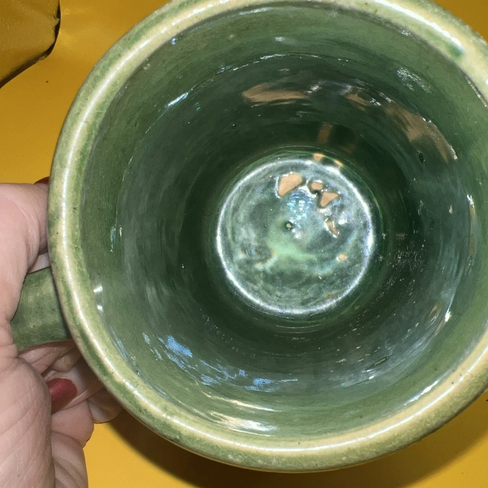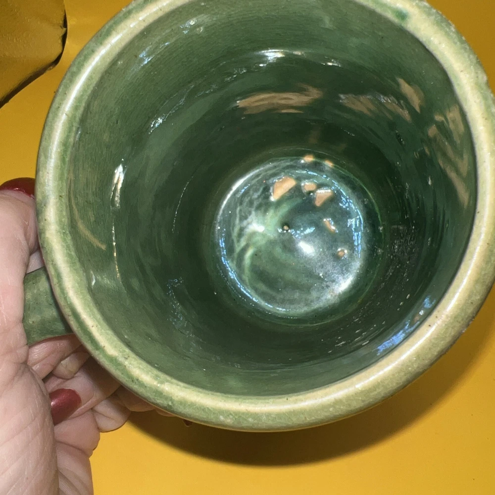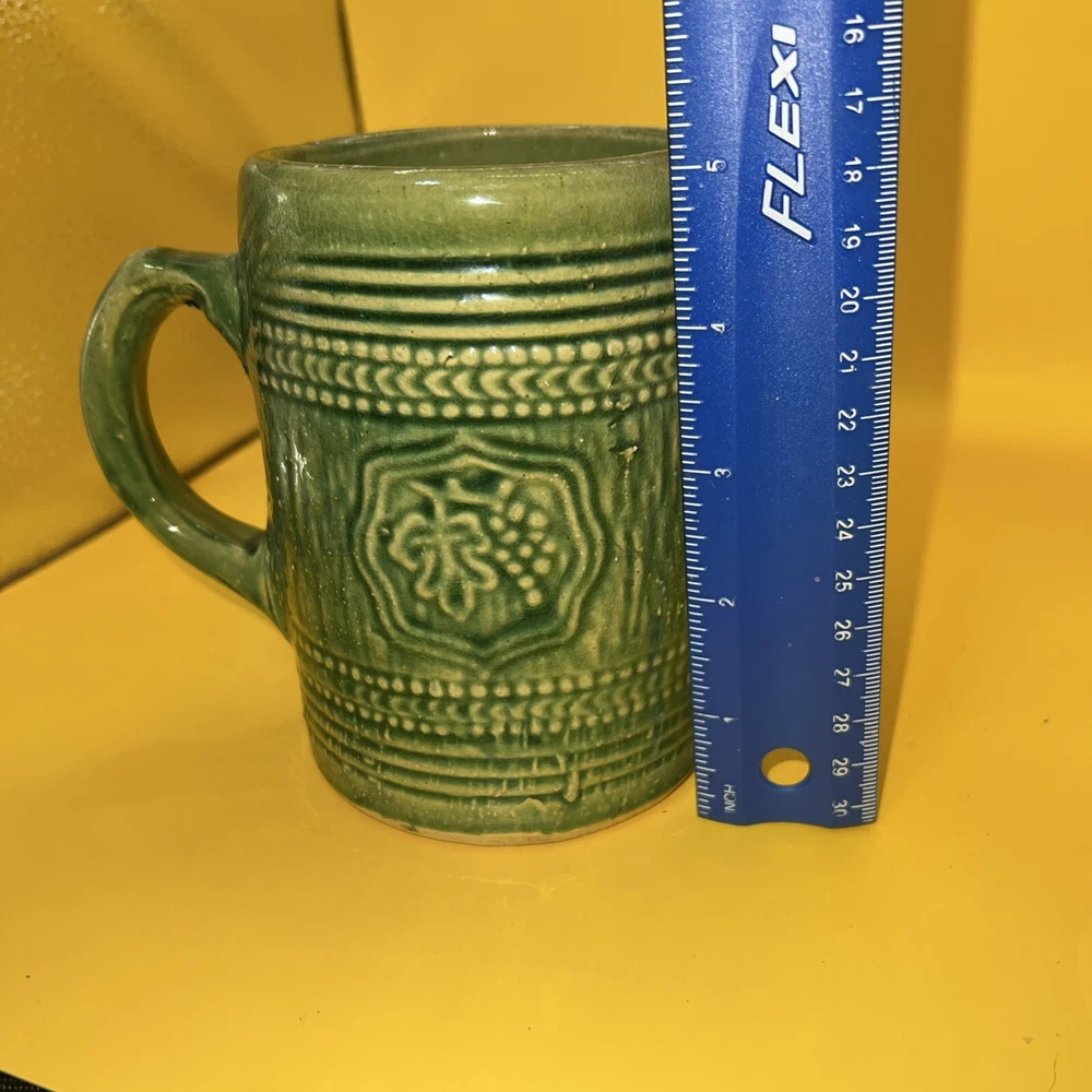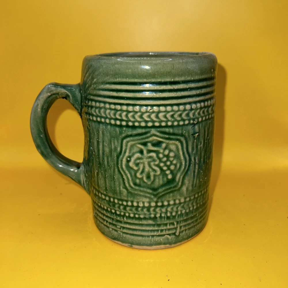 Embrace the charm of the early 20th century with this Large Heavy Antique McCoy Pottery Green Grape and Leaf Stoneware Mug. Crafted between 1920 and 1929, this authentic piece features a lush green leaf pattern that wraps around the exterior, exuding a timeless elegance that's sure to compliment any home decor. The mug stands at an impressive 5.25 inches tall with a robust diameter of 3 inches, making it ideal for a generous pour of your favorite beverage. Weighing in at 1.8 pounds, its substantial heft is a testament to the quality craftsmanship of the era. Whether for use or display, this mug is a genuine slice of Americana, celebrating the artistry of vintage pottery.