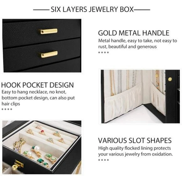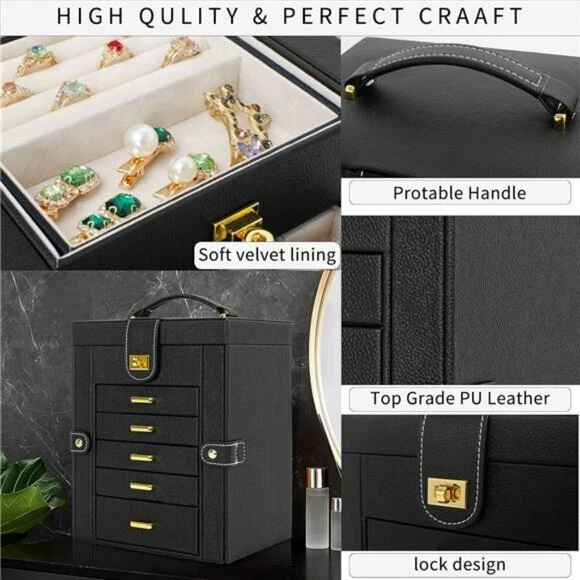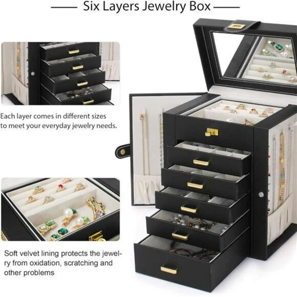 NEW! Jewelry Box Organizer Black Leather Jewelry Storage Holder Display Ring Necklace Earring Bracelet Holder with Mirror Back - Made of Engineered Wood, Faux Leather, Velvet - Large Capacity; with 6 versatile pull out drawers, this black jewelry box can store a lot of jewelry accessories, such as rings, earrings, necklaces, chains, bracelets, and so on. Soft pillows in the bottom drawer suit for storing watches. One deeper drawer is designed for sunglasses or large jewelries - Ideal Gift for her THANK YOU!
