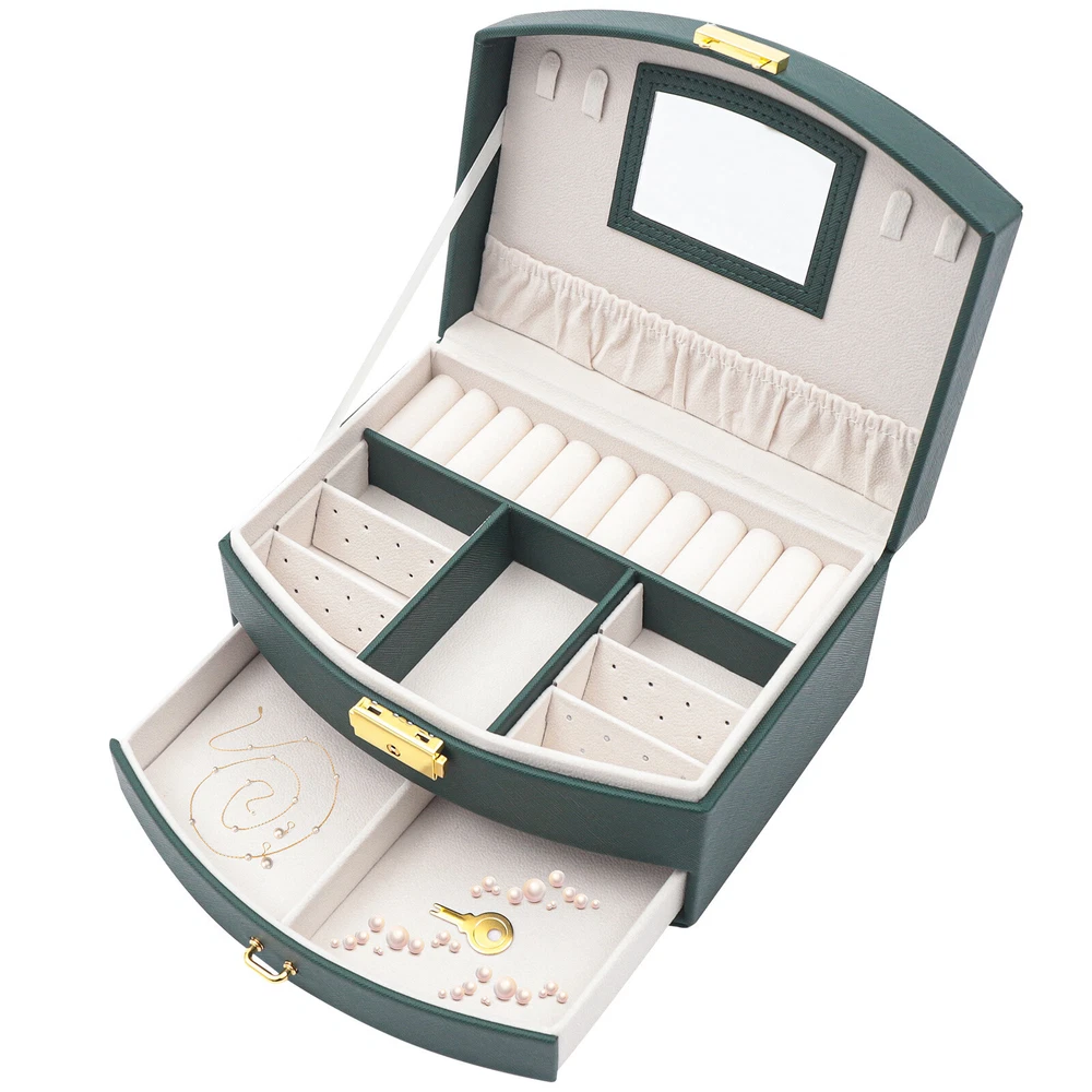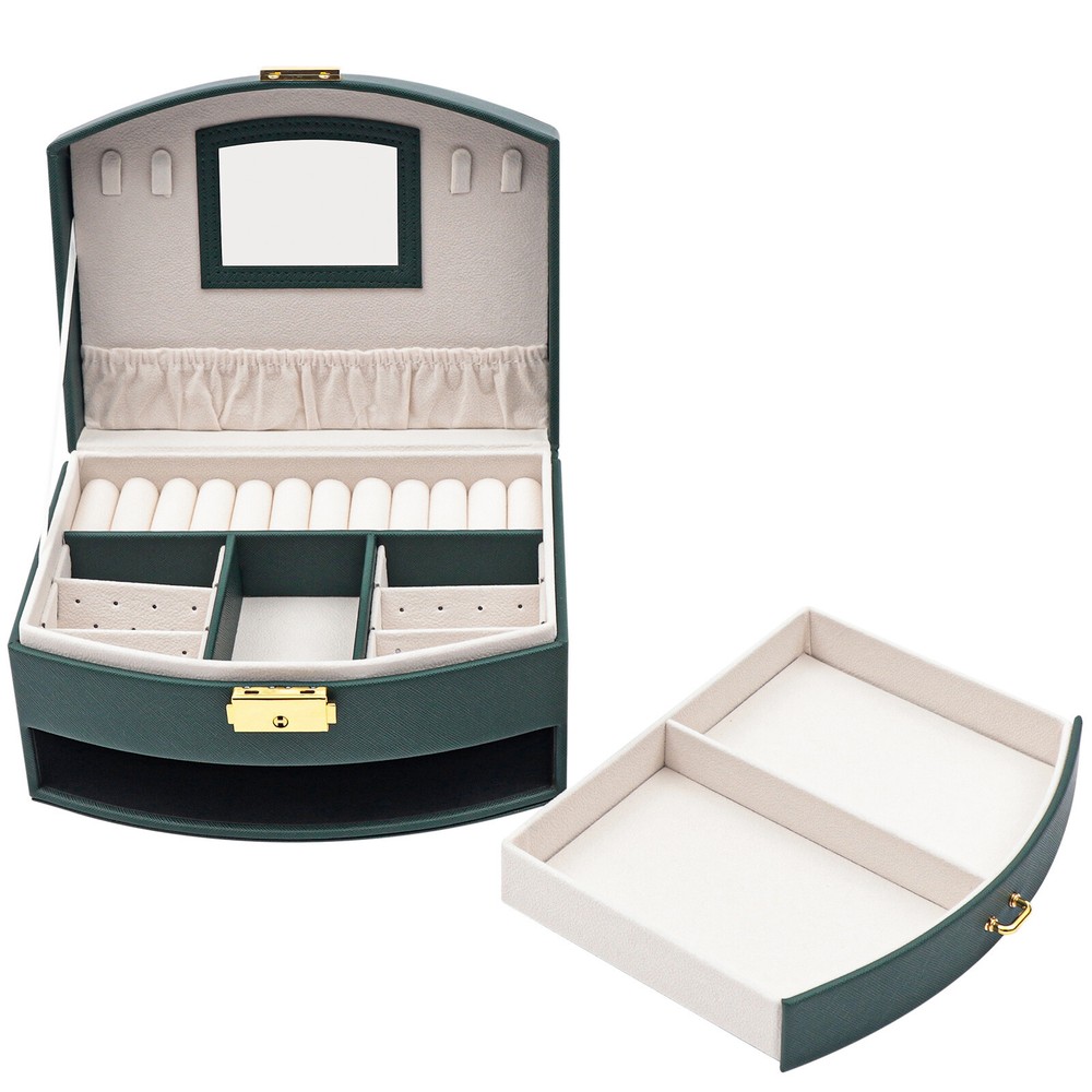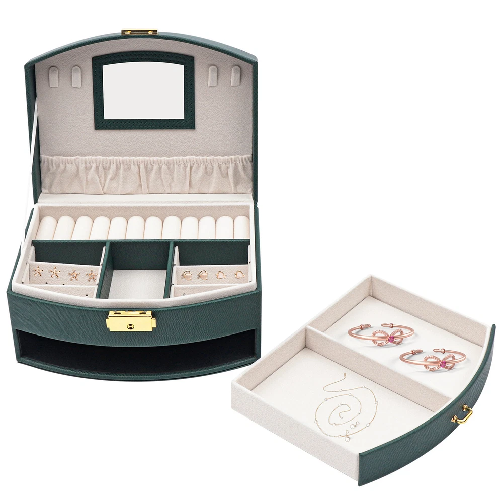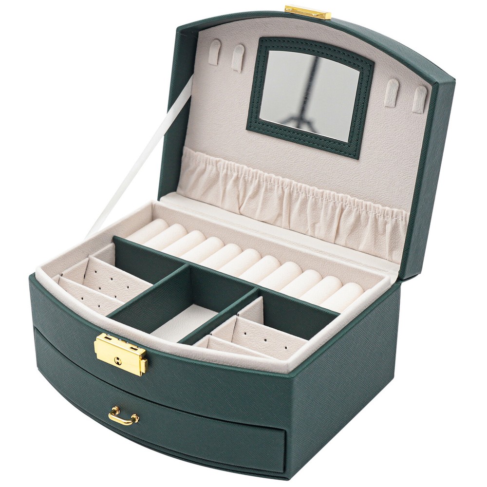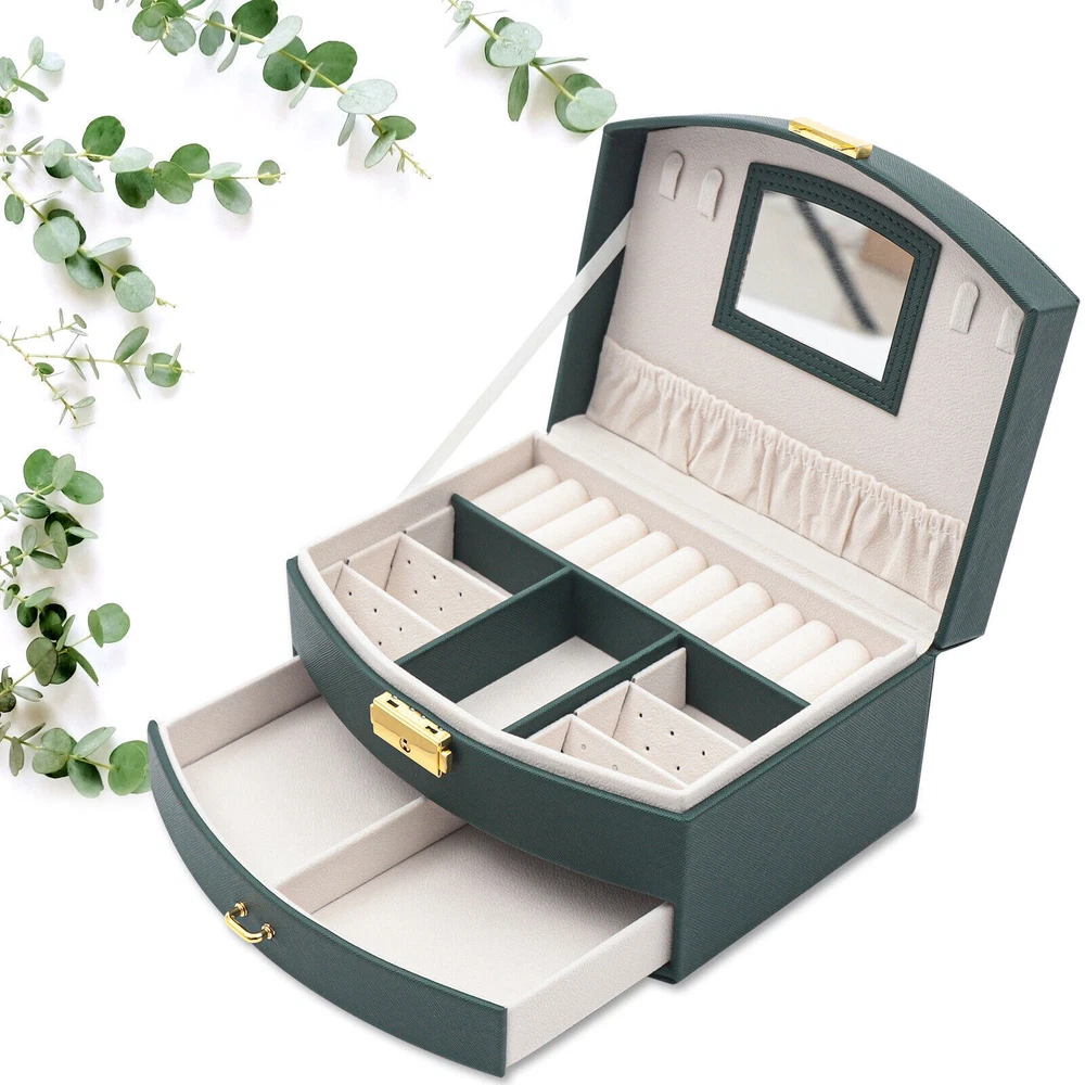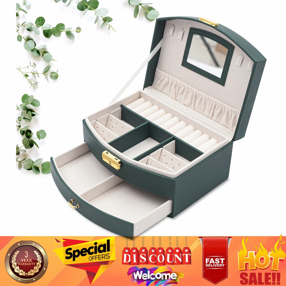 Description Are you still having trouble finding a particular piece of jewelry because you don't have a special storage box for it? Are you looking forward to having a sophisticated, personalized jewelry box? Then look no further than this double drawer jewelry box. With this jewelry box, your jewelry will have a cozy and comfortable home. Key Features High-quality Materials: The box is made of high-quality PU and flocked fabric. The PU surface gives the box a beautiful look and is hard-wearing and easy to clean, giving the box a long life. The soft material of the flocked fabric keeps your jewelry well protected. Looking forward to receiving your offer! Description Description Are you still having trouble finding a particular piece of jewelry because you don't have a special storage box for it? Are you looking forward to having a sophisticated, personalized jewelry box? Then look no further than this double drawer jewelry box. With this jewelry box, your jewelry will have a cozy and comfortable home. Key Features High-quality Materials : The box is made of high-quality PU and flocked fabric. The PU surface gives the box a beautiful look and is hard-wearing and easy to clean, giving the box a long life. The soft material of the flocked fabric keeps your jewelry well protected. Waterproof Casing: The casing is made of waterproof, mold-resistant PU, so your jewelry is well protected. Large Volume: With its double drawer design, this jewelry box can hold more jewelry than those of a single drawer, so you no longer have to worry about storing your many pieces of jewelry. Clear Sorted : Each layer of the box has a sectioned divider, which allows you to keep your jewelry in a separate place for easy access. Great Look : The dark green casing and gold clasp give the box a stylish, classic look. The white velvet lining of the box complements your jewelry beautifully. Partition Design: The jewelry box has removable compartments, which allows for flexible storage space. Earrings, large earrings, bracelets, rings, and necklaces all have a special place. Wide Application: The stylish appearance and practical design of this jewelry box make it suitable for both home use and gift-giving. The large capacity of the box makes it suitable for all kinds of jewelry. Customer Service: Our goal is to provide quality products and services. If you have any questions, please feel free to contact us. We will reply and solve the problem for you as soon as possible. Details High-quality Mirror: The jewelry box with a high-quality mirror allows you to store your jewelry and use it for make-up at the same time. The mirror on the box also makes it easier to put on your jewelry. Sturdy Carry Handle: The carrying handle is secured with a metal clasp, so it is sturdy and durable. And the carry handle is designed to make it easy for you to carry. Flocked Lining: The lining of this jewelry box is made of soft flocked fabric, which is comfortable to the touch. The delicate flocked fabric protects the jewelry well. Locking Design: The box comes with a locking design for better storage and carrying of jewelry. The lustrous metallic clasp enhances the overall quality of the box. Application This jewelry box is designed to hold a wide range of jewelry and to keep it well sorted. This beautiful jewelry box is suitable for home or travel storage and gift-giving. Specification Material: PU, Flocked Fabric Product Size: 20*16*10cm/7.87*6.29*3.93in Package Size: 21*16.7*11.7cm/8.26*6.57*4.60in Net Weight: 0.7kg/1.54lbs Gross Weight: 0.9kg/1.32lbs Package Included 1 x Jewelry Box Notes Please allow the slight color difference caused by the shooting light and 1-3cm error due to manual measurement. Please make sure you do not mind before you order. Description Payment Delivery details Terms of sales About us Contact us Payment We accept ebay payment 。 Fees such as import duties, taxes are not included in the item price or shipping costs. These charges are the buyer's responsibility. Delivery details Shipping: 2-9 working days to: USA Terms of sales We maintain high standards of excellence and strive for hundred percent customer satisfaction. Feedback is very important to us. We hope that you contact us immediately before you give neutral or negative feedback, so that we can address your concerns. It is impossible to address issues if we do not know about them! About us Your satis faction is our ultimate goal. We work hard to earn your trust and future business. Our certified technicians have tested each item before shipping. The unit comes with 1 year limited warranty on all manufacturing defects. a) If you receive a defective item, you may return it or ask for a discount. Please contact us within 14 days after you receive the package. b) What you returned must be intact and in its original packaging as re? u. Customer is responsible for shipping costs of the returned item. c) We will cover the cost of shipping back t with the shipping rate indicated in the registration page. We will send you a new unit or refund the full payment you paid. Thank you. Contact us Business Hour Business Hour: Monday To Friday: 8:30 AM to 5:00 PM (Beijing China time) Due to time zones, our reply to your questions may not be immediately. But within above working time, we will reply your email within 24 hours. If it's non-workdays, please kindly be patient and wait till Monday. Please contact us with ebay message. Please feel free to contact us if you have any questions. Monday To Friday: 8:30 AM to 5:00 PM (Beijing China time) Due to time zones, our reply to your questions may not be immediately. But within above working time, we will reply your email within 24 hours. If it's non-workdays, please kindly be patient and wait till Monday. Please contact us with ebay message. Please feel free to contact us if you have any questions.