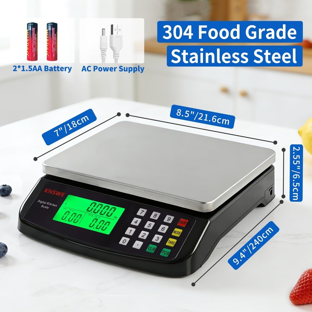 Large Kitchen Scale Black 40KG/88LB Commercial Food Scales Digital Weight for Co (US WAREHOUSE - FAST SHIP USA) Summary 【 Accurate Large Capacity 】This scales digital weight food is equipped with an upgraded high-sensitivity build-in sensor with a large weighing range of 3g-40kg (88lb) and 1g(0.04oz) increments. Its large capacity make it suitable for most weighing needs, such as cooking, baking, farmers market, weighing packages, etc 【 5 Units and Multifunction 】This commerical kitchen scale includes Pricing / Tare /Counting / Auto-off /5 Units (g,kg,lb,oz,ml) which can fulfill different need of weighing. Enter the price and the amount price is calculated automatically. Tare function can subtract the weight of containers such as bowls and cups. Counting function is suitable for counting coins, screws, etc 【 Upgrade Full View LCD Display 】High-quality backlit LCD screen enables clear readings from multiple angles, displaying weight data intuitively whether in direct sunlight or dim environments. Ideal for weighing dried fruits and spices in bright outdoor settings, as well as counting parts in dimly lit warehouses 【 Food-Grade Stainless Steel 】The weighing platform is made of 304 food-grade stainless steel, which allows food to directly contact the scale surface and it's more reassuring than ordinary stainless steel. It is easy to clean, requiring only a quick wipe, which is perfect for professional kitchens weighing vegetables, fruits,meats and deli food 【 2 Power Supply Modes 】This large kitchen scale can be plugged in with a USB cable or two AA batteries (included). Accessories include AA batteries x 2, USB power cable x1. (Note: USB cable and battery cannot be used simultaneously. AC to DC 5~6V / ~1A) 【 Versatile Uses 】This electronic balance is suitable for restaurant cooking, sourdough bread baking, calculating the price for commercial retail stores weighing cheese, bread, candy, groceries, counting the number of parts, DIY, weighing pet food, home brewing, calculating daily expenses, etc Product description This scales digital weight food is equipped with an upgraded high-sensitivity build-in sensor with a large weighing range of 3g-40kg (88lb) and 1g(0.04oz) increments. Its large capacity make it suitable for most weighing needs, such as cooking, baking, farmers market, weighing packages, etc. This commerical kitchen scale includes Pricing / Tare /Counting / Auto-off /5 Units (g,kg,lb,oz,ml) which can fulfill different need of weighing. Enter the price and the amount price is calculated automatically. Tare function can subtract the weight of containers such as bowls and cups. Counting function is suitable for counting coins, screws, etc Shipping We ship to EBAY address, and please make sure your EBAY address correct before purchase. We only ship to the lower 48 states, no APO/FPO addresses or PO Boxes allowed. Local pickups and combined shipping options are not provided at this time. Return You can return a product for up to 30 days from the date you purchased it. Any product you return must be in the same condition you received it and in the original packaging. Please keep the receipt. Payment We accept payment by any of the following methods: PayPal Please pay as soon as possible after winning an auction, as that will allow us to post your item to you sooner! Feedback Customer satisfaction is very important to us. If you have any problem with your order, please contact us and we will do our best to make you satisfied. Contact Us If you have any queries, please contact us via eBay. We usually respond within 24 hours on weekdays. Please visit our eBay store to check out other items for sale! Thank you for shopping at our store.