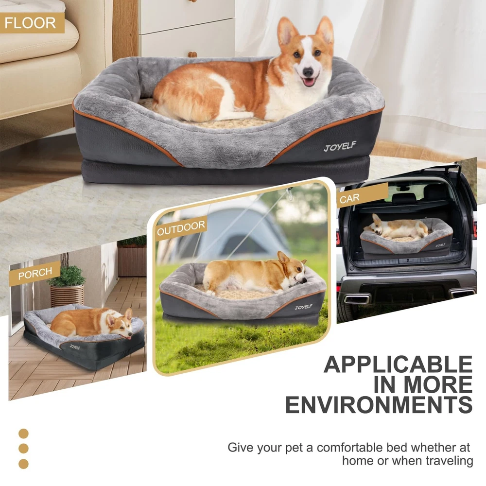 -Only for your furry friend As a manufacturer specializing in pet products, we hope our products from can bring happiness and comfort to more pets. It is our original intention to make every pet a joy elf , and their happiness makes us continue to grow. We are passionate about doing our part to make life of pets and human better. We provide high-quality pet products, great value, and exceptional customer service . We do our best to create dream homes for you and your furry family members. Orthopedic Memory Foam dog bed comes with premium materials, unique design, top-of-the-line workmanship , offers your pet a good night's rest. ①Solid Memory Foam base for perfectly to your pet's body for maximum comfort and Orthopedic support and achieves maximum relief. ②PP cotton-padded support bolsters are generously filled surround a whole circle can protect your pet's neck, relieve the neck caused by fatigue and discomfort. ③Soft&breathable outer cover let your pet get into the dream soon. ④The bottom provide a stable and comfortable resting place. ⑤It also features a Squeaker Toy as gift for your furry friends. Care Instructions Machine wash cold, gentle cycle only. Wash the cover only, do not bleach. Reshape as needed. For best results, hang to dry. Please note the bed takes 48-72 hours to fully expand because of vacuum packaging, shake and fluff the bed before using! If you need any help or information about any item, please feel free to contact us. We will definitely give you a satisfactory answer within 24 hours ! HIGH-QUALITY MATERIALS: ①Solid Memory Foam base for perfectly to your pet's body for maximum comfort;②Memory Foam using flame retardant material;③The Bottom Material of the dog bed comes with built-in nonslip rubber backing④Inner cover perfect for senior dog with occasional accident;⑤The fabric offers unmatched warmth and comfort;⑥The bolster is big and fluffy which is relax breathable and good resilience. BETTER DESIGN:①The base high-density memory foam can provide the ultimate sleep experience with superior overall comfort and to last;②The bottom is lined with to avoid the bed from ever sliding around;③Soft & Full comfy PPcotton-padded Bolsters (couch arms) surround a whole circle can protect your pet's neck.④The hidden zipper of this orthopedic dog bed makes the product look better;⑤Internal liner to protect memory foam from liquids. EASY To MAINTAIN:①Removable cover is machine washable,simply remove the cover, zip closed ②Easy to find & Remove hair;③Do not immerse in water for long time& tumble dry ,Line dry better GIFTS:Squeaker toys as gifts(Bone shape) SIZE: Measuring from outside of bolster 36'' x 27'' x 8''. Sleeping area inside bolster: 29'' x 20''. The memory foam base 33.5'' x 23.5''x 3''. Ideal for Medium to Large size dogs and also great for multiple smaller dogs.