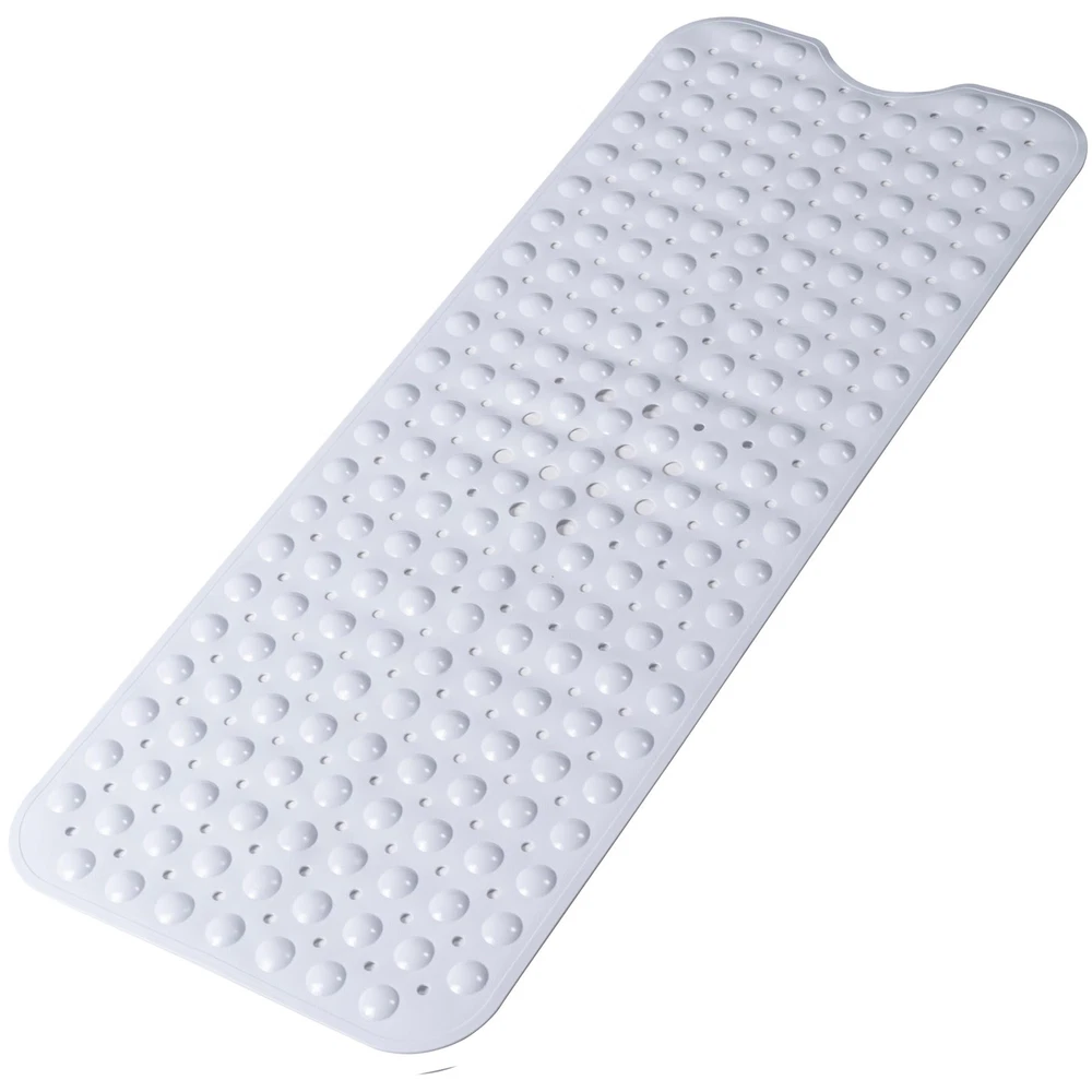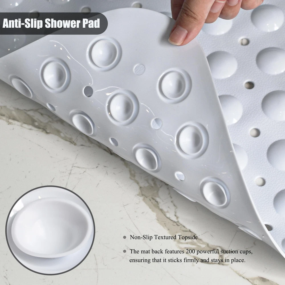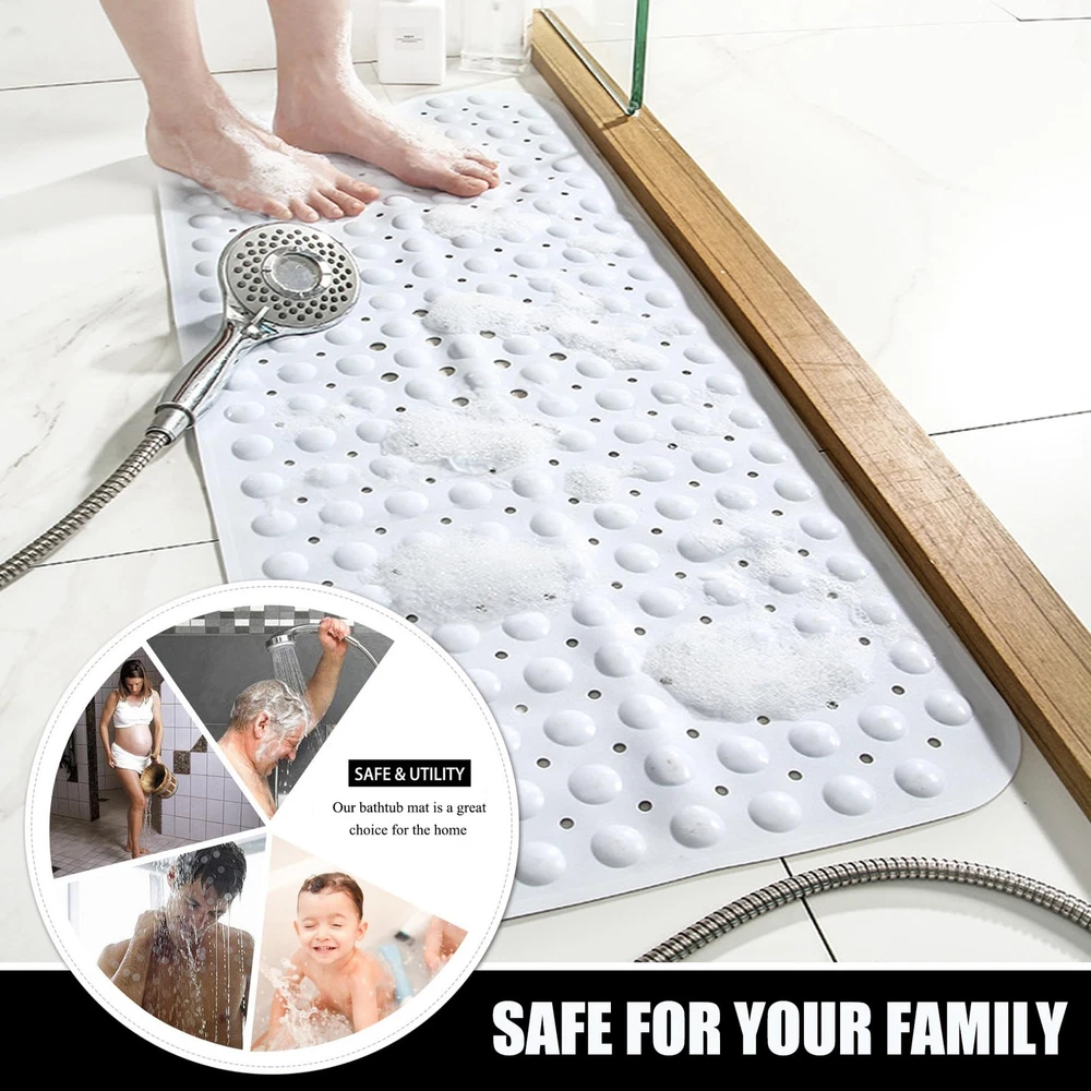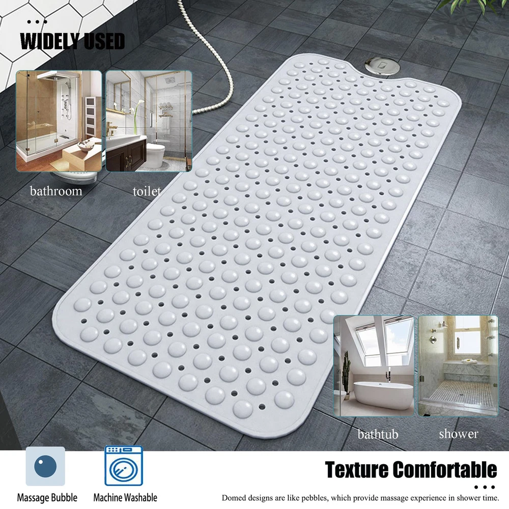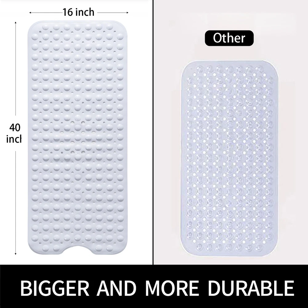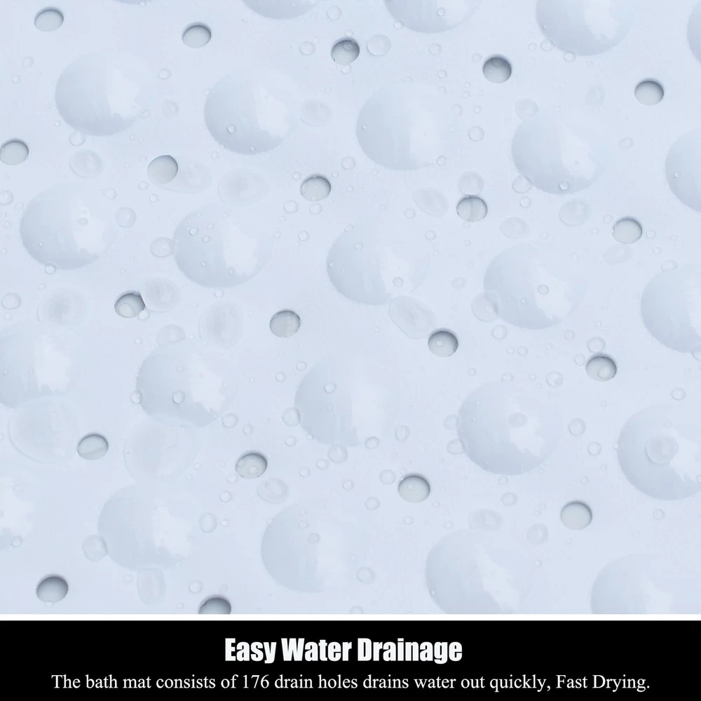 【Texture Comfortable】 The mat is constructed with flexible and durble BPA free materials, with a pebble textured and domed topside that is so soft on feet, say goodbye to cold, hard bathroom floors. 【ANTI-SLIP Shower Pad】The presence of a fine non-slip texture on the surface of the bathtub mat, The back with 200 powerful tight suction cups that effectively help secure the mat to your tub or shower floor, preventing it from sliding around. 【Easy Water Drainage】The bath mat consists of hundreds of drain holes drains water out quickly and helping to prevent water from sitting stagnant under the mat in your tub keep the mat dry and clean. 【Oversized And Machine Washable】The bathmat is so easy to clean, simply machine wash and air dry; Generously sized mat measures 40 by 16 inches, much larger than the average non-slip bath mat for added more coverage and protection. 【Wide Applications】 This bath mat is versatile and can be used in various places around your home. It is perfect for placing in the bathroom, shower, bathtub, or by the poolside. And it can also be used in spa and wellness centers, gyms and fitness studios, hotels and resorts, day care centers and schools. No matter where it is used, our bath mat offers both practicality and aesthetics, making it a versatile and essential item in various settings.