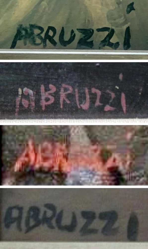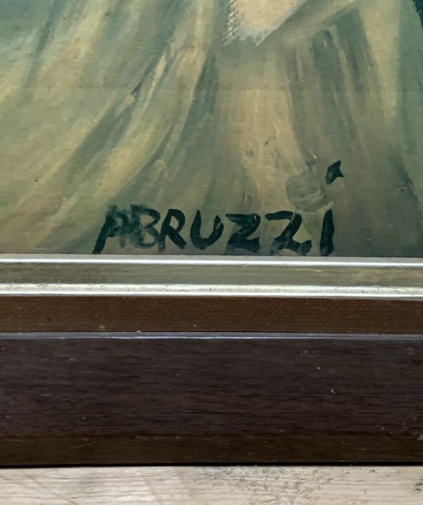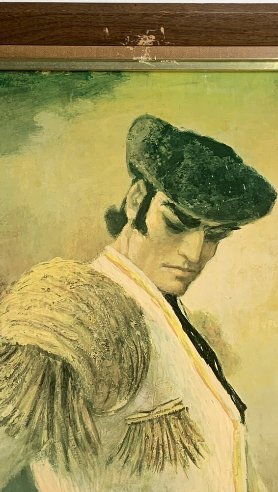 Large, striking depiction of a Spanish or Mexican Matador. The artist has given a certain 3-dimensionality by using heavy brush strokes in places to create significant texture. Framing could do with some restoration. Perfect centerpiece for the discerning decorator! I have attached an image of the signature in comparison with 3 additional signatures Also attributed to Abruzzi (Harold Stephenson). There is, as you may judge for yourself, rather decidedly a wide range in the written forms. I believe this painting to be original and authentically Abruzzi, but you must make your own decision based upon the photos as this is a final sale. It must be so as fragile irreplaceable artworks cannot be shipped willy-nilly around as I’m sure you will agree. The original paper backing has been replaced.