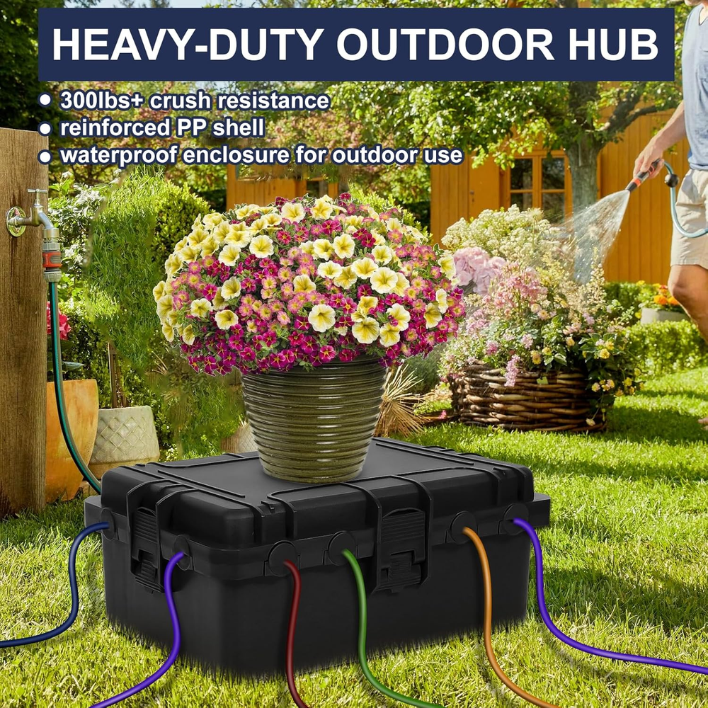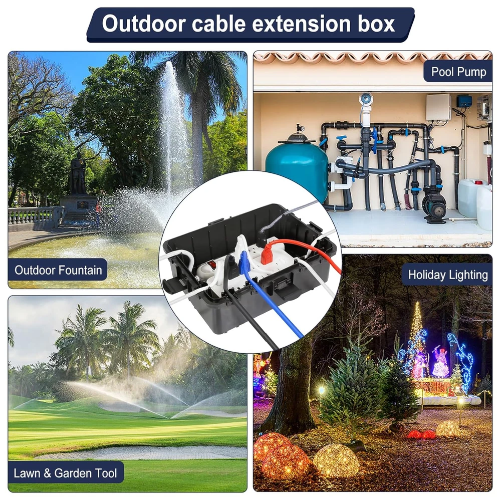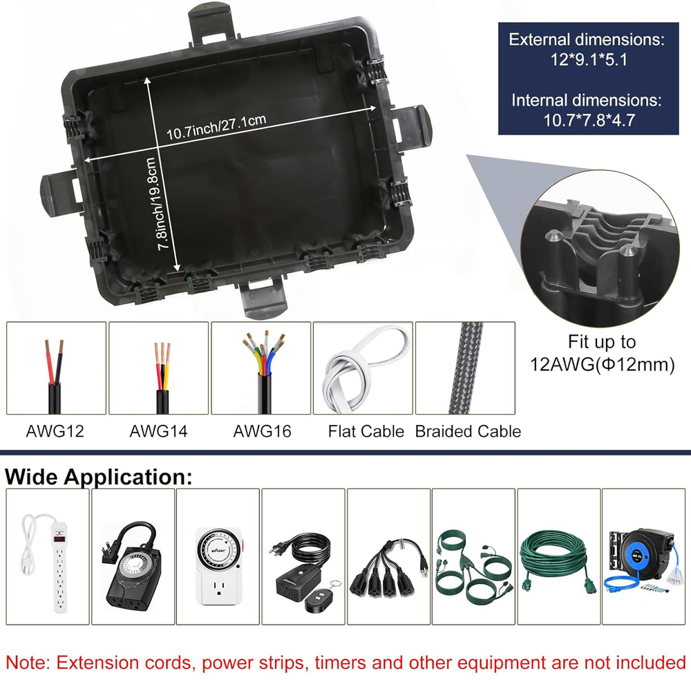 Store New Arrivals Add to Favorite View Feedback Contact Large Outdoor Electrical Box Waterproof, IP54 Extension Cord Cover Weatherproof Outdoor Outlet Covers, Protect Power Strip, Timer Outlet, Plug, Socket, Holiday Light, Black (12 x 9X 5 inch) Description Item model number DE-OUTD-ECC-BK Style Modern Color Black Product Dimensions 9.1"D x 12"W x 5.1"H Material PP Plastic 【Effective Protection】Continuously protect indoor and outdoor wiring connections. Large size (12×9.1×5.1 inches external / 10.7×7.8×4.7 inches internal) with 8 cable ports. Safeguards power strips, extension cords, surge protectors, timer sockets, large adapters, above ground pool accessories, camping gear, and EV chargers 【Heavy Duty Outdoor Outlet Cover】Made of reinforced PP material. It will not be damaged even if it falls from a height, and can withstand 300 lbs. Suitable for harsh outdoor environments, waterproof, and resistant to snow, rain, sand, dust, and dirt. Continuously protect outdoor connections from electrical hazards 【IP54 Waterproof Rating】After rigorous testing, the outdoor distribution box has 4 snaps, 8 cable clamps and 8 rubber gaskets, 2 Velcro straps and multiple cable ties compatible with AWG12/14/16 wires, braided cables and flat wires, and the rubber seal can well prevent moisture from entering 【Multi Scene Use】Suitable for a variety of indoor and outdoor applications, including lamps and garden utensils, garden tools, Christmas holiday lighting, landscaping, hot tubs, pool pumps, fountains, beaches, outdoor camping, electric vehicle charging 【Easy to Use and Wall Mounted】Put the connector into the safety sealed box and clamp the wires with the clips. There are reserved hanging holes at the bottom of the outdoor waterproof electric box for easy hanging. You can put it on the ground or easily hang the box on the wall Product description 1 Lawn lrrigation 2 Camping 3 Swimming Pool 4 Garden Tools 5 Holiday Lights ABOUT US We offer the best prices around on high quality products. Our E-store includes media such as books, movies, music and games while offering electronics, toys, sporting apparel, clothing, tools, general home, garden items and more. SHIPPING We are always working hard to ensure your package arrives as soon as possible. Please understand that some factors like weather, high postal traffic, and the performance of shipping companies are outside of our control. We offer free shipping to the lower 48 states and ship within 2 business days of payment, usually sooner. We do not accept P.O. Boxes. Please provide a physical address. For shipping outside of the continental USA, we only use eBay's Global Shipping Program.The item is shipped to KY and then sent to the rest of the world. International customers are responsible for all duties and taxes. Continue to check out in order to calculate costs for shipping the item to your country. Messages regarding eBay's Global Shipping Program MUST be directed at eBay EXCLUSIVELY. RETURNS We offer a 30-Day Return Policy on items which you are not completely satisfied with. You have the option for a full-refund or an exchange of the item. No returns are available on items shipped outside of the USA. PAYMENT We accept PayPal. CONTACT US This page content is yet to come Please ad us to your favorite seller and visit again later Thank You CUSTOMER SATISFACTION We try our very best to make sure every customer is completely satisfied. If there's a problem, message us! We're happy to help. WE ACCEPT Copyright © 2021 AutoDS. | All Rights Reserved