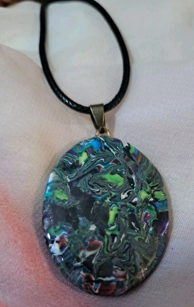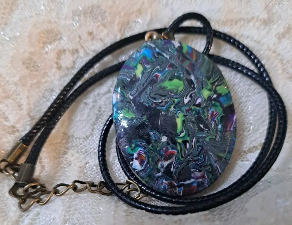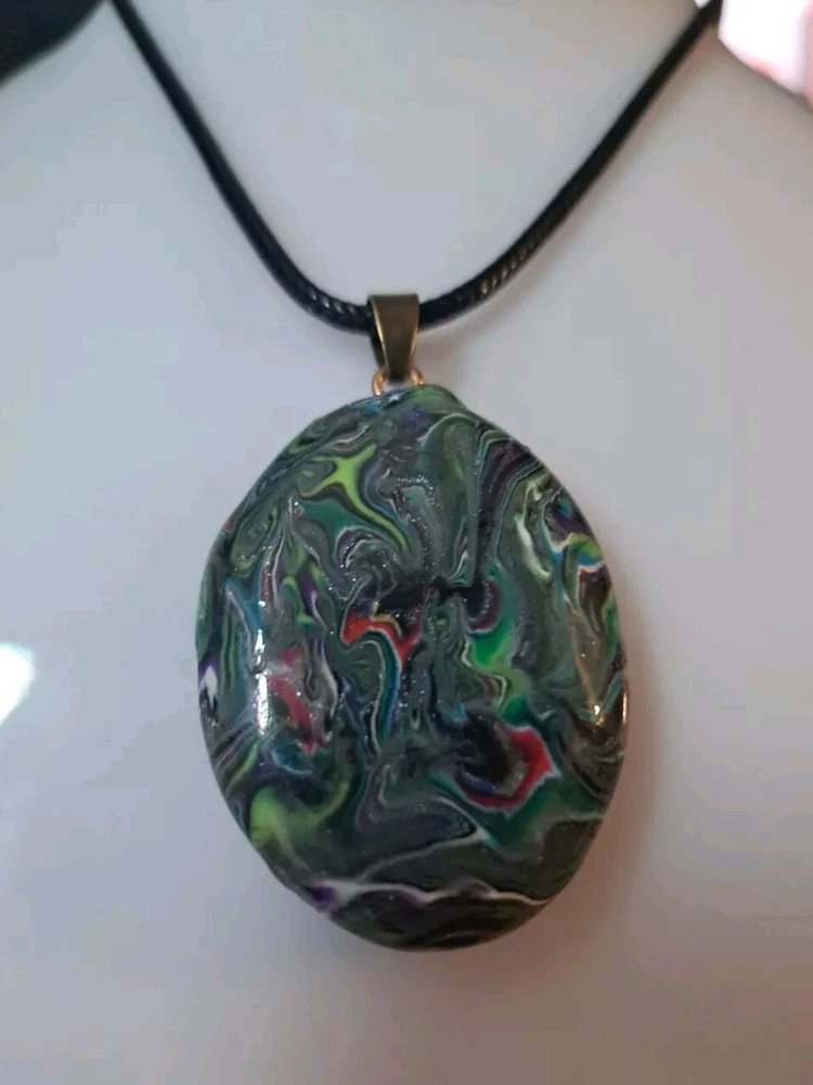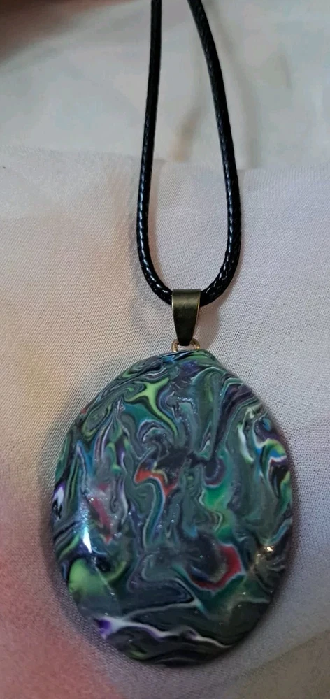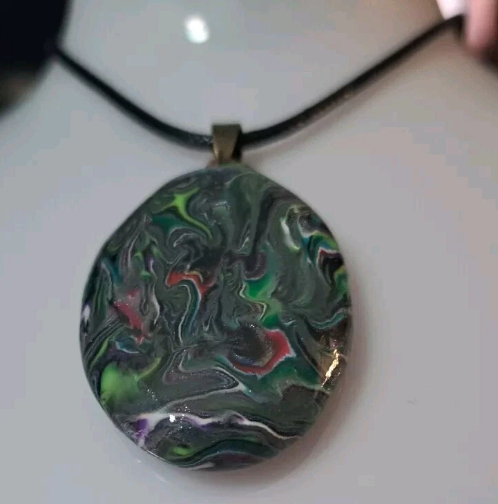 This unique necklace features a beautiful oval pendant with an abstract art pattern that is sure to catch the eye. The pendant is suspended on a waxed cord necklace with brass tone findings that is adjustable and reversible, allowing for a personalized fit. The lobster closure ensures a secure clasp, while the handmade charm adds a touch of artistry to the piece. The necklace is perfect for those who appreciate beauty, art, and fantasy, and it makes a great gift for family and friends. The multicolor design adds a touch of color to any outfit. This necklace is a must-have for anyone who loves unique and handcrafted jewelry. Custom requests are welcome. While the shape can be recreated, the colors and pattern can be different. Please contact the seller for any additional information. Thank You!