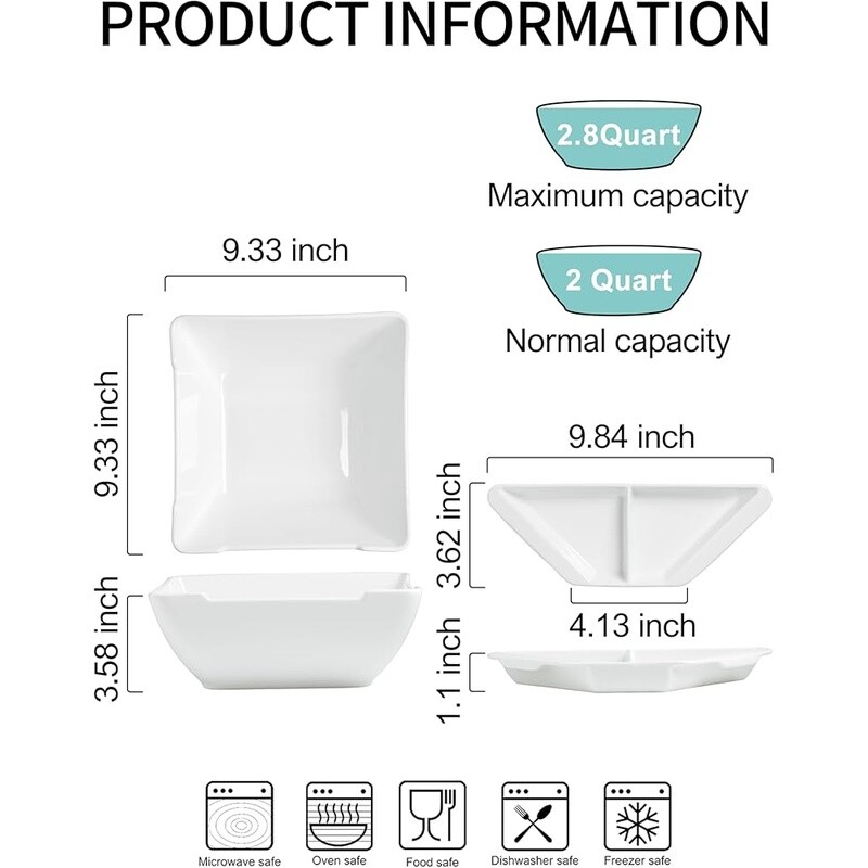 You may also like Crinkle Cut Shipping Tissue Paper Shred 10 lb Packing Filler Durable Recyclable 43.72 USD 46.02 USD Free shipping 5% off Stackable Storage Containers 9L Clear Bin Set W/ Clip Lock Handles 8 Pack New 194.91 USD 205.17 USD Free shipping 5% off Multipurpose 3 Door Enclosed Storage Cabinet Easy Assembly Home Office New 57.48 USD 60.5 USD Free shipping 5% off Baby Bottle Warmer Breast Milk Food Heater Universal Safe Easy Nurturing Plastic 87.98 USD 92.61 USD Free shipping 5% off Vanity Mirror W/ Wireless Charging 3 Color Lights 10X Magnification Makeup New 46.92 USD 49.39 USD Free shipping 5% off 2 Tier Coffee Bar Organizer Countertop Storage Rack W/ 6 Hooks & Rotating Top US 42.73 USD 44.98 USD Free shipping 5% off Ah So Wine Opener Vintage Corkscrew Leather Case Two Prong Tool Gift Wine Lovers 83.11 USD 87.48 USD Free shipping 5% off Carbon Steel Non-Stick Stir Fry Pan/Wok Easy Clean Soft Handle Healthy Cooking 27.81 USD 29.27 USD Free shipping 5% off Handwoven Rattan Storage Basket W/ Lid Square Washable Durable Stackable Brown 187.71 USD 197.59 USD Free shipping 5% off Unique Hippo Figurine Candy Dish Storage Bowl Decorative Resin Art Home Office 43.92 USD 46.23 USD Free shipping 5% off Stainless Steel Frying Pan Set Nonstick Induction Safe Titanium Ceramic Skillet 100.92 USD 106.23 USD Free shipping 5% off Two-Tier Metal File Cart Adjustable Shelf Locking Wheels Easy Setup Storage New 49.1 USD 51.68 USD Free shipping 5% off About this item INNOVATIVE BUILT-IN DIPPING TRAY DESIGN: Host a party night with our magic layered bowl. The chips stay crunchy while queso stays gooey. Hot spinach dip & chilled salsa coexist peacefully! LARGE CAPACITY & SIZE: With a wide mouth of 9. 33" diameter and a capacity of 2. 8 Quart, this salad bowl is large enough to provide ample portions for your party guests. It is ideal for serving large salads, fruits, soups, appetizers, noodles, snacks, popcorn, etc. This ceramic mixing bowl is also deep enough that you can stir salads or pasta at will without spilling. CLEVER DIPPINGT BOWL DESIGN: The dipping bowl is securely nested over the serving bowl, allowing you to easily separate different foods without messing up or interfering with the staple food area, adding a convenient touch to your dining experience. It can also be taken apart and used alone. There are 2 compartments for different types of food. You can serve salsa, tomato sauce, mashed potatoes, icing dips, guacamole, spicy sauce, nuts, fruits, and various appetizers. PRO-GRADE PORCELAIN: This multi-purpose serving dish is made of high-quality porcelain material, lead-free, scratch-resistant and more sturdy than plastic. The smooth glaze makes it easy to clean in hand-wash or dishwasher. It is also microwave, oven and freezer safe. WIDELY USE: With its classic white color and clean minimalist lines, this chip and dip bowl is the perfect gift for any food enthusiast or home chef. Whether it's for a Housewarming party, Wedding, Birthday party, Thanksgiving, Christmas dinner, buffet or other special occasion, this large salad bowl will be greatly appreciated. › Bowl Material: Porcelain Number of Pieces: 1 Brand: Color: White Style: Square You may also like Cordless Caulking Gun Battery Powered 21V Electric No Drip 4 Speed 300ml New 45.11 USD 47.48 USD Free shipping 5% off Carbon Fiber Nylon Filament 1.75mm PA6 CF 3D Printer Industrial Engineering 1kg 54.99 USD 57.88 USD Free shipping 5% off Portable Steam Sauna Home Spa Full Body Tent W/ 1500W Steamer Remote Chair New 78.95 USD 83.11 USD Free shipping 5% off Rechargeable Wall Mounted Lighted Makeup Mirror 10X Magnifying 3 Color Lights US 45.04 USD 47.41 USD Free shipping 5% off 15 In Cast Iron Skillet Nonstick Versatile Cookware Assist Handle Oven Safe New 56.32 USD 59.28 USD Free shipping 5% off Rechargeable Wall Mounted Makeup Mirror 8 Inch Dual Sided 1X 10X Dimmable Light 53.57 USD 56.39 USD Free shipping 5% off Simple Design Computer Writing Desk W/ Shelves Durable Compact Easy Assembly New 60.41 USD 63.59 USD Free shipping 5% off 2-Slice Toaster Extra Wide Slots Bagel Function Breakfast Kitchen Appliance New 27.92 USD 29.39 USD Free shipping 5% off 25Ft 10Gauge Heavy Duty Outdoor Extension Cord Waterproof Lighted End 15Amp SJTW 39.64 USD 41.73 USD Free shipping 5% off 1/4 Drive Impact Socket Set 56 Pieces SAE Metric 6 Point Cr-V Ratchet Extension 46.92 USD 49.39 USD Free shipping 5% off Indoor Panini Press Grill Nonstick Sandwich Maker Easy Clean Healthy Cooking New 27.49 USD 28.94 USD Free shipping 5% off Multipurpose Office Computer Desk W/ Keyboard Drawer CPU Storage Writing Table 66.86 USD 70.38 USD Free shipping 5% off