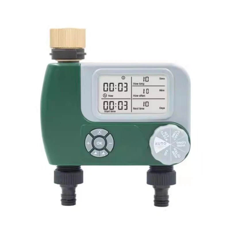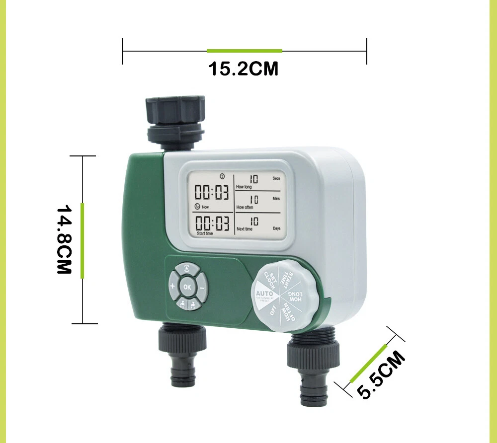 Large screen display irrigation controller dual outlet solenoid valve timer waterer household micro sprinkler drip irrigation waterer Upgrade Faucet Connector, provide more tight seal and prevent water leaking problem. Built with high quality materials & water-resistant construction. The orbit single-dial water timer will turn your hose faucet into a programmed sprinkler system in Min. With a large digital display, oversized dial and simple controls, programming is fast & easy. Connect the controller with water hose and set how often and how long to water, really effort and time saving in garden management. You are not worried about forgetting to water plants or forgetting to turn off faucet. Powered by 2 * AA batteries(not included), it is low power consumption and provides a long lifespan. This automatic water timer makes your garden irrigation system intelligent and smart.