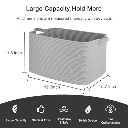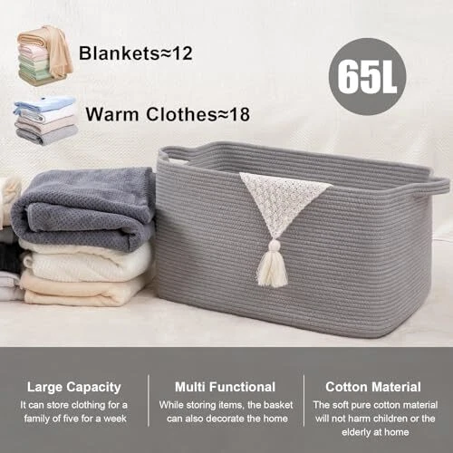 Return Policy Fast Delivery Trusted seller 65L Large Storage Basket, Cotton Rope Woven Blanket Basket, Toy Basket for Baby Room, Basket for Storage in Living Room, Grey Product Description Large Storage Basket: 65L large storage basket, perfect for throwing pillows, cushions, blankets, comforters, toys, and clothes. Keep the toy basket in the kid's room, family room, or any room in the house that could use extra storage: fits on a closet shelf, bookshelf, etc Natural Cotton: high-quality large blanket basket is made of cotton rope, No Nasty No Disgusting Smell, safe for Intimate Clothing. In addition, this woven basket for storage has no sharp edges and a hard surface, safe for kids, elders, and pets Double Sturdy Handles: We use high-grade cotton rope as raw material, which makes the storage baskets better wear resistance; In addition, the handle of this large basket has a unique design and is wrapped around with thick double-layer suture rope Collapsible Baskets: These rectangular storage baskets for organizing are foldable, which is easy to move and take away, simply fold the blanket basket down flat for space-saving storage when not in use or to transport Important Note: The premium woven storage baskets are packed compact for shipping, you may find some crease on the item, you can fully stuff the pillow basket with towels or clothes to restore shape. Or fast smoothing the creases by steaming or Ironing Shipping Returns Payment Shipping Shipping is FREE to all addresses other than APO/PO boxes in the lower 48 states. All our stock ships from US-based warehouses. Shipped via USPS or UPS (depending on location and package weight) Unless stated otherwise, all orders will ship within 24-72 hours of your payment being processed. Check our feedback to see the great reviews of FAST shipping we offer. Returns Seller does not accept returns Payment We currently accept payment via eBay managed payments only. Once payment is cleared, we will dispatch your shipment within 1-3 business days. Please refer to the "Shipping" tab for more information regarding shipping speed to your destination.