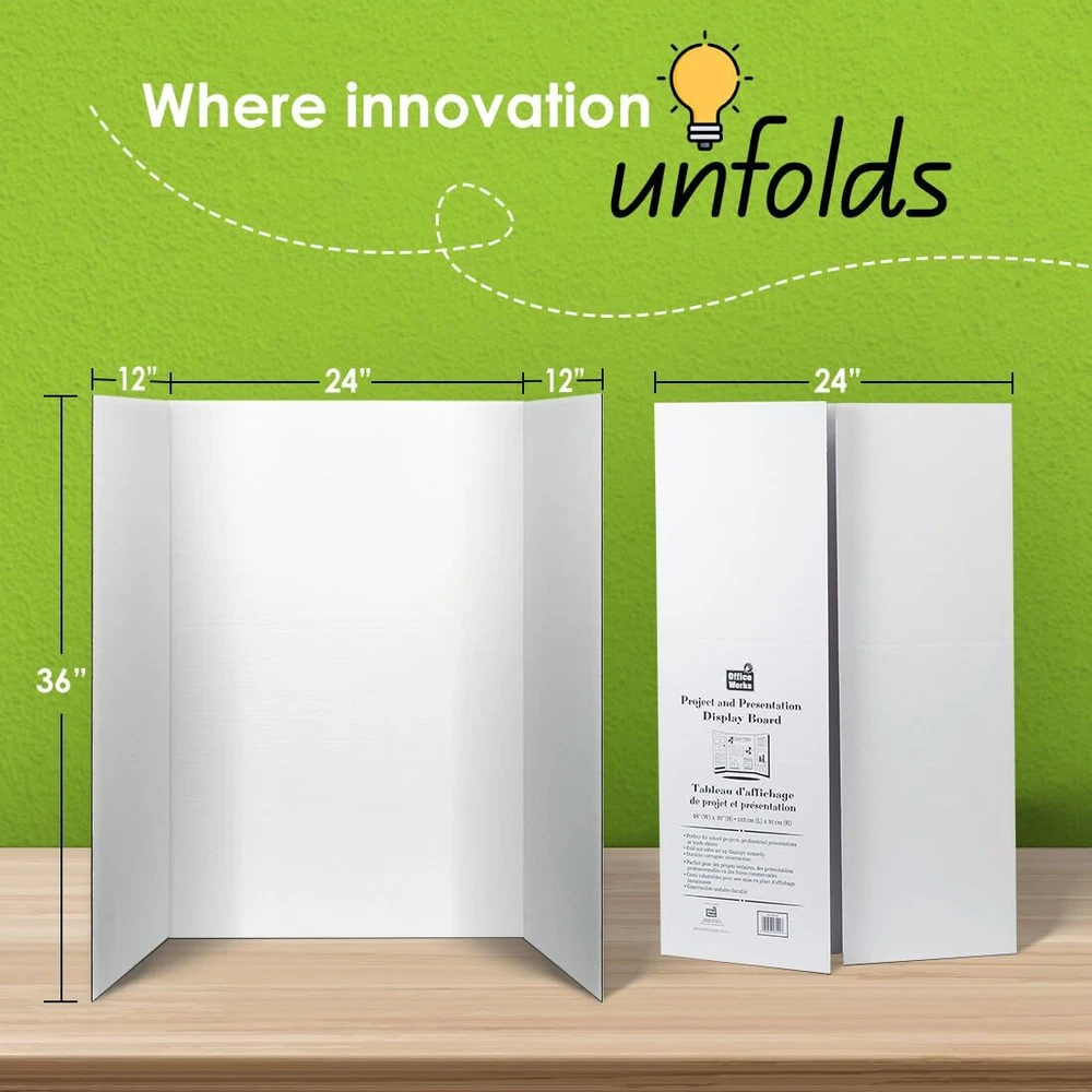 Unleash your creativity with the Desk Tech Large Tri-Fold Presentation Board. Available in multiple color and pack options, this versatile display board is perfect for students, teachers, professionals, and anyone who needs to display their ideas in a clear and organized manner. With a generous size of 36" x 48", our tri-fold poster board provides ample space for your posters, charts, graphs, artwork, and other visual aids. Made from superior-quality, sturdy, acid-free corrugated paper, it is designed to withstand frequent use and last for a long time. The tri-fold design allows for easy setup and transportation, making it ideal for school projects, exhibitions, workshops, and presentations. Whether you're presenting a school project or showcasing your professional work, our folding board is the perfect solution for your needs. So why wait? Take your presentations to the next level with the Desk Tech Large Tri-Fold Presentation Board. MULTIPURPOSE DISPLAY BOARD: Our folding board is suitable for various purposes, including displaying posters, charts, graphs, artwork, and other visual aids. Whether you're presenting at a science fair or an office meeting, our board has got you covered. SMOOTH SURFACE: Featuring a smooth surface, our tri-fold poster board delivers a professional display for your content. It offers a pristine canvas for your ideas to flourish and enriches the visual impact of your presentations even after multiple uses. DURABLE PRESENTATION BOARD: Constructed from high-quality, acid-free corrugated paper, our trifold display board offers durability and longevity. Safeguard your projects during presentation and ensure they remain intact for an extended period. LARGE DISPLAY AREA: Unfolding to 36" x 48", our presentation board provides ample display space, perfect for diverse applications such as school projects, exhibitions, and presentations, ensuring your ideas are showcased effectively in any setting. EASY PORTABILITY: Designed with a tri-fold mechanism for easy setup and portability, our board caters to busy professionals and students. The lightweight build ensures easy handling, making it perfect for those on the move.