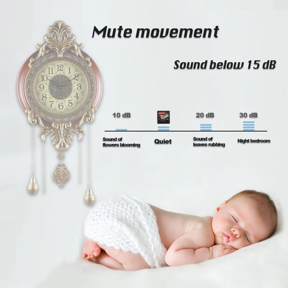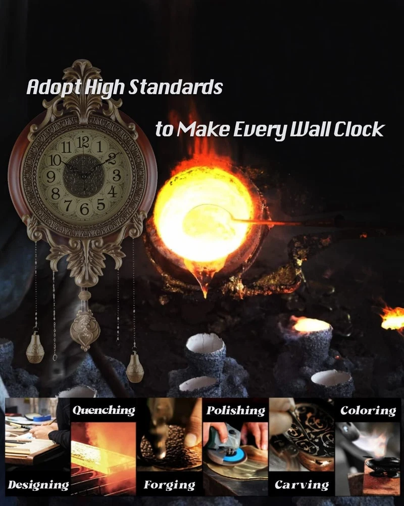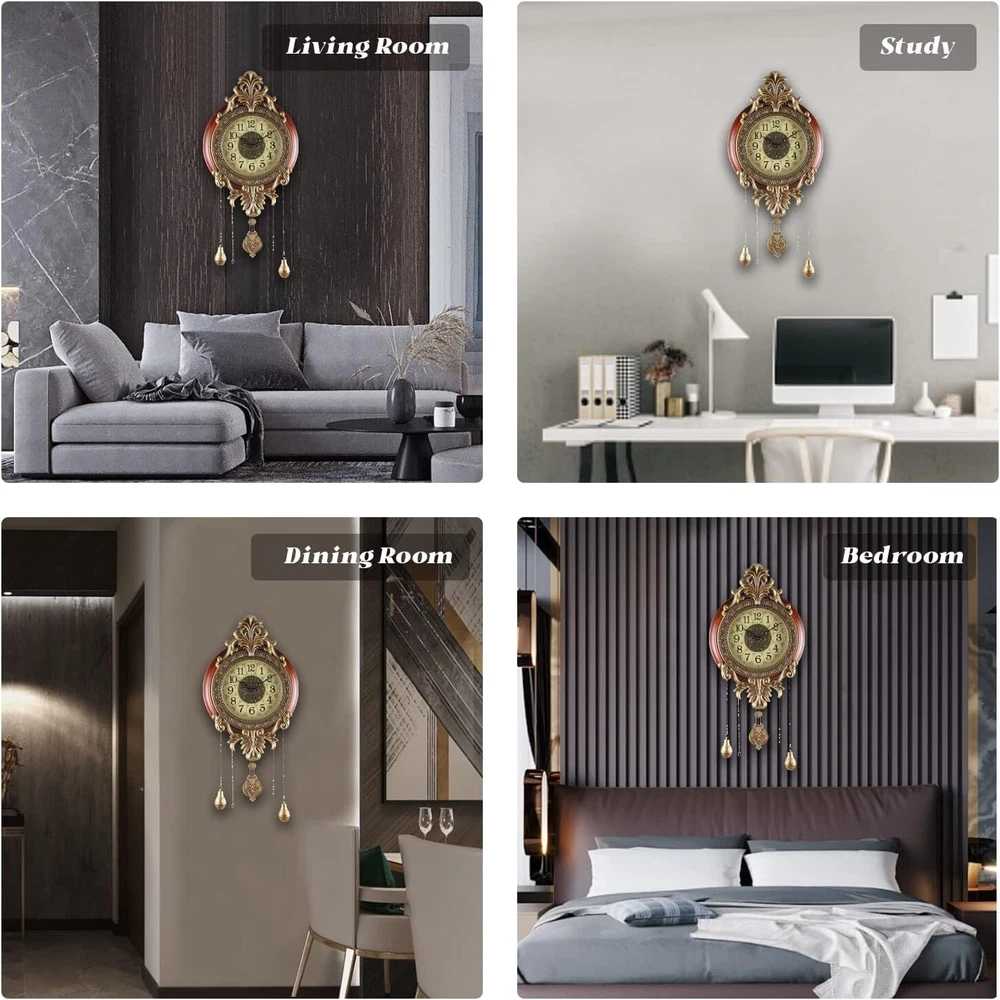 Large Wall Clock with Pendulum, Real Wood Retro Style, Battery Operated, Vintage Royal Decor for Home Living Bedroom DECORATION: You'll Get Many Compliments for This Piece of Art, Elegant and Sturdy, Large Size, Metal Carved Decoration, Finished in Victoria Retro Metal Flower Workmanship with Real Wood Circle to Complement Your Home Decor. MATERIAL: Made of Real Solid Wood and Wrought Iron, Analog Time Display, Swinging Pendulum, Scanning Second hands, Imported Mechanism, Long Lasting SATISFACTION GUARANTEEd Life. Silent, for a Quiet Environment. DIMENSIONS: Dial 14", Top to Bottom without Pendulum ", Top to Bottom with Pendulum 28"; DESIGN: Quartz Movement, Battery Operated. Two-Battery Independent Design, one for time, the other for the pendulum. You can un-install the pendulum battery if the pendulum makes you feel dizzy (For the safety of air transportation, 2*AA Batteries Not Included). satisfaction - 12 s of satisfaction included, please contact me if any question. We Strive to Offer Customers Amazing Service.
