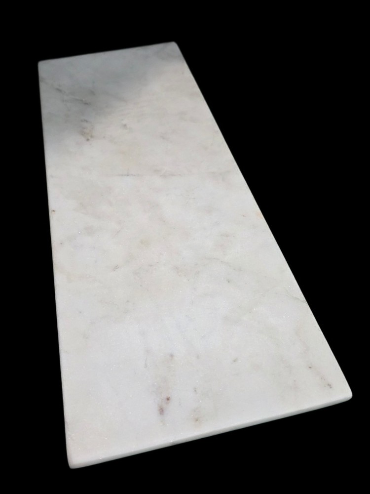 Elegant solid marble slab with natural veining, perfect for both functional and decorative use. This versatile board can serve as a pastry board, cheese or charcuterie serving tray, cutting surface, or countertop décor piece. Material: Solid white marble with subtle natural veining Shape: Rectangular, flat polished surface Size: Approx. 15" × 6" Condition: Very good – no cracks or chips, only minor natural surface variations and light wear consistent with age. Marble boards are prized for keeping dough cool while rolling, serving cheese beautifully, and adding timeless elegance to any kitchen or dining table.