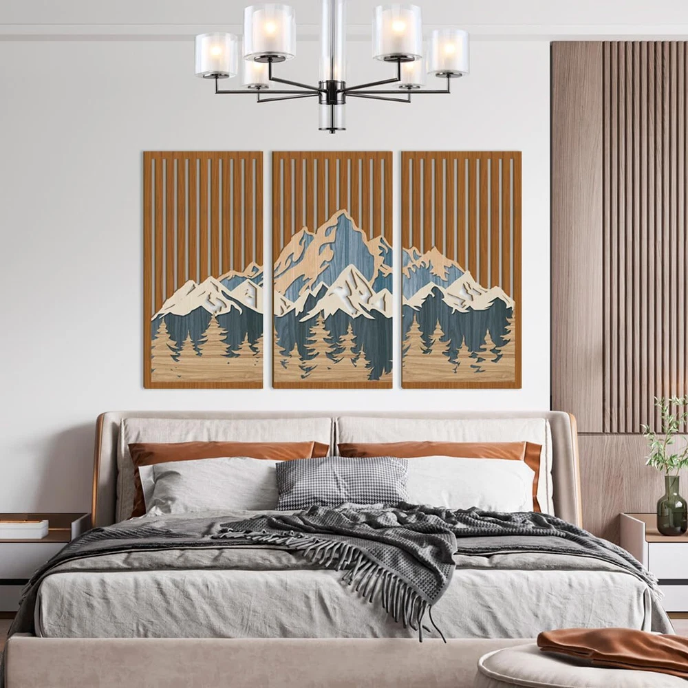 【Mountain Forest Wall Art】This set of wood mountain wall art is the perfect combination of hollow wood art and snow, towering mountains and dense forests, and its three-dimensional effect makes it more popular. Hanging on the wall makes your space full of mature and unique flavor. 【High-quality Material】Abstract snow mountain art wall decor is made of wood. We use advanced technology to make hollow formwork, which makes the snow mountain more three-dimensional. The nature wilderness painting is strong, not easy to fade and deform, polished smoothly, and does not hurt hands. 【Easy to Hang】The size of mountain art is about 40.64 * 81.28cm/16 x 32 in/pc, which is light and easy to hang on the wall. There are two serrated hooks on the back of the board. You can use nails to fix the mountain pictures wall decor, which is convenient for your installation and disassembly. Two silica gel transparent pads for vertical and horizontal balance are also provided. 【Wide Use】Large Mountains wall art is suitable for most home decoration styles, such as modern style, minimalist style, farmhouse style, log style and so on. It can decorate any space, such as living room, bedroom, dining room, home office, porch, etc., to create a mature artistic atmosphere. It is also a perfect gift for family and friends. 【】We are committed to providing customers with high-quality products and services. If you have any questions about the geometric mountain wood wall art for home you received, please feel free to us.
