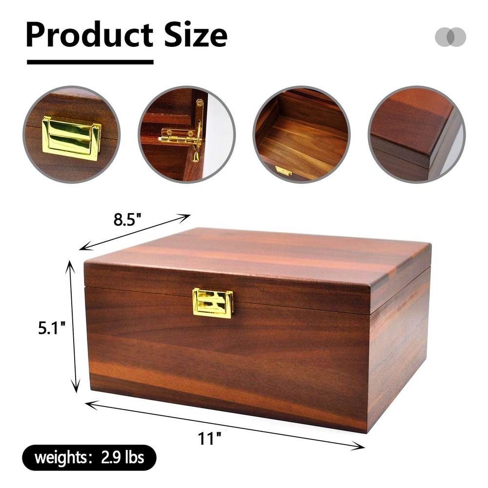 Large Wooden Storage Box with Hinged Lid, Wood Keepsake Chest, Perfect for Storing Souvenirs, Jewelry, Tools, Clothes, Recipes, Receipts, Small Accessories, etc, 11" x 8.5" x 5.1", Vintage Product Details Color: Vintage Brand: Itvexeme MPN: Acbox001 UPC: 749877312877 EAN: 0749877312877 Brand: Itvexeme Color: Vintage Material: Acacia Special Feature: Handmade, Hinged Lid, Retro Design Style: Retro Brand: Itvexeme Color: Vintage Material: Acacia Special Feature: Handmade, Hinged Lid, Retro Design Style: Retro Recommended Uses For Product: Jewelry Storage, Keepsake Storage, Recipe Card Storage Product Dimensions: 11"L x 8.5"W x 5.1"H Capacity: 288 Cubic Inches Closure Type: Hinged lid Water Resistance Level: Not Water Resistant Item Weight: 2.87 Pounds Opening Mechanism: Hinge Shape: Rectangular Pattern: Retro Number of Items: 1 Storage Volume: 128 Cubic Inches Number of Compartments: 1 Unit Count: 1.0 Count Item Package Quantity: 1 Material Feature: Durable, Handcrafted, Retro UPC: 749877312877 Manufacturer: Itvexeme Item Weight: 2.87 pounds Item model number: Acbox001 Special Features: Handmade, Hinged Lid, Retro Design Included Components: Hinged Lid, Storage Box Batteries Included?: No Batteries Required?: No Date First Available: May 14, 2025 HANDCRAFTED DESIGN: Beautiful acacia wood storage box featuring traditional handmade construction with a classic retro aesthetic. Large wooden storage box measures 11 x 8.5 x 5.1 inches. VERSATILE STORAGE: perfect for storing souvenirs, jewelry, tools, clothes, recipes, receipts, small accessories, etc CONVENIENT ACCESS: Equipped with a sturdy hinged lid that allows for easy opening and secure closing when not in use PREMIUM MATERIAL: Constructed from high-quality acacia wood known for its natural durability and distinctive grain patterns DECORATIVE APPEAL: Elegant wooden box that serves both as functional storage and an attractive decorative piece for any room Premium After-Sales Service: We offer a 24-month warranty to ensure the best service for you. If you encounter any issues, damages, or find the product unsuitable, We provide comprehensive after-sales support and will strive to resolve your concerns promptly.