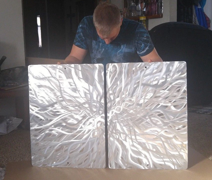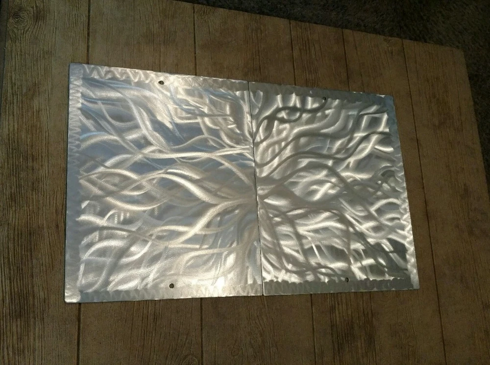 Metal art wall decor set of 2 panels. Polished 080 thick aluminum with a clear enamel finish on the front and back. Stainless steel standoff mounting hardware is included. Custom colors and sizes are available. Made in idaho. Large entryway art work. Can be hung indoors or outdoors. Sits 1" off the wall. Wall hanging decor. Set of two 20" tall 36" wide total 18" each. Shipped within 3-5 business days. Thank you for visiting our shop! Each piece is made to order hand drawn and hand cut original metal art work and sculptures. We can make any design to custom specifications. Everything is made in the USA Twin Falls Idaho. Our shop has two workers we are a husband and wife team that specialize in high end interior and exterior custom art work. Product Details: -Stainless steel standoff hardware is included - Packed with a thick cardboard wrapped in thick Styrofoam or bubble wrap - Easy to clean with a microfiber cloth. If pieces are left outside we recommend using a clear enamel each year to keep the piece protected - Does not require special lighting but the more light it has near it the brighter it will shine either sunlight or indoor lights - High quality materials not the thin cheap metal art you see in stores - Will last forever much better than decals they can be passed on to kids 50 years later -Can be hung with a nail or metal standoffs included - Easy to Hang -Clear enamel & acrylic automotive paint on the front and back -Thick 16g steel or 080 aluminum -Hand drawn original art -LED lighting can be added for an additional cost $125 if we buy and install the lights $25 if you send us the lighting. Lighting is not included in any signs it is an additional charge -Signs hang from standoff wall mounts or aluminum extrusion mounts -Larger pieces are packed and insured through fed-ex and are wrapped with 1/8" foam and 1" foam board Custom metal wall hanging art. Made to order home decor. Hand drawn and hand cut designs with 16 g steel or .080 polished aluminum (thicker metal can be used for an additional cost.) Custom designs and sizes available message us for a free quote! Our Shop Process: Our shop uses both High-Quality Steel and aluminum sheet metal hand drawn. Each piece can be made with aluminum instead if requested. Pieces are hand cut and polished with a sanding disc grinding patterns are put on the metal custom patterns can be requested. Our process produces a stunning one of a kind and captivating art piece. A matte finish can also be used if requested glossy finish of the metal. The patterns and automotive grade paint we use shows a depth and 3-D characteristic that isn't seen in most art pieces. We can also use a rustic finish, copper patina, heat patina any color or black if requested. High quality Automotive grade Clear enamel Gloss Coating ensures that pieces can be hung indoor and outdoor colors are vibrant with sun or indoor light the brightness changes depending on the light reflecting from the piece they look 3- Dimensional. If they have no light the color will be darker and the grind pattern will not show as well. We send mounting hardware with each piece or can weld it to a garden stake for additional cost. Custom Sizes and special requests Are our main Specialty Want a custom made artwork of metal made to specific dimensions? Message us today for a free quote. We make business signs, wedding decor, fabrication projects, trellis, gates, fire pits, panel sets and we can install led lighting if requested! Please message me with questions or requests we will help build a custom design if requested. Made with a thick 16 g steel not the thin tin found in stores not super heavy either can easily be hung with a nail. Metal standoff hardware is included the piece will sit at least 1/2" off the wall with a brushed stainless finish. Very classy and unique wall decor. Sturdy and handcrafted. Thanks for your interest