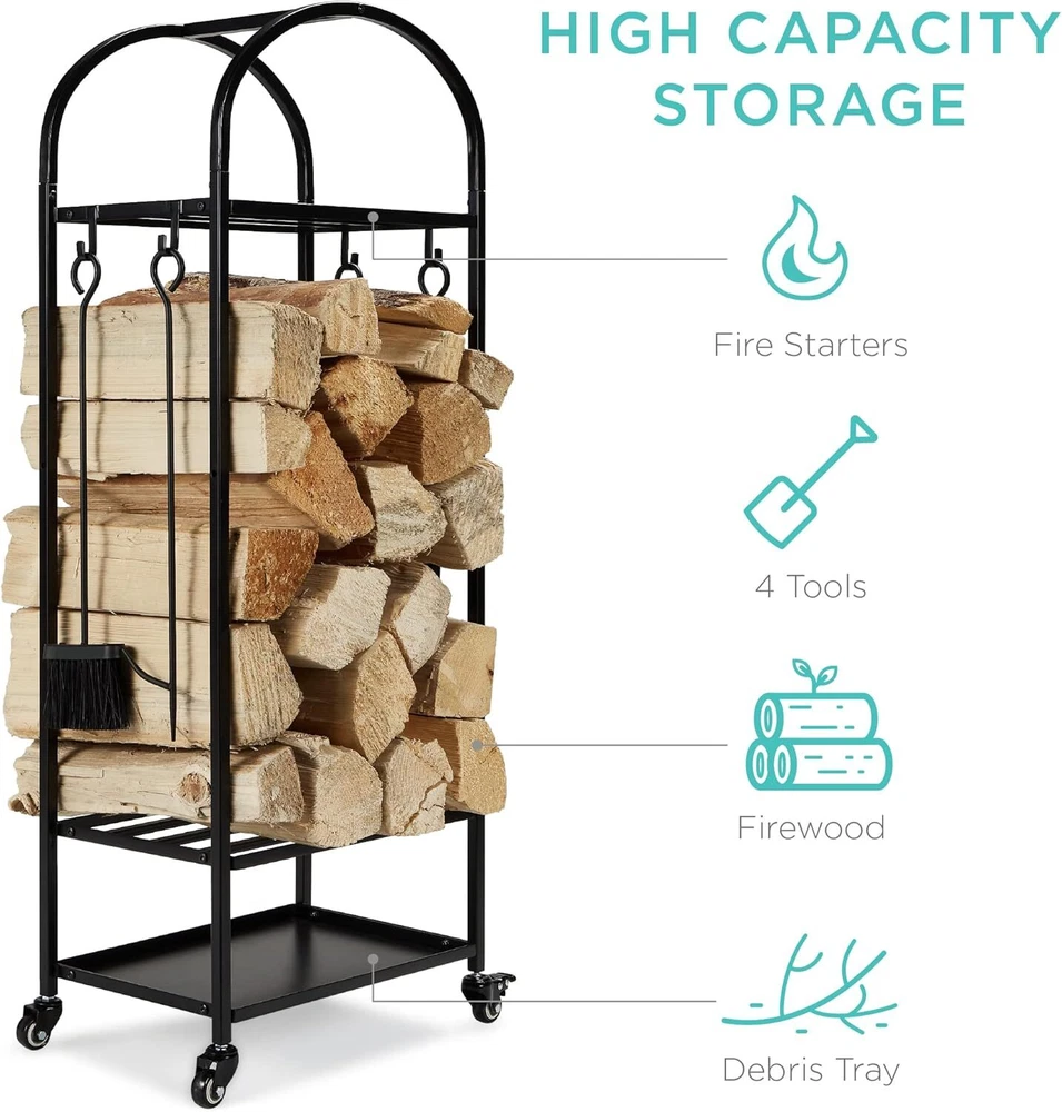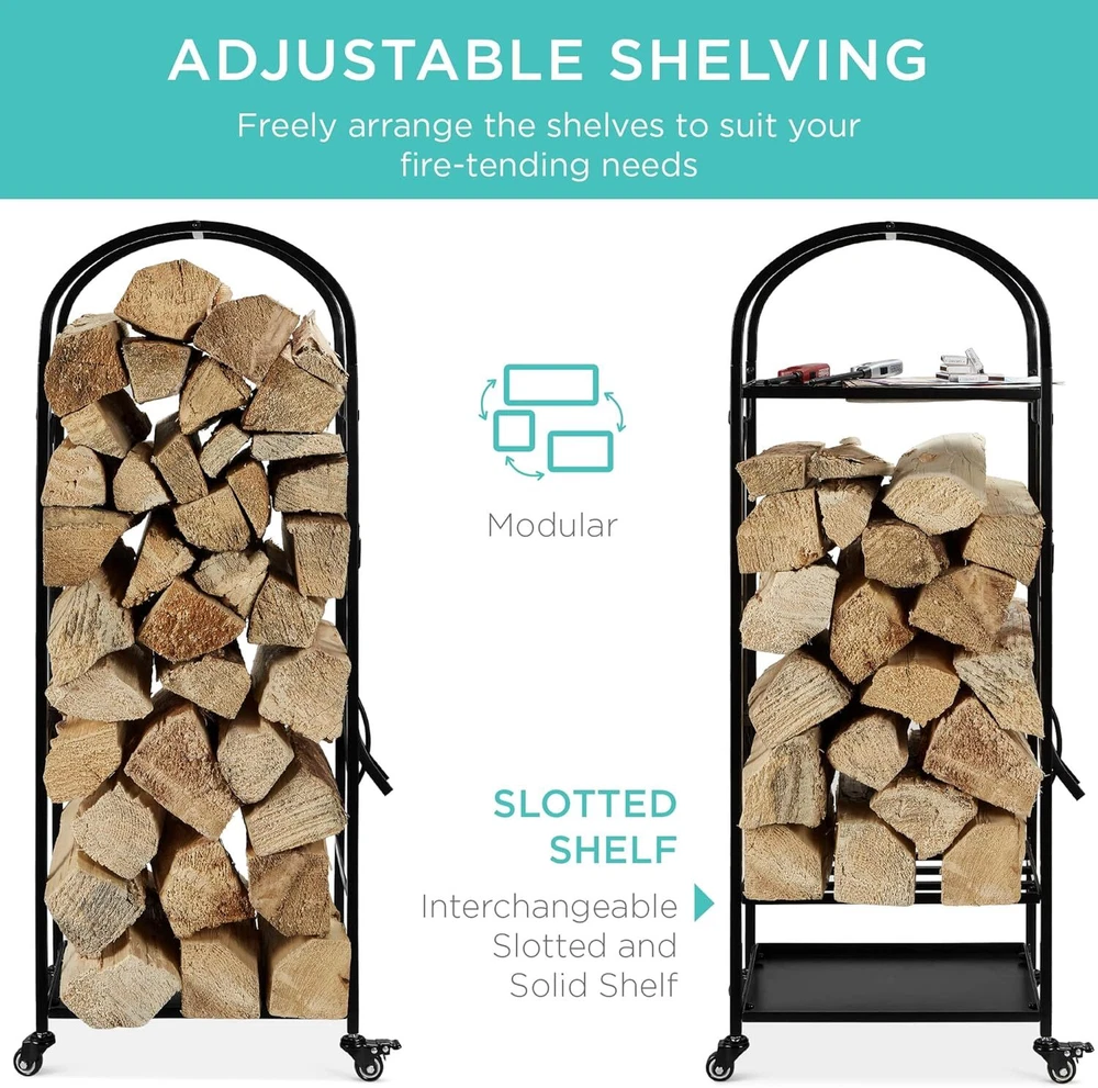 EASY MOBILITY: This firewood log rack comes with locking casters for easy placement, and a set of adjustable feet for added stability; easy installation means the choice is yours! SPACE MAXIMIZER: The 2-in-1 design provides 47.5 inches of vertical space for firewood storage while a set of built-in hooks conveniently hold your broom, shovel, poker, and tongs HIGH CAPACITY STORAGE: A three-tier shelf design lets you store ample firewood, kindling, and more with the massive 155 pound capacity distributed on three shelves ADJUSTABLE SHELVING: Modular shelving means easy adjustment; move the solid and slotted shelves to support heavier or lighter items and suit your needs DURABLE DESIGN: An all wrought iron construction with a weather-resistant powder coating makes this an easy addition inside & out; OVERALL DIMENSIONS: 18"(L) x 12"(W) x 47.5"(H); WEIGHT CAPACITY: 155 lbs. (Total) USA On Dec 4, 2024 at 23:54:48 PST, seller added the following information: