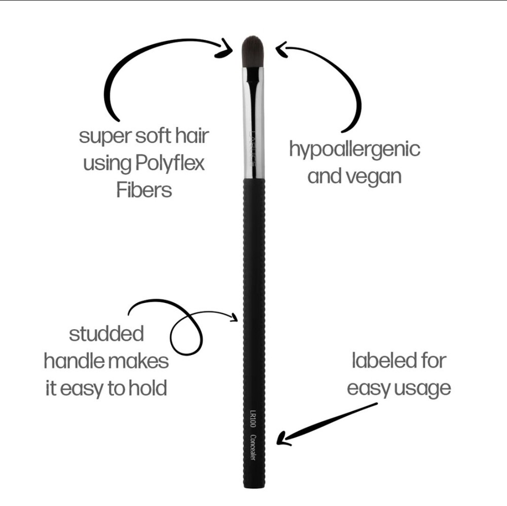 Laruce Beauty Makeup Brushes LR100 Concealer Brush *New*. •Super soft bristles using polyflex fibers •Hypoallergenic &Vegan •Studded handle makes it easier to hold •Brush name labeled on handle •Best used for-- liquid, cream, concealer, lipstick (and makes a great shader Brush for packing on eyeshadow on the lid). •Vegan, Cruelty Free, Hypoallergenic, Synthetic •Retails for $18 *New* #larucebeauty #makeupbrushes #brushes #concealerbrush #liquid #cream #eyeshadow #polyflexbristles #vegan #lr100