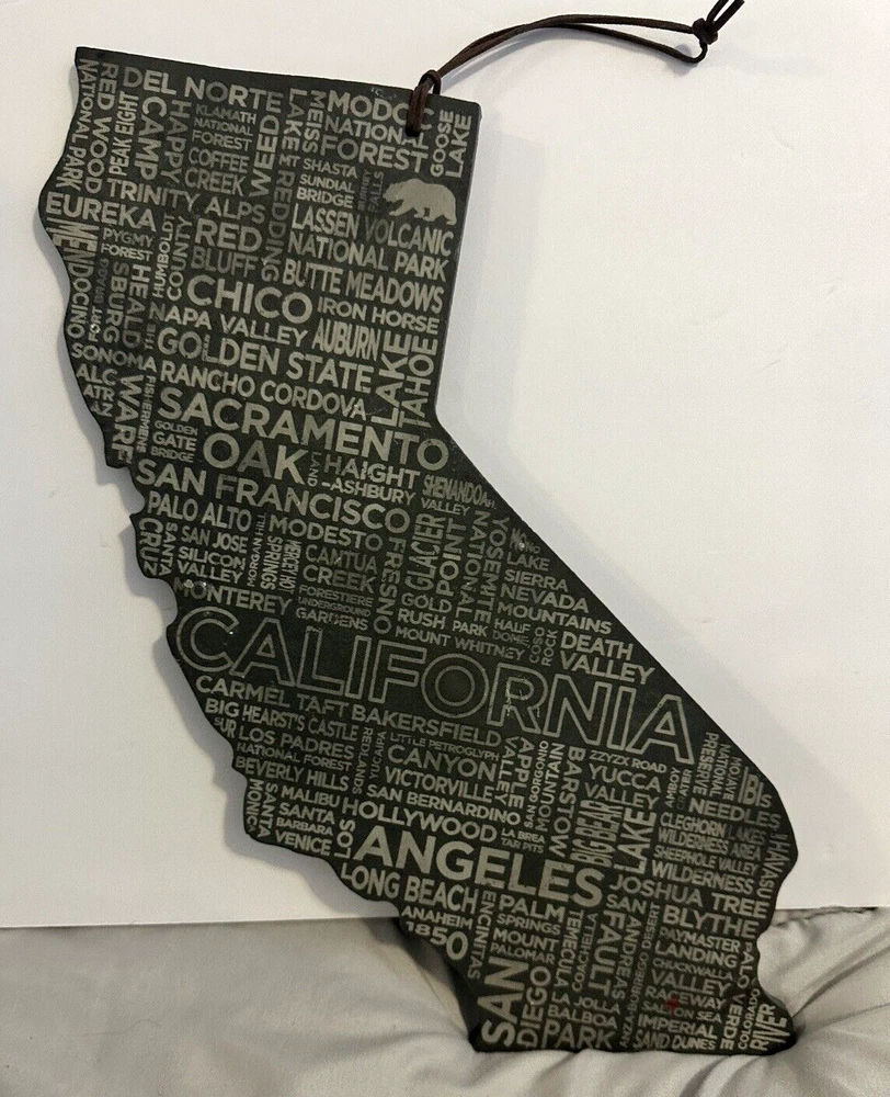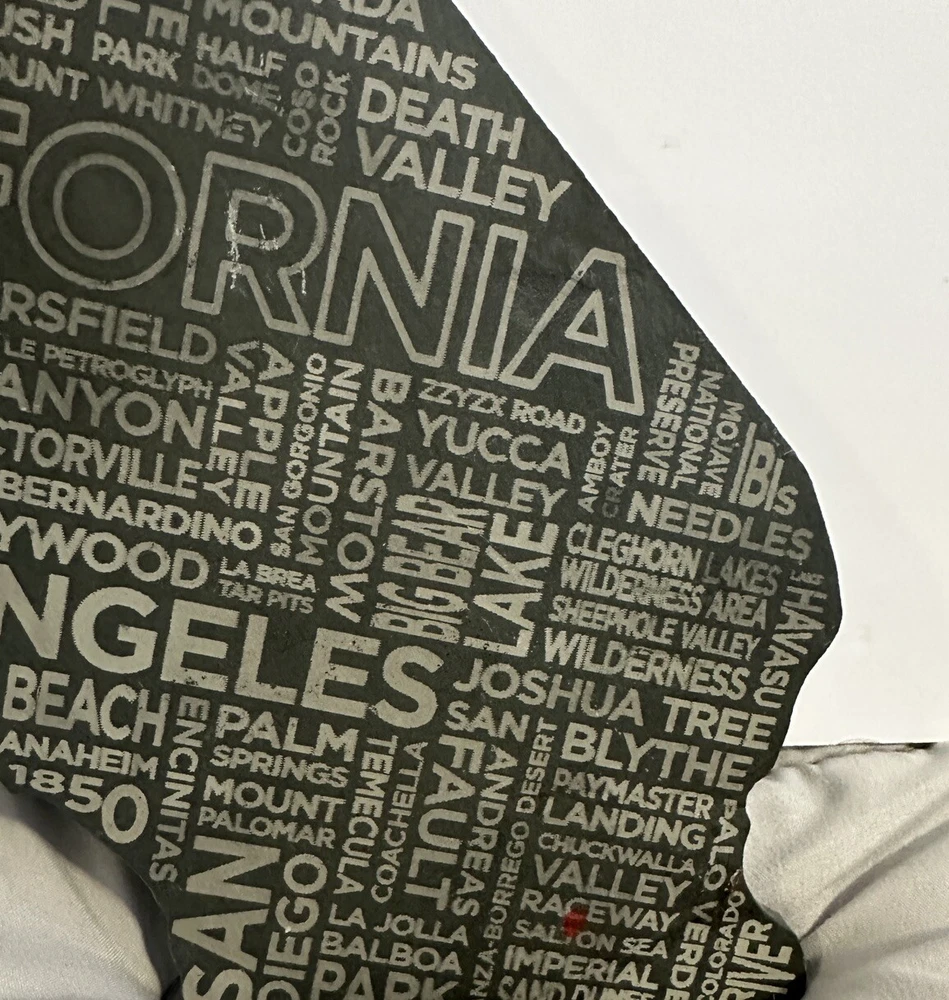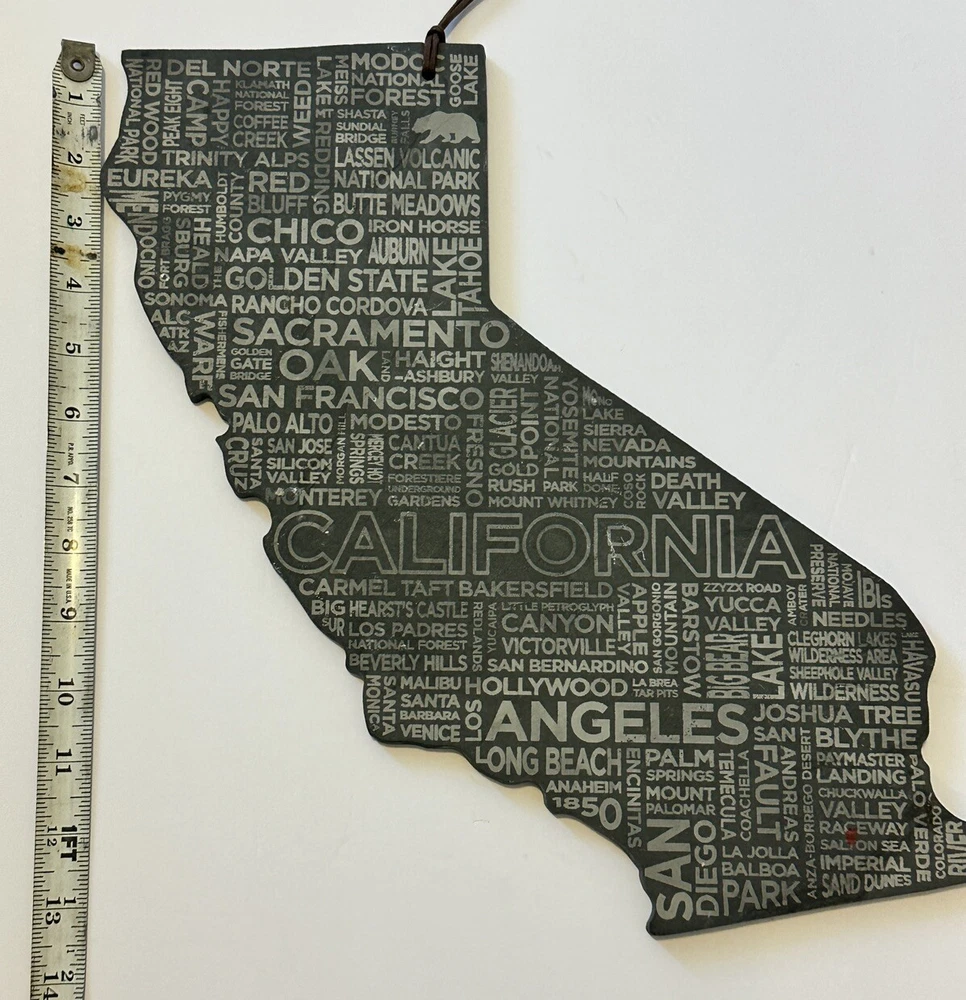 Heavy 2.5lb laser etched black slate cutout silhouette of the state of California with major cities engraved as the design. Can be use as a decorative wall art. Seeing similar items for sale as a cheeseboard or serving tray. Fun item for new Californian or a California native. Or unique cheeseboard collector. Measures about 13” long.