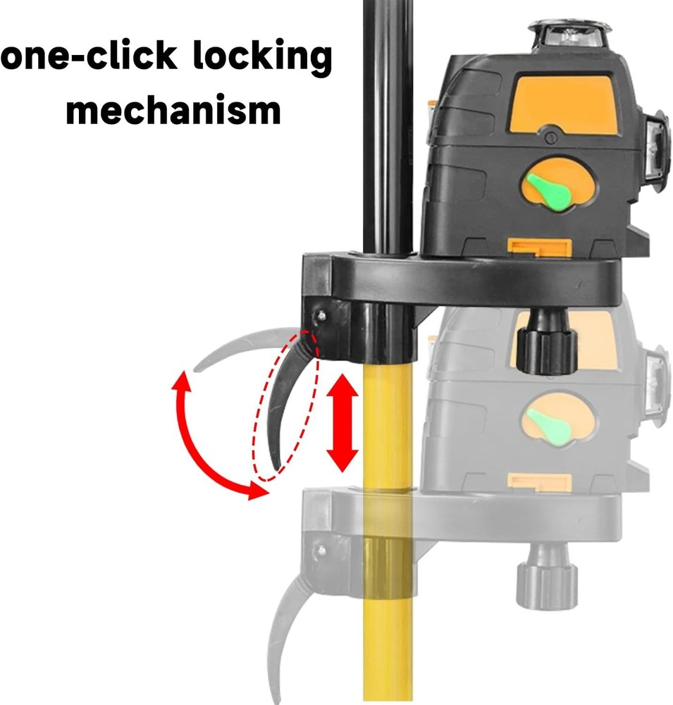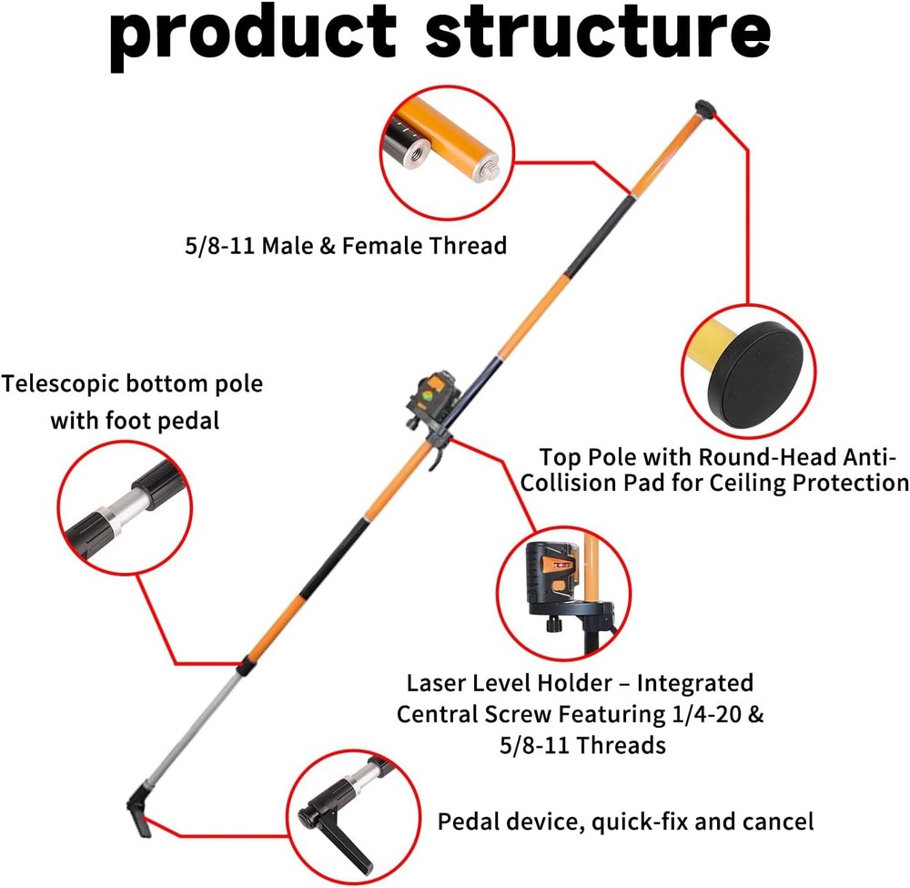 Product Description Adjustable Laser Level Height Rod – Up-Down Sliding, Horizontal Rotation & Adjustable Laser Holder 1. Versatile Adjustable Design with Sectional Extension Poles Equipped with sectional extension poles, this laser level rod allows you to easily increase or decrease the number of pole sections based on indoor ceiling height. Whether you’re working in a low room or a high-ceilinged space, you can quickly achieve your desired height to meet diverse leveling needs, eliminating the hassle of fixed-length limitations. 2. Sturdy Aluminum Alloy Construction for Reliable Performance Crafted from high-quality aluminum alloy, the rod boasts exceptional durability and load-bearing capacity. With a 32mm thick pole diameter, it stands firmly between the floor and ceiling (floor-to-ceiling installation) without wobbling, providing a stable foundation for your laser level. You can trust it to support your equipment securely during long hours of use. 3. Precise Positioning with Secure Locking Mechanism & Flexible Movement The rod features a built-in laser level holder in the middle, paired with a secure locking mechanism. This mechanism locks the holder in place firmly after adjustment, ensuring no accidental shifting for precise leveling. The laser level can move straight up and down along the rod to adjust height, and also rotate horizontally (diagonal movement is not supported) to cover different working angles. 4. Universal Compatibility with Dual Thread Sizes Designed with a central screw that includes both 5/8-11 and 1/4-20 thread sizes, this adjustment rod works seamlessly with laser levels of various brands and models. No need to purchase additional adapters—whether your device uses a standard 5/8-11 thread or a smaller 1/4-20 thread, it can be easily mounted for immediate use. 5. Hassle-Free Installation & Wide Indoor Application Thanks to its floor-to-ceiling design and sectional structure, the rod requires no complex tools for setup: simply assemble the needed number of sections, extend it to fit the room height, and lock it in place. It’s ideal for indoor projects like home renovation, ceiling installation, wall tiling, and more, making your leveling tasks faster and more efficient.