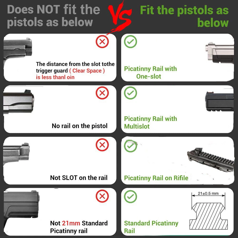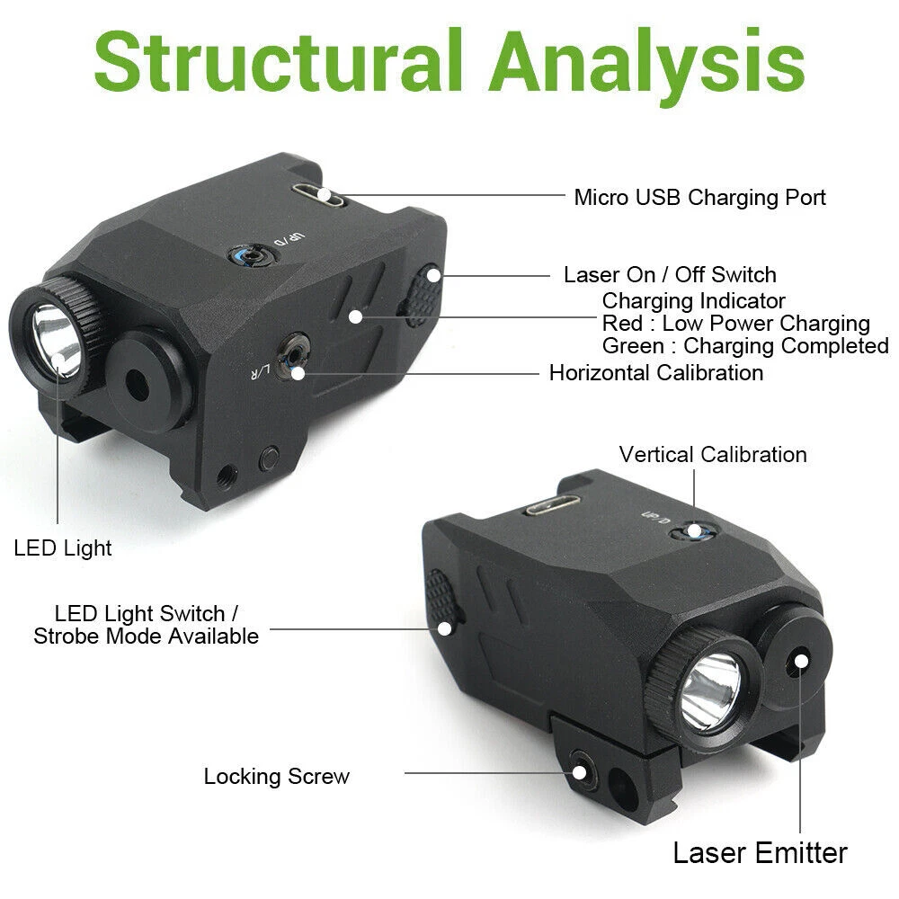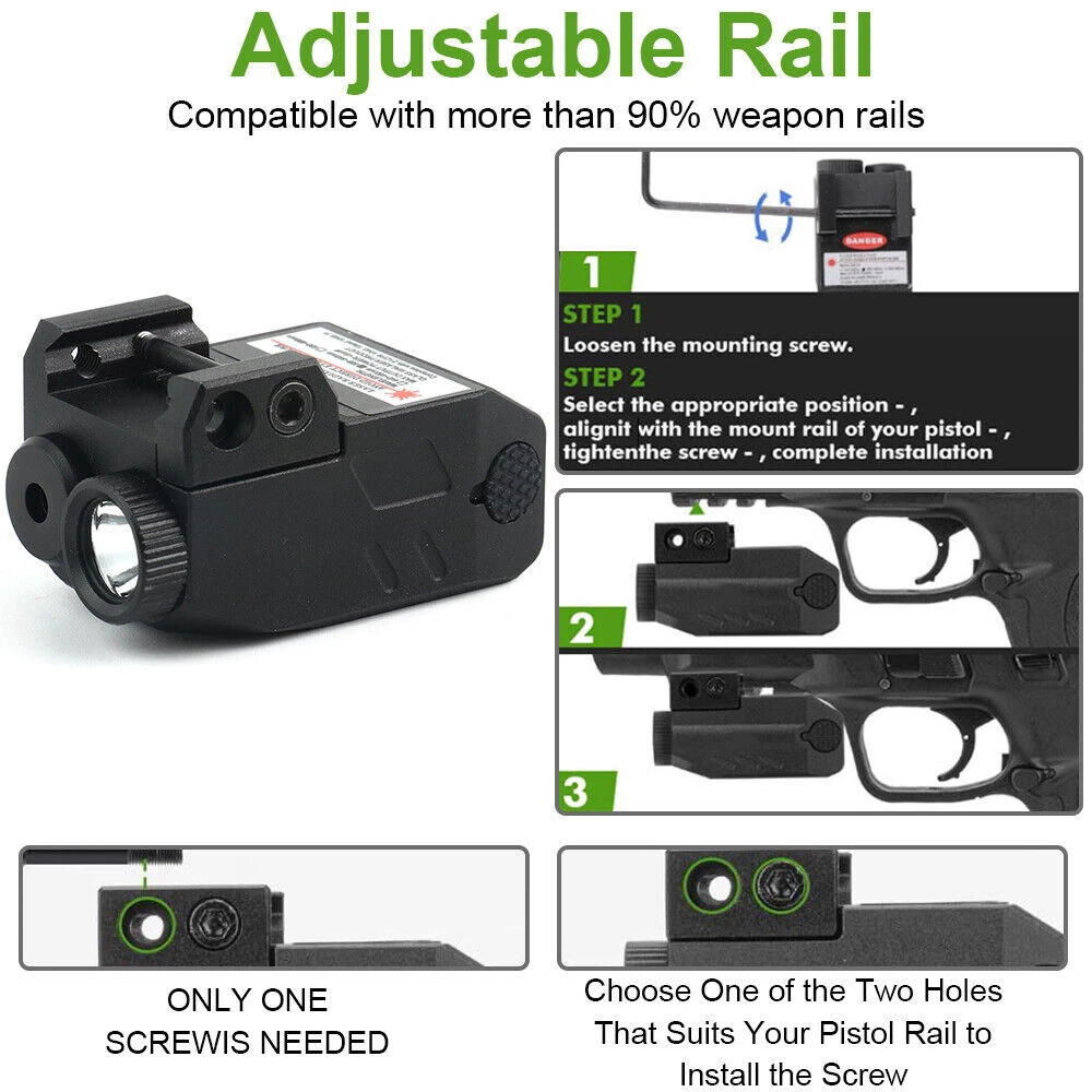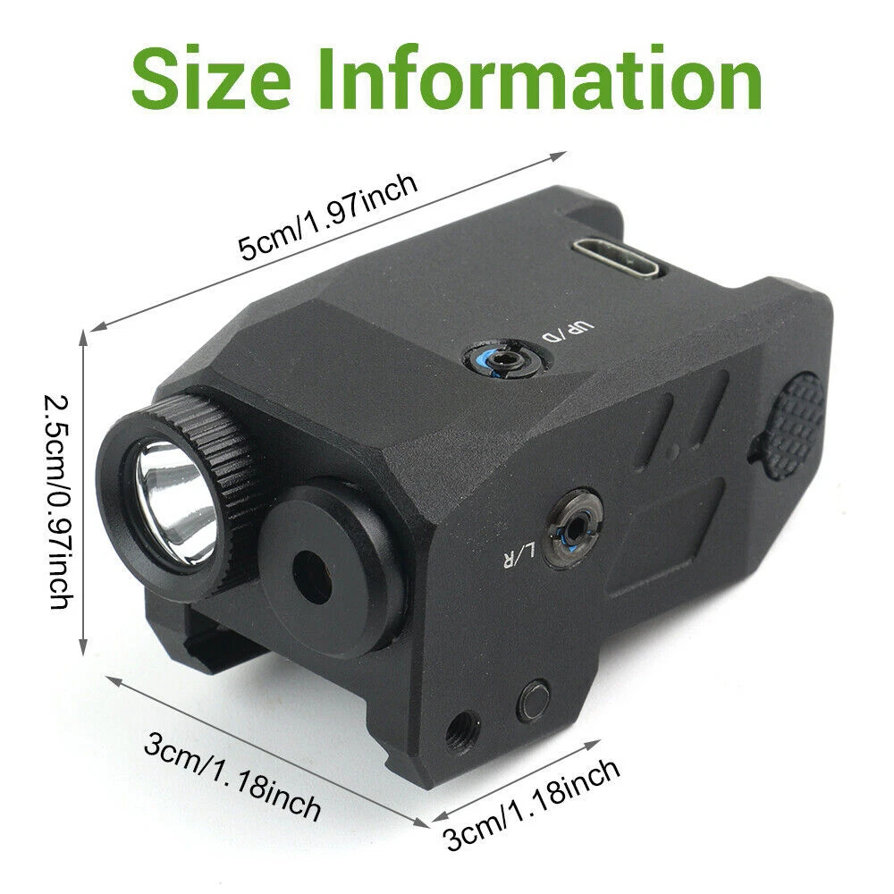 SPECIFICATION Lumen: 300LM Lighting range: 150 meters Laser wavelength: 650nm Endurance time: Laser + lighting at the same time, battery life: 45 minutes; Working time only with lighting: 60 minutes, Working time with laser only: 4 hours Battery capacity: 300mAh Battery: built-in lithium battery Charging time: 50 minutes, the charging indicator is red and fully charged green Lighting mode: strong light, flash Suitable for rails: suitable for 20-21mm Picatinny rails Size: length: 5cm, width: 2.99cm, height: 2cm Weight: 75g FEATURES 【Huge Performance】 - Extreme bright LED flashlight and laser sight combo. Very bright with such a small size, combining both highly visible green beam and 600 lumens of white light, 200-250m highly visible distance. 【Two Versatile Settings】 - Flashlight includes steady on/strobe modes. Working modes: Steady/Strobe light, Pistol laser Only, Steady/Strobe Flashlight+ Green Laser, Green laser beam can be adjusted vertically and horizontally. The package contains a small wrench, which can be inserted into the hole to adjust the accuracy of the green dot,The green laser light combo is very powerful and can be seen at distances of up to 200 meters! 【FITMENT AND DESIGN】- Lightweight and featuring a quick-release mount feature and tactical bezel. Robust aluminum material makes the green laser beam firm and stable, can with stand strong impacts and vibrations. It will not shake or fall after installation, IPX4 Waterproof and lightweight, it’s a perfect tactical light for, security, or bodyguards. 【Pistol Light Laser Combo】- This versatile pistol light lase for pistol can be mounted on any with a picatinny or weaver rail. Our Flashlight laser sight can be install and removal quickly within few seconds. PACKAGE 1 x laser Flashlight 1 x Charging Cable 2 x Hexagon Wrench 1 x User Manua RETURN For defective or wrong items received : Buyers must report to the Seller within 30 days after received of goods. For defective item, Buyers must send with email of photos indicating the area and condition of defects. Upon acknowledgement by the Seller, the item must be returned within 30 days thereof. Actual postage fee for returning, as well as costs for re-sending the replacement item will be borne by the Seller. For exchange of sizes : We may accept exchange of sizes subject to our stock availability. If accepted, the Buyers must return the item at their own expenses No exchanges or returns will be accepted for any reasons other than the above SHIPMENT Please complete your delivery address with contact phone number, especially Russia buyer, please confirm your full name. Please make sure the delivery address is correct before payment. Products will be shipped out within 3 working days after payment confirmation. We are not responsible for any customs tax or import tax. We are sincerely sorry if you do not receive your items in the limited time, please contact us first. We will handle it together with you to get your satisfaction again. CASE & FEEDBACK We highly respect customers' advice, praise and complaints, absorbing every useful information to get a better product supplying. When you are satisfied with products and service, please leave positive feedback, we will slove it for you asap. If you have any problem regarding your transaction, please contact us first. We will try our best to meet your satisfaction rather than getting a poor feedback from you. Any problems,please do not hesitate to contact us at first time before we always try our best to solve it for you!