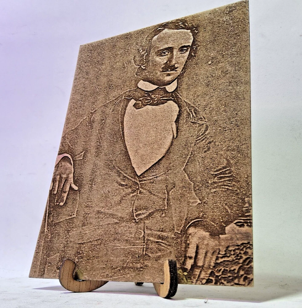 Laser engraved Edgar Allen Poe textured 3d portrait mdf board 6x8 writer raven author soldier american history horror suspense Hard to tell from but it has some nice texture to it. Like a slight 3d effect. Comes with custom laser cut stand. 6x8. 1/8" made for laser mdf board Quite a bit of work goes into making my laser cut/engraved art. I come up with most of art/shapes,draw them out,edit colors,sizes, transfer files to multiple formats,paint,assemble,etc. Lots of steps to get some fine off the wall pieces. From tablet,to you. I have this design as an art guitar as well in listings. Or will be uploading soon. Can give bundle deal for multiple pieces. Not entertaining custom pieces at this moment. ***Treasure Suite offers you many pieces of my art prints now*** ###This section is for laser cut sublimation prints of my digital art. Measurements vary by piece. ### *Welcome to my unique collection of digital art, where creativity meets craftsmanship! Each piece in this category features my original digital designs, heat pressed into vibrant sublimation prints on laser cut whiteboard material. Some are engraved then hand painted. These art pieces are not just decorations, they are collectibles that bring a touch of gothic, rock and roll, horror, pin-up, and lowbrow art into your space. *perfect for:* *man cave *castle *bungalow *abode *domicile *penthouse *flat *cabin *studio *boutique hotel *yacht *etc *These pieces make fantastic gifts for art enthusiasts and collectors alike. Who doesn't enjoy vibrant digital art of out of this world space huntresses, demon witches, cyberpunk vixen cyborgs, spooky mistresses, hearses, hotrods, and so on? ***May consider custom orders of laser cut or engraved items.***