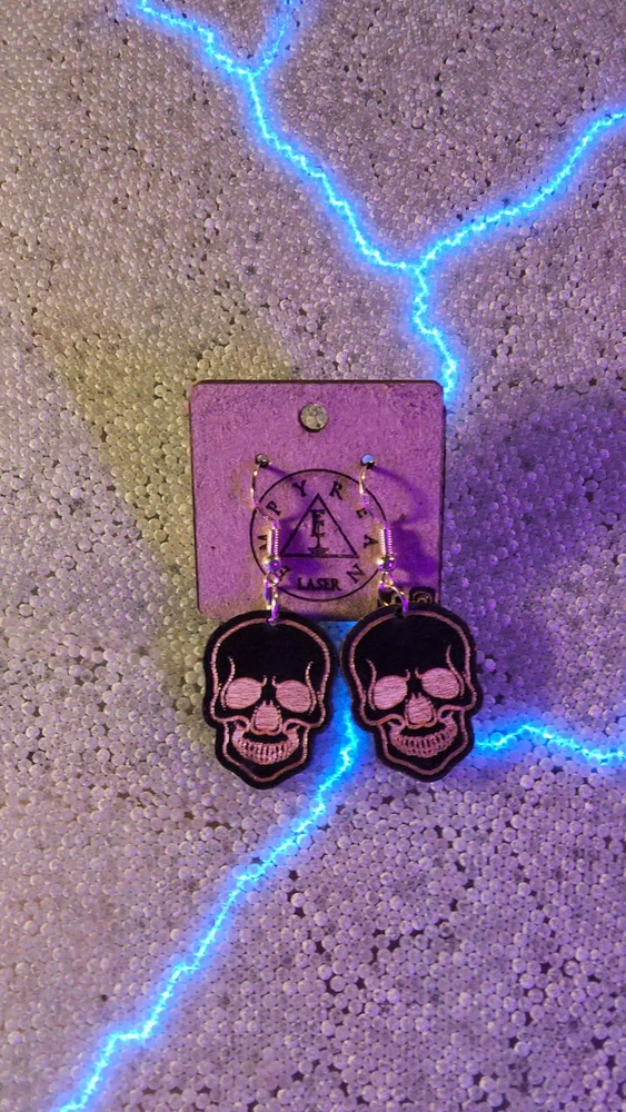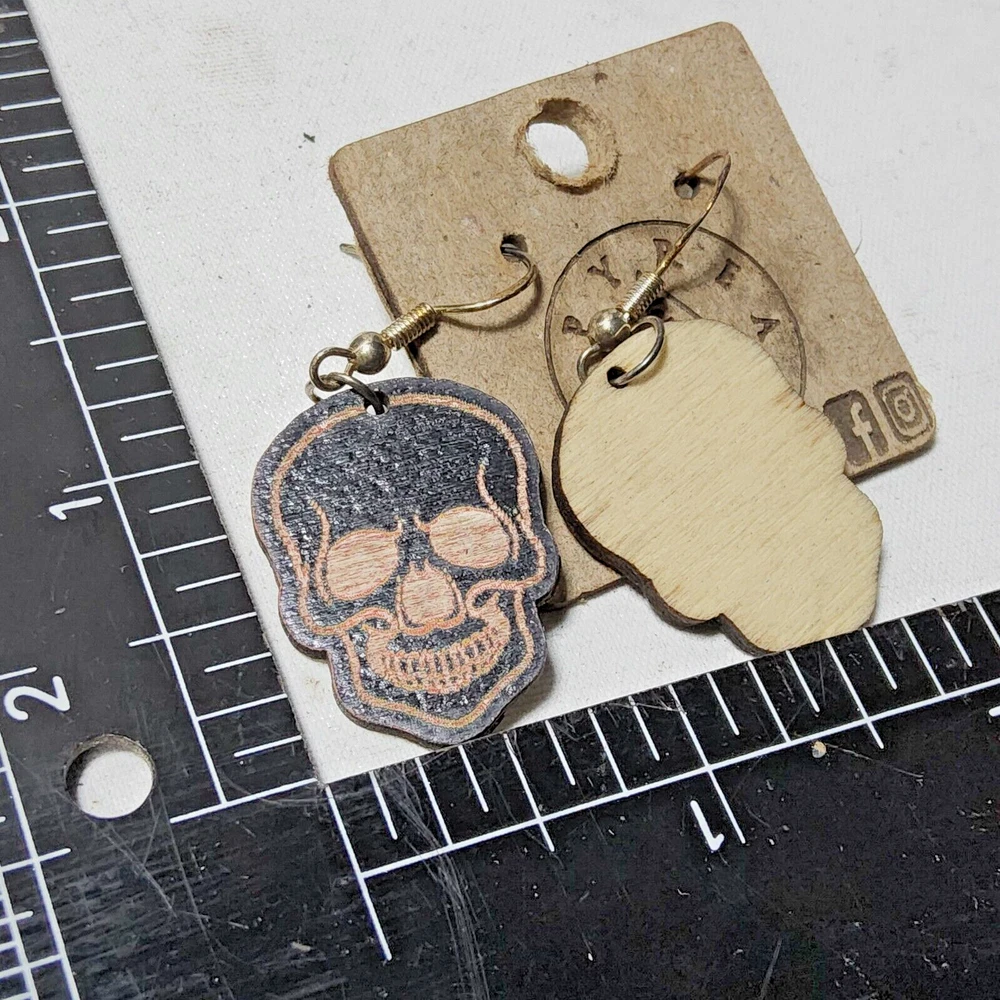Laser engraved cut black skull custom art earrings horror fashion goth halloween Sketched a pic of a black skull on tablet, then transferred design to my laser machine to engrave then cut out earring shapes. Measures 1"h x .75"w x 1/4"d. Loaded with hypoallergenic metal ear hooks. Check out plenty of other lasered creations of mine in shop. Order a few pieces and I'll give you a bundled art deal. Not doing customs at the moment but may be persuaded to fire up the laser for right project. Ebay reselling keeps me busy. Message me to find out. Thanks again for visiting my Ebay shop. ***Treasure Suite offers you many pieces of my art prints now*** ###This section is for laser cut sublimation prints of my digital art. Measurements vary by piece. ### *Welcome to my unique collection of digital art, where creativity meets craftsmanship! Each piece in this category features my original digital designs, heat pressed into vibrant sublimation prints on laser cut whiteboard material. Some are engraved then hand painted. These art pieces are not just decorations, they are collectibles that bring a touch of gothic, rock and roll, horror, pin-up, and lowbrow art into your space. *perfect for:* *man cave *castle *bungalow *abode *domicile *penthouse *flat *cabin *studio *boutique hotel *yacht *etc *These pieces make fantastic gifts for art enthusiasts and collectors alike. Who doesn't enjoy vibrant digital art of out of this world space huntresses, demon witches, cyberpunk vixen cyborgs, spooky mistresses, hearses, hotrods, and so on? ***May consider custom orders of laser cut or engraved items.***