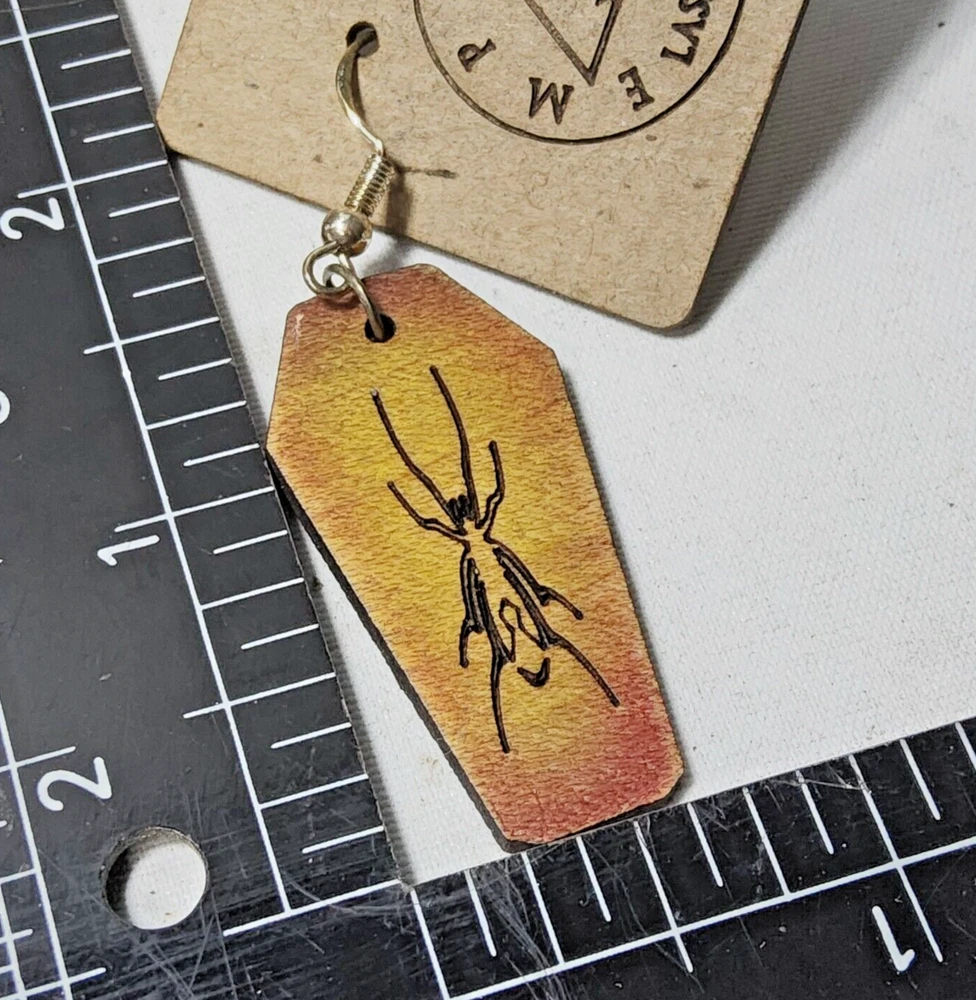 Laser engraved cut coffin spider earrings hallowen custom art horror fashion Based off a coffin spider design i made digitally. Then sent through laser machine. Made on maple. Measures 1.5"h x .75"w x 1/4"d. Loaded with hypoallergenic metal ear hooks. Check out plenty of other lasered creations of mine in shop. Order a few pieces and I'll give you a bundled art deal. Not doing customs at the moment but may be persuaded to fire up the laser for right project. Ebay reselling keeps me busy. Message me to find out. Thanks again for visiting my Ebay shop. ***Treasure Suite offers you many pieces of my art prints now*** ###This section is for laser cut sublimation prints of my digital art. Measurements vary by piece. ### *Welcome to my unique collection of digital art, where creativity meets craftsmanship! Each piece in this category features my original digital designs, heat pressed into vibrant sublimation prints on laser cut whiteboard material. Some are engraved then hand painted. These art pieces are not just decorations, they are collectibles that bring a touch of gothic, rock and roll, horror, pin-up, and lowbrow art into your space. *perfect for:* *man cave *castle *bungalow *abode *domicile *penthouse *flat *cabin *studio *boutique hotel *yacht *etc *These pieces make fantastic gifts for art enthusiasts and collectors alike. Who doesn't enjoy vibrant digital art of out of this world space huntresses, demon witches, cyberpunk vixen cyborgs, spooky mistresses, hearses, hotrods, and so on? ***May consider custom orders of laser cut or engraved items.***