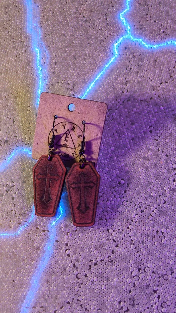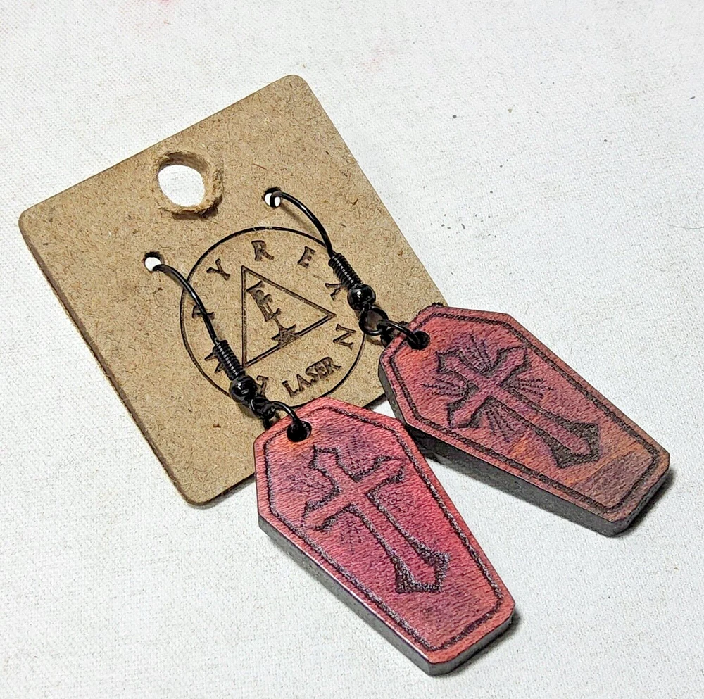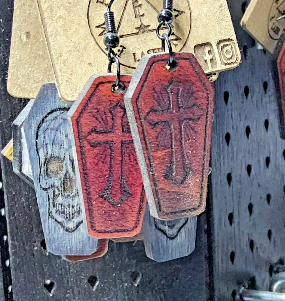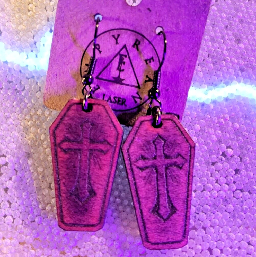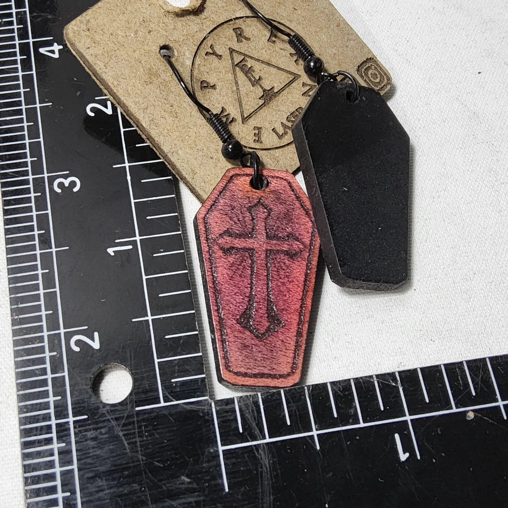 Laser engraved cut crucifix themed earrings hallowen custom art horror fashion ox blood red western coffin Made from one of my ornate crucifix coffin designs on laser cutter/engraver. No 2 are alike, so you will get slight variation from pics. Measures 1.5"h x .75"w x 1/4"d. Loaded with hypoallergenic metal ear hooks. Check out plenty of other lasered creations of mine in shop. Order a few pieces and I'll give you a bundled art deal. Not doing customs at the moment but may be persuaded to fire up the laser for right project. Ebay reselling keeps me busy. Message me to find out. Thanks again for visiting my Ebay shop. ***Treasure Suite offers you many pieces of my art prints now*** ###This section is for laser cut sublimation prints of my digital art. Measurements vary by piece. ### *Welcome to my unique collection of digital art, where creativity meets craftsmanship! Each piece in this category features my original digital designs, heat pressed into vibrant sublimation prints on laser cut whiteboard material. Some are engraved then hand painted. These art pieces are not just decorations, they are collectibles that bring a touch of gothic, rock and roll, horror, pin-up, and lowbrow art into your space. *perfect for:* *man cave *castle *bungalow *abode *domicile *penthouse *flat *cabin *studio *boutique hotel *yacht *etc *These pieces make fantastic gifts for art enthusiasts and collectors alike. Who doesn't enjoy vibrant digital art of out of this world space huntresses, demon witches, cyberpunk vixen cyborgs, spooky mistresses, hearses, hotrods, and so on? ***May consider custom orders of laser cut or engraved items.***