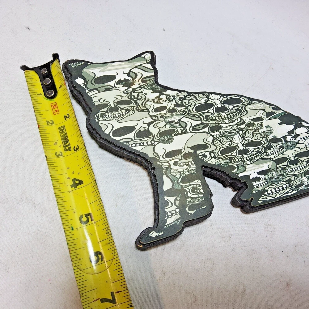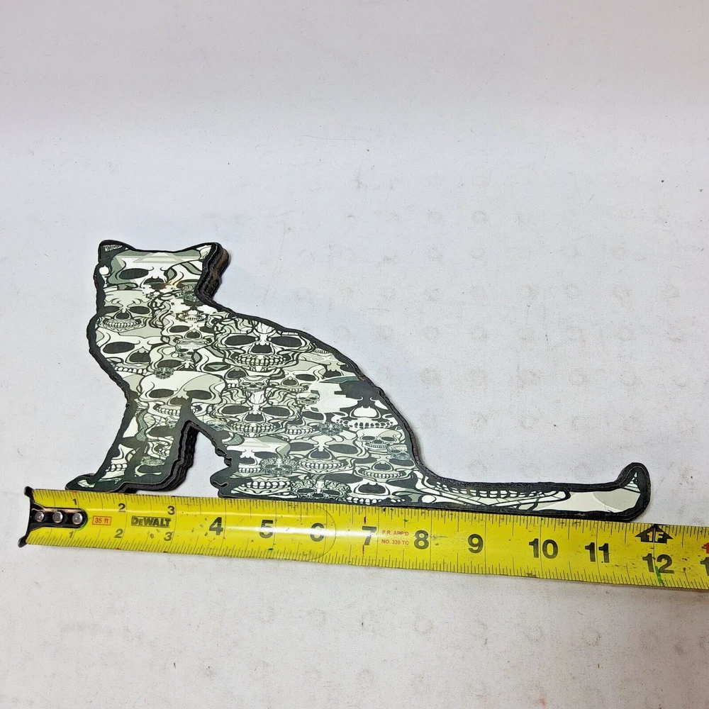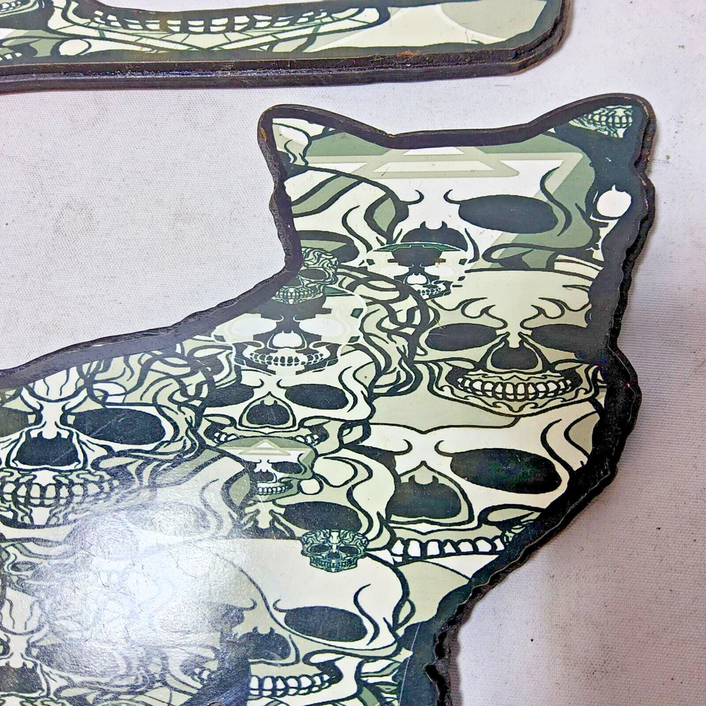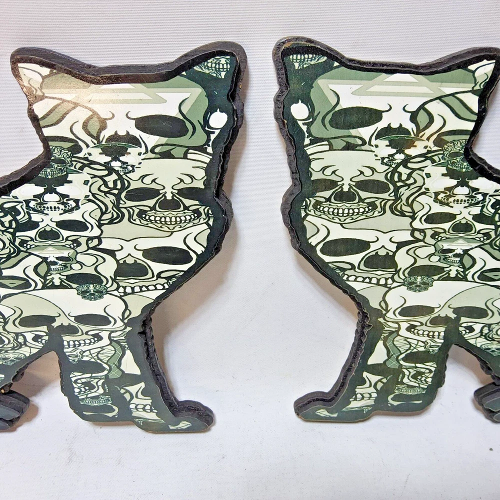 Lasercut digital art twin skulls cats 6x12 magnetic wood prints kitties by me My design. Silhouettes of twin mirrored cats with an army of many different skulls floating within them. All cut on my laser machine and sublimation printed by me in house. 1 has magnet strips on it, I'll affix some on other piece as well before sending out. ***Treasure Suite offers you many pieces of my art prints now*** ###This section is for laser cut sublimation prints of my digital art. Measurements vary by piece. ### *Welcome to my unique collection of digital art, where creativity meets craftsmanship! Each piece in this category features my original digital designs, heat pressed into vibrant sublimation prints on laser cut whiteboard material. Some are engraved then hand painted. These art pieces are not just decorations, they are collectibles that bring a touch of gothic, rock and roll, horror, pin-up, and lowbrow art into your space. *perfect for:* *man cave *castle *bungalow *abode *domicile *penthouse *flat *cabin *studio *boutique hotel *yacht *etc *These pieces make fantastic gifts for art enthusiasts and collectors alike. Who doesn't enjoy vibrant digital art of out of this world space huntresses, demon witches, cyberpunk vixen cyborgs, spooky mistresses, hearses, hotrods, and so on? ***May consider custom orders of laser cut or engraved items.***
