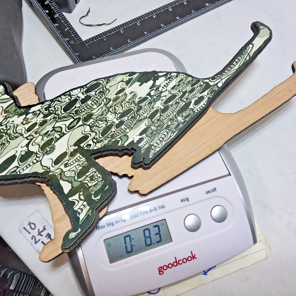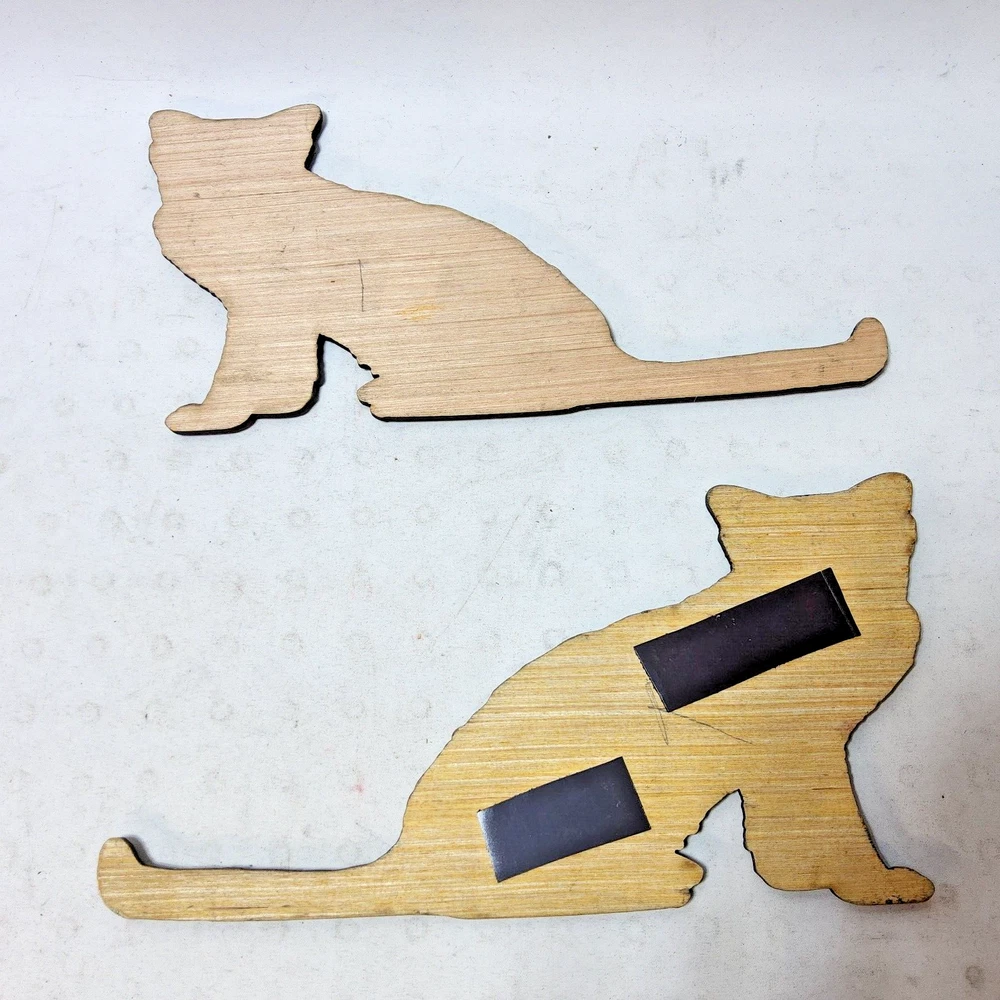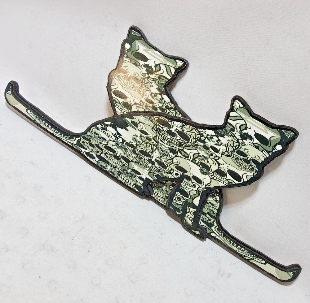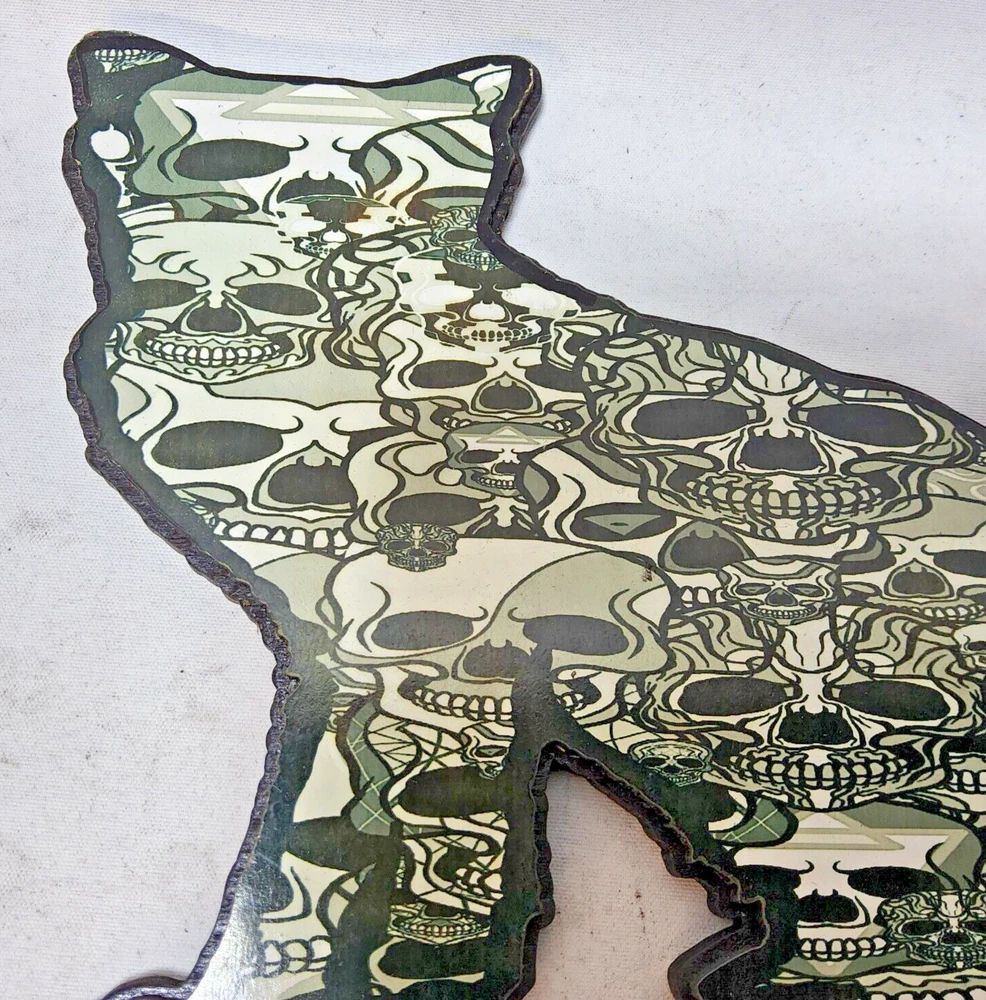 Lasercut digital art twin skulls cats 6x12 magnetic wood prints kitties by me My design. Silhouettes of twin mirrored cats with an army of many different skulls floating within them. All cut on my laser machine and sublimation printed by me in house. 1 has magnet strips on it, I'll affix some on other piece as well before sending out. ***Treasure Suite offers you many pieces of my art prints now*** ###This section is for laser cut sublimation prints of my digital art. Measurements vary by piece. ### *Welcome to my unique collection of digital art, where creativity meets craftsmanship! Each piece in this category features my original digital designs, heat pressed into vibrant sublimation prints on laser cut whiteboard material. Some are engraved then hand painted. These art pieces are not just decorations, they are collectibles that bring a touch of gothic, rock and roll, horror, pin-up, and lowbrow art into your space. *perfect for:* *man cave *castle *bungalow *abode *domicile *penthouse *flat *cabin *studio *boutique hotel *yacht *etc *These pieces make fantastic gifts for art enthusiasts and collectors alike. Who doesn't enjoy vibrant digital art of out of this world space huntresses, demon witches, cyberpunk vixen cyborgs, spooky mistresses, hearses, hotrods, and so on? ***May consider custom orders of laser cut or engraved items.***