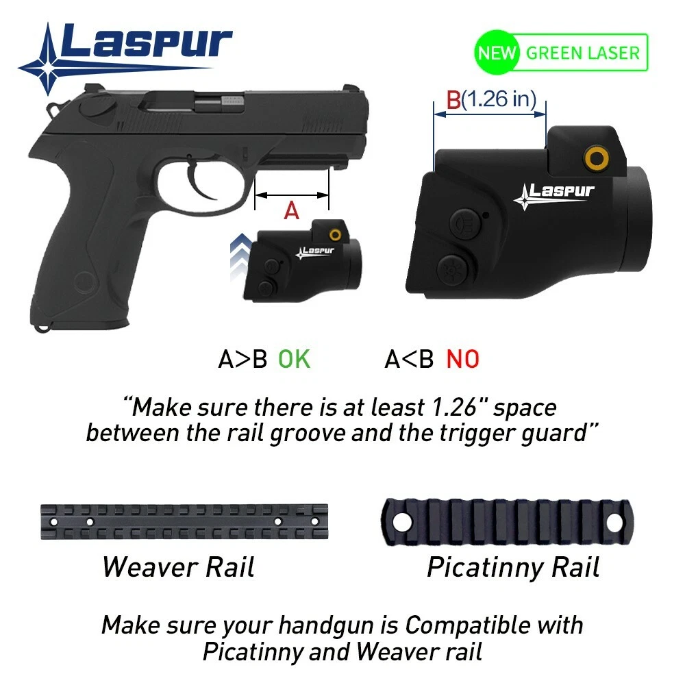 FEATURES ★ Low profile, Ultra-lightweight, compact, and tough design , Stable and adjustable. Low profile. Tactical laser light combo with INTERNAL GREEN LASER emitted from LED Cup. Offers the brightest green laser allowed by Law. Four running mode: Green Laser only\ gun light only\Green Laser and Light Combo\strobe . It gives you more choices. ★ Smart switch design. Ambidextrous momentary/ steady On-Off switch Controls activation from either side of the unit; One handed snap-on and tighten interface for safe and quick mounting. Long press the switch to change the working mode. ★ Two Rail Locating Keys have four installation sizes. It holds to fit more pistols, Will not loosen due to vibration. The light fits onto virtually any firearm with a modern (M1913 Pica tinny or Weaver-style) accessory rail. Fit rail- equipped pistols, handgun. it will easily accommodate most universal holsters. ★ Build-in battery with magnetic USB charging port. Super convenient USB Magnetic Contact Charging, which solves the problem that the existing USB plug can’t access the USB interface in night or dim light environment. Magnetic recharging allows you to conveniently keep the product mounted to the gun while charging. The battery indicator can prompt the remaining power at any time to avoid the inability to use the product due to insufficient battery power. ★ It is fully user-adjustable for Windage and Elevation with the provided tool, You can adjust and zero-in this laser easily. Also, if you don't like the product or if something happens to it please return it for a full refund or a new one! No questions asked! We are real humans in the United States with a real company and a real warranty. OPERATION 1 、 Click the either side Laser On/Off Switch to turn on or turn off the laser. Click the either side LED On/Off Switch to turn on or turn off the LED. 2 、 High-brightness/Medium-brightness/Low-brightness/Extremely low-brightness: : in the LED mode, long press either side LED On/Off Switch ( 0.5s ) to cycle switch the working mode(500lm-300lm-100lm-10lm). 3 、 Power Indicator: every time turn on the device, the power indicator will light up for 5 seconds. Showing the current state of the battery power. 4 、 Power Protection: in the high-brightness(500lm)mode, every time turn on the device, after the brightness of 500lm is maintained for 1 min, it will linearly decrease to the state of medium brightness(300lm) with 2 min. 5 、 Pulse Laser: in any state, double-click the either side Laser On/Off Switch to enter pulse mode, and click either side Lase On-Off Switch again to revert to the state before entering pulse. 6 、 Strobe LED: in any state, double-click the either side LED On/Off Switch to enter strobe mode, and click either side LED On-Off Switch again to revert to the state before entering strobe. 7 、 Memory Function: every time turn on the device, it will revert to the state when it was last closed. 8 、 The device will be automatically turned off during the charging process, and all function cannot be activated. DETAILS ★ Laser output: <5mW, Class 3A ★ Laser wavelength : Green laser 510-532nm ★ Dimension: L x W x H = 2.12” ⅹ 1.12” ⅹ 1.53”(54 ⅹ 28.5 ⅹ 39 mm) ★ Material: Fiber Reinforced Nylon PA66 ★ Weight (net): 1.79ounce (50g) ★ Light : High: 500lm; Mid1: 300lm; Mid2: 100lm; Low: 10lm ★ Working mode: Laser only\ gun light only\Laser and Light Combo\strobe . ★ Type of Bulb: LED ★spot size: 25mm@30m ★ Runtime: a 、 Laser Only: 3h b 、 LED Only: High: 60mins; Mid1:70mins; Mid2: 90mins; Low: 21hrs c 、 Laser LED Combo : High: 55mins; Mid1:65mins; Mid2:85mins; Low: 20hrs ★ Power Source: Battery-powered ★ Battery type: Build-in Rechargeable Battery ★ Item Package Quantity:1 ★ Included Components: · Laser Light Combo · Wrench · Magnetic Charging Cable · Rail Locating Keys · User Manual INSTALLATION REQUIREMENTS INSTALLATION REQUIREMENTS If it meets the following two points, it can fit your pistol: ★ First, It requires a standard accessory rail. Make sure your handgun has it. Compatible with Picatinny and Weaver rail. ★ Second, Make sure at least 1.2" space between the rail groove and the trigger guard . SHIPPING ★ Our standard shipping service is free, your order will be processed within 1-2 business days after your payment. Transit time varies from 2-5 business days. ★ We only ship to the confirmed PayPal address. We reserve the right to cancel any order for any reason at any time. ★ We are not responsible for undeliverable addresses. RETURN POLICIES ★ We offer a 30 day return policy from checkout winning date. ★ An RMA number is required for all returns. Message us for return instructions. Items returned without a RMA number will not be processed. ★ Items defective upon receipt must be packaged in their retail packaging as if new and returned with a detailed description of the problem. We are unable to accept any items that have been used as well as any food items. ★ We reserve the right to decline any returns if the above guidelines are not followed. FEEDBACK ★ We will leave feedback for you as soon as we receive your payment. COMMUNICATION ★ If you have a problem or question regarding your item, please contact us before leaving any type of feedback. We will work with you to resolve any problems you may have. ADDITIONAL INFORMATION ★ Direct viewing of the laser is hazardous to the eyes. ★ Never look directly into the laser beam. ★ Never point laser beam at person. ★ Do not allow children to use laser sight