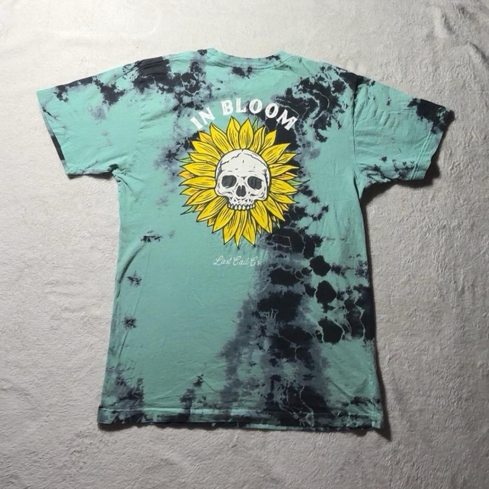 The Last Call Co "In Bloom" Skull Sunflower Blue Black Tie Dye T-Shirt in men's size M is a stylish and unique addition to any wardrobe. Featuring a crew neck and short sleeves, this lightweight knit shirt is perfect for the summer, fall, and spring seasons. The tie-dye pattern and distressed accents give it a trendy and edgy look, while the multicolor design adds a fun and vibrant touch. This regular fit shirt is machine washable and made from comfortable cotton material, making it a versatile and practical choice for casual wear. Has a small white white spot.