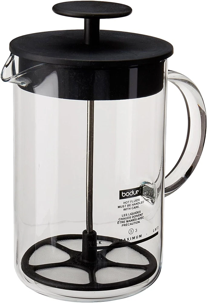 Milk frother manual milk frother creates an airy foam in less that 30 seconds for a Cafe style Coffee you will love from the Comfort of your own home Glass carafe made of durable heat-resistant borosilicate glass Warm milk in the microwave after frothing Quick and easy beat the milk by moving plunger frother up and down about 60-90 times or until you feel milk getting thicker Durable design milk frother features a silk plastic lid with a deep rim to prevent foam from escaping the spout and a plunger handle that is comfortable to grip Servings frother holds 8 ounces of cold milk dishwasher safe The BODUM range line was complemented with these fantastic milk frothers. The silk plastic lid has a deep rim to prevent foam from escaping through the spout. The plunger handle has a comfortable grip and is pleasant and smooth to touch. In less than 30 seconds you can easily whip your preheated milk into the airy foam, only a BODUM milk frother can give you. After you have served your guests, you can put every part of the milk frother into the dishwasher. Instructions: 1) Fill the frother to the line (approximately 8-10 ounces) with COLD Milk (Non Fat or Regular). 2)Place the jug onto a flat surface. 3)Place the lid with the whip onto the jug. Close the pouring outlet. 4)Beat the milk by moving the plunging frother up and down. Plunge the milk about 60-90 times (you will feel the milk getting thicker). Allow the milk to rest for about 1 minute. The froth will thicken significantly during this time. If you would like warm froth, microwave on high for 30 to 50 seconds. (Be sure to remove the plunger assembly before placing the jug in the microwave) 5)Spoon the milk froth out of your frother and onto your coffee. To achieve the best froth we recommend using cold, non-fat, or low-fat milk. Enjoy.